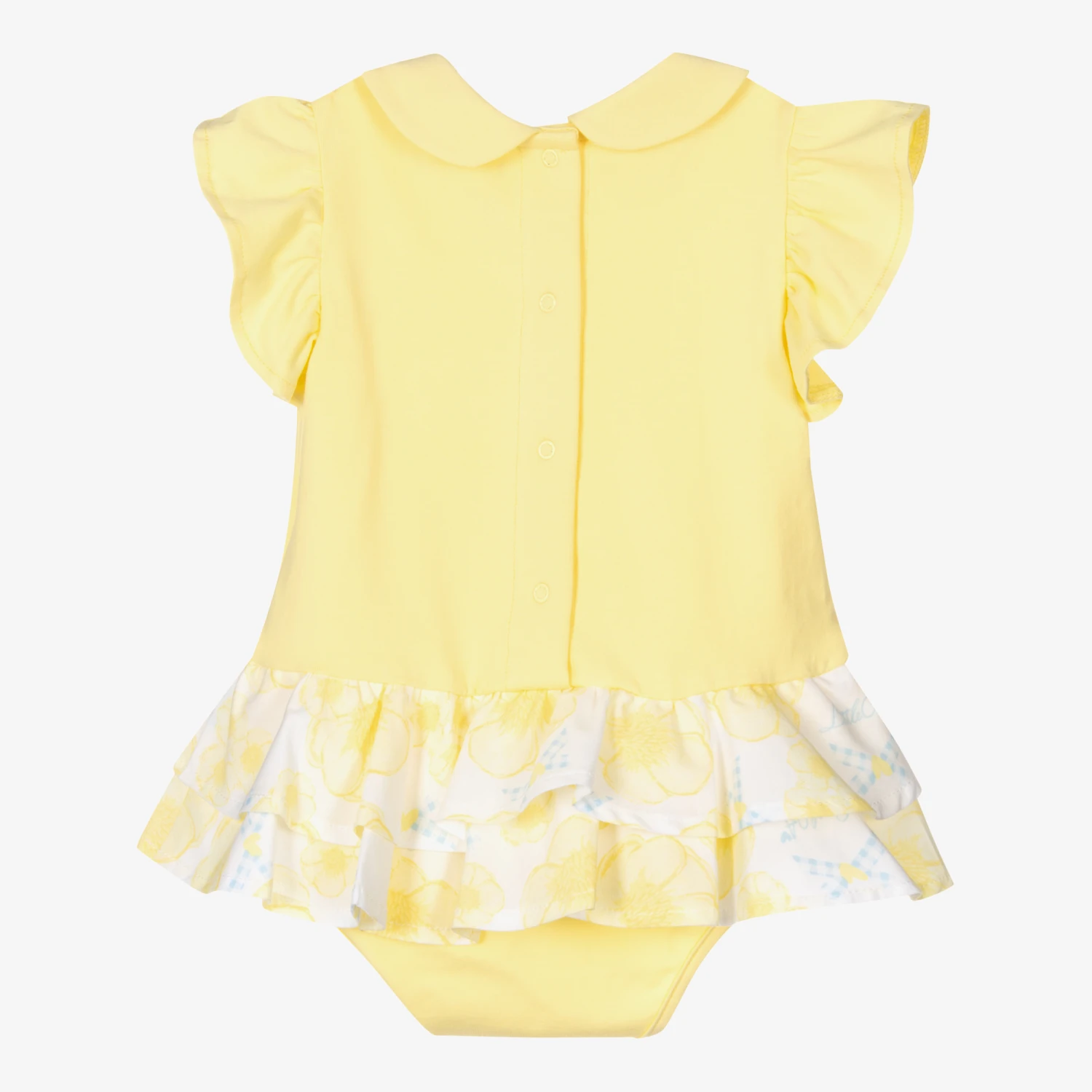 Pale yellow dress for baby girls by A Dee, made in soft and stretchy cotton jersey. The skirt is made of soft cotton poplin with a white and yellow floral pattern. The bodice has a large bow print with sparkling diamanté trims and logo. There is a sweet round collar, ruffled sleeves and popper fastenings on the back. It has integrated knickers with poppers fastenings.