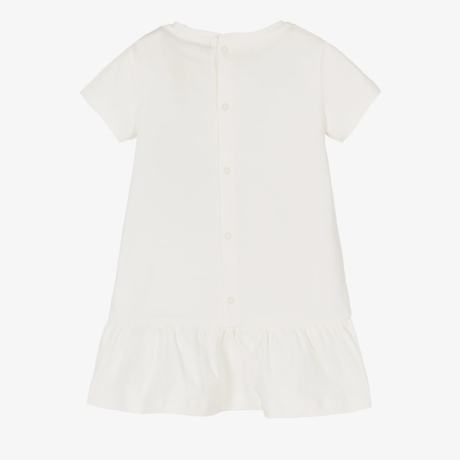 Ivory cotton dress for baby girls by AIGNER, made in comfortable jersey. It has a pink and grey crossbody bag print, with a gold chain bearing the brand’s signature ‘A’ horseshoe logo charms. The dress is drop-waisted with a gathered skirt and has easy-to-use popper fastenings around the back.