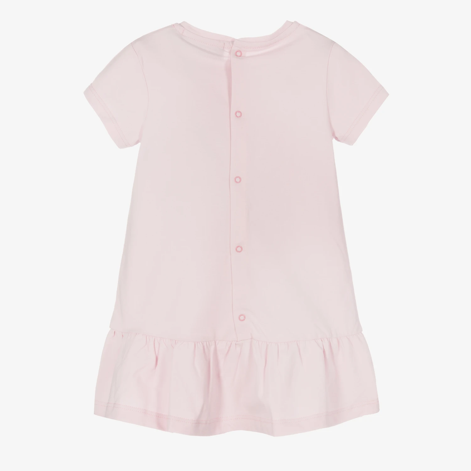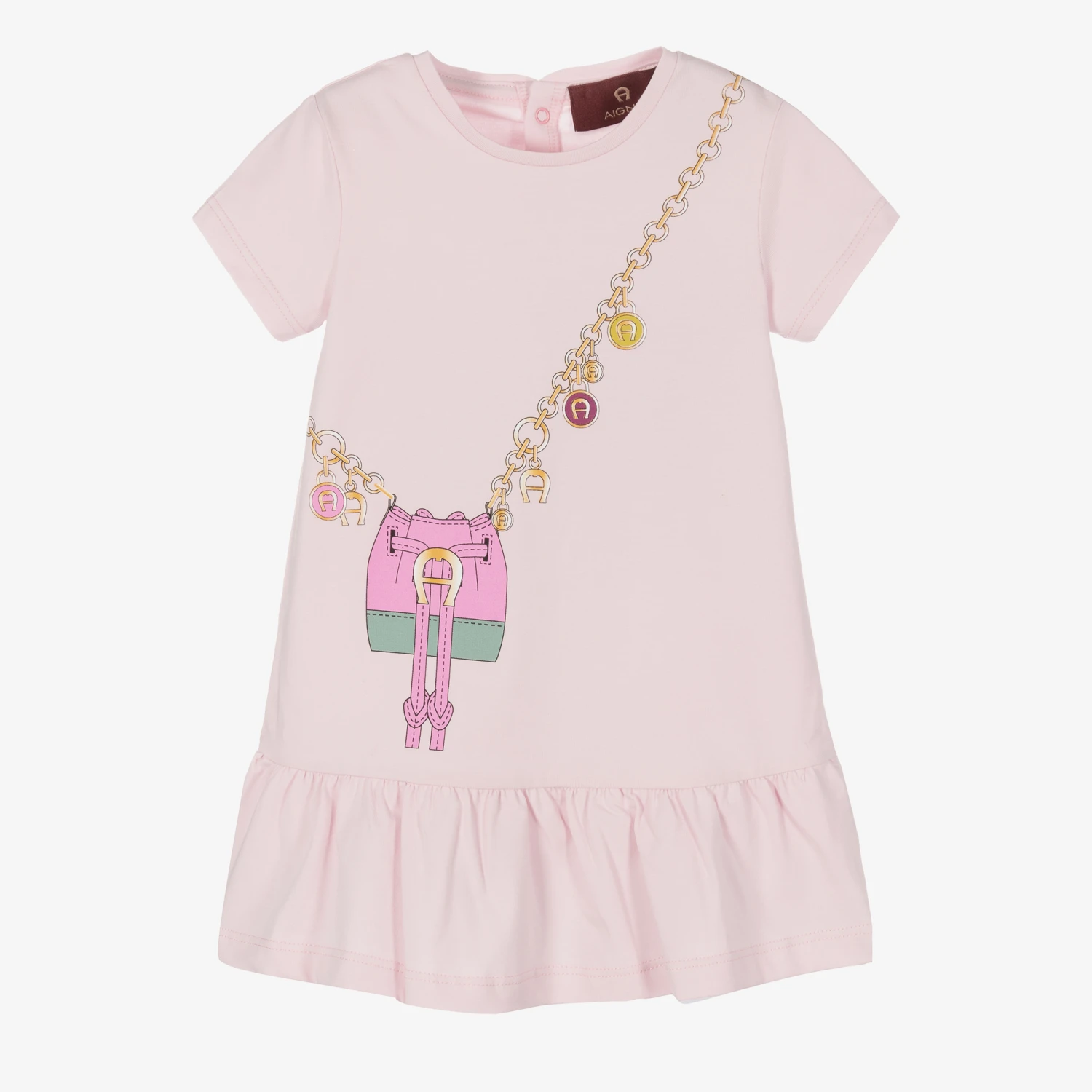 Pale pink cotton dress for baby girls by AIGNER, made in comfortable jersey. It has a pink and grey crossbody bag print, with a gold chain bearing the brand’s signature ‘A’ horseshoe logo charms. The dress is drop-waisted with a gathered skirt and has easy-to-use popper fastenings around the back.