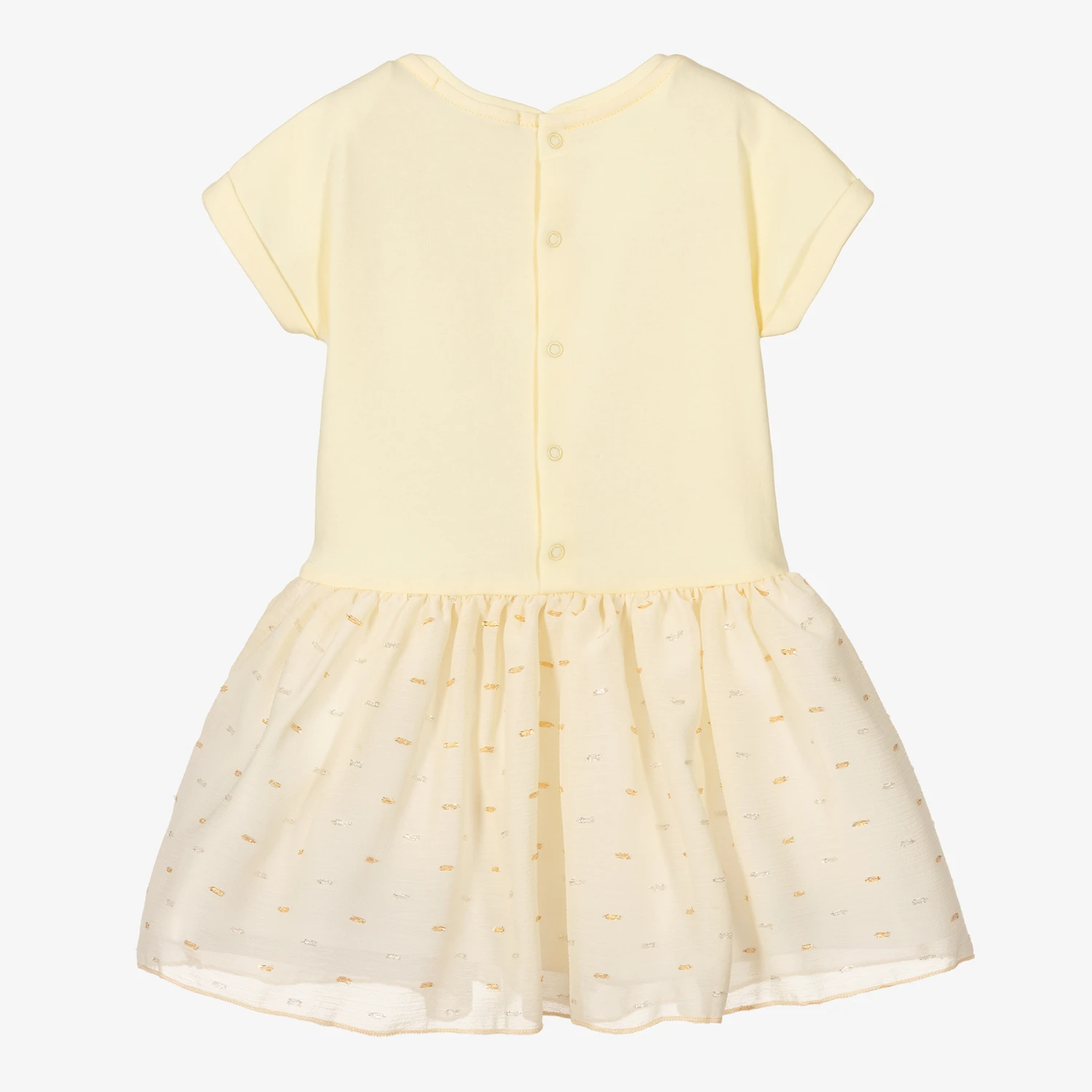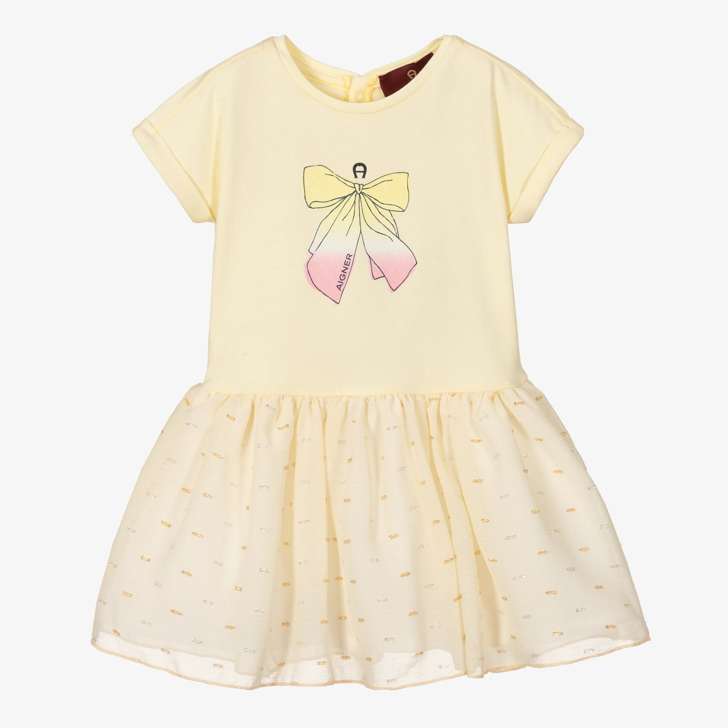 Pale yellow dress for baby girls by AIGNER, made in comfortable cotton and lightweight chiffon. The jersey bodice has a yellow and pink logo bow print, with seamless, turn-up sleeves. The chiffon skirt shimmers with gold and silver plumetis and is lined in cotton voile for comfort. It fastens on the back with easy-to-use poppers.