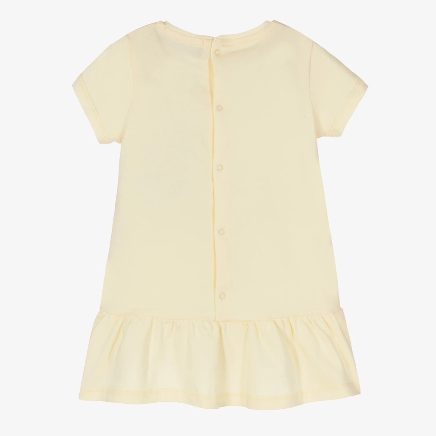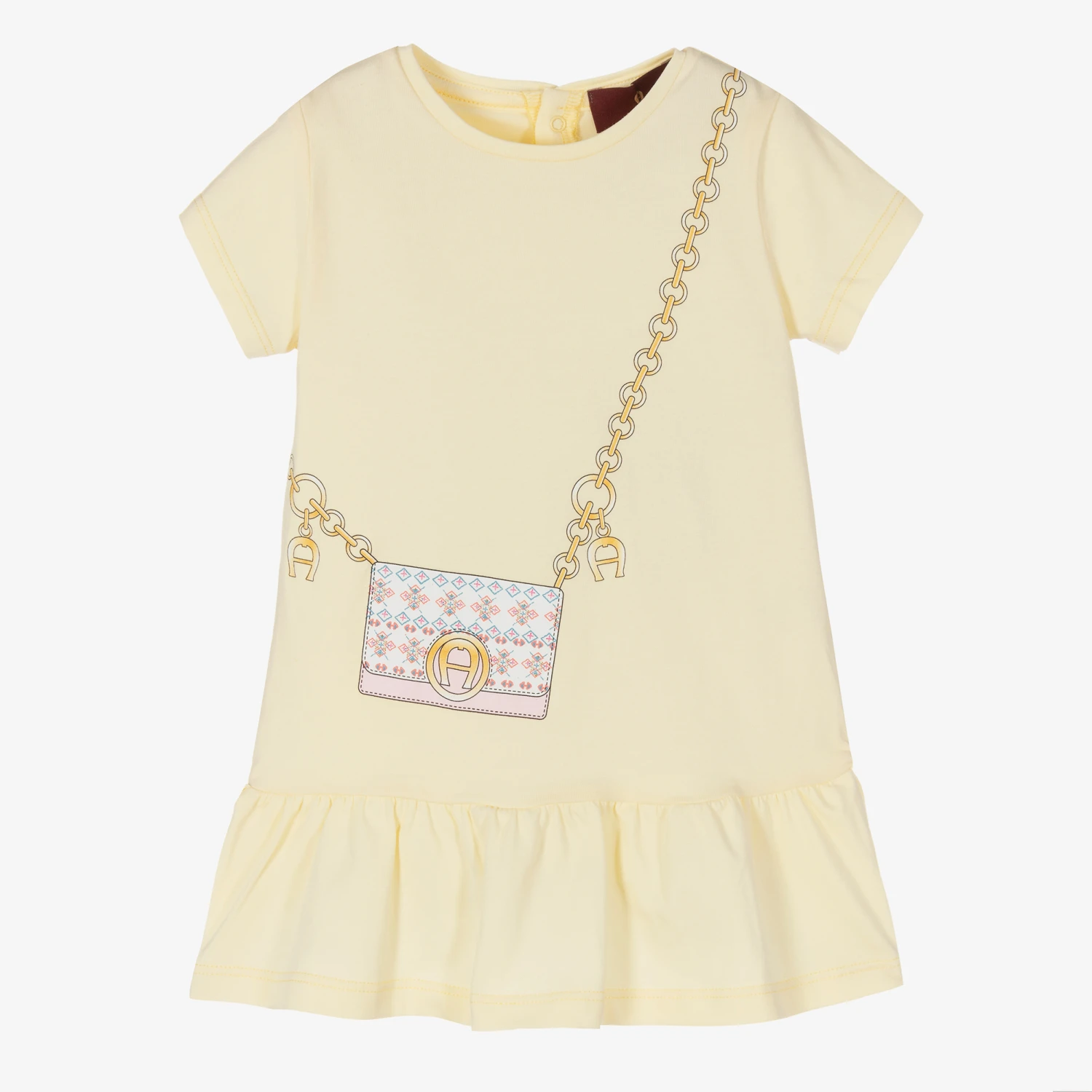 Pale yellow cotton dress for baby girls by AIGNER, made in comfortable jersey. It has a white and pink crossbody bag print, with a gold chain bearing the brand’s signature ‘A’ horseshoe logo charms. The dress is drop-waisted with a gathered skirt and has easy-to-use popper fastenings around the back.