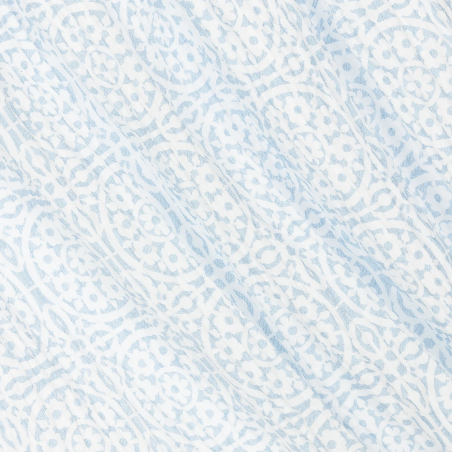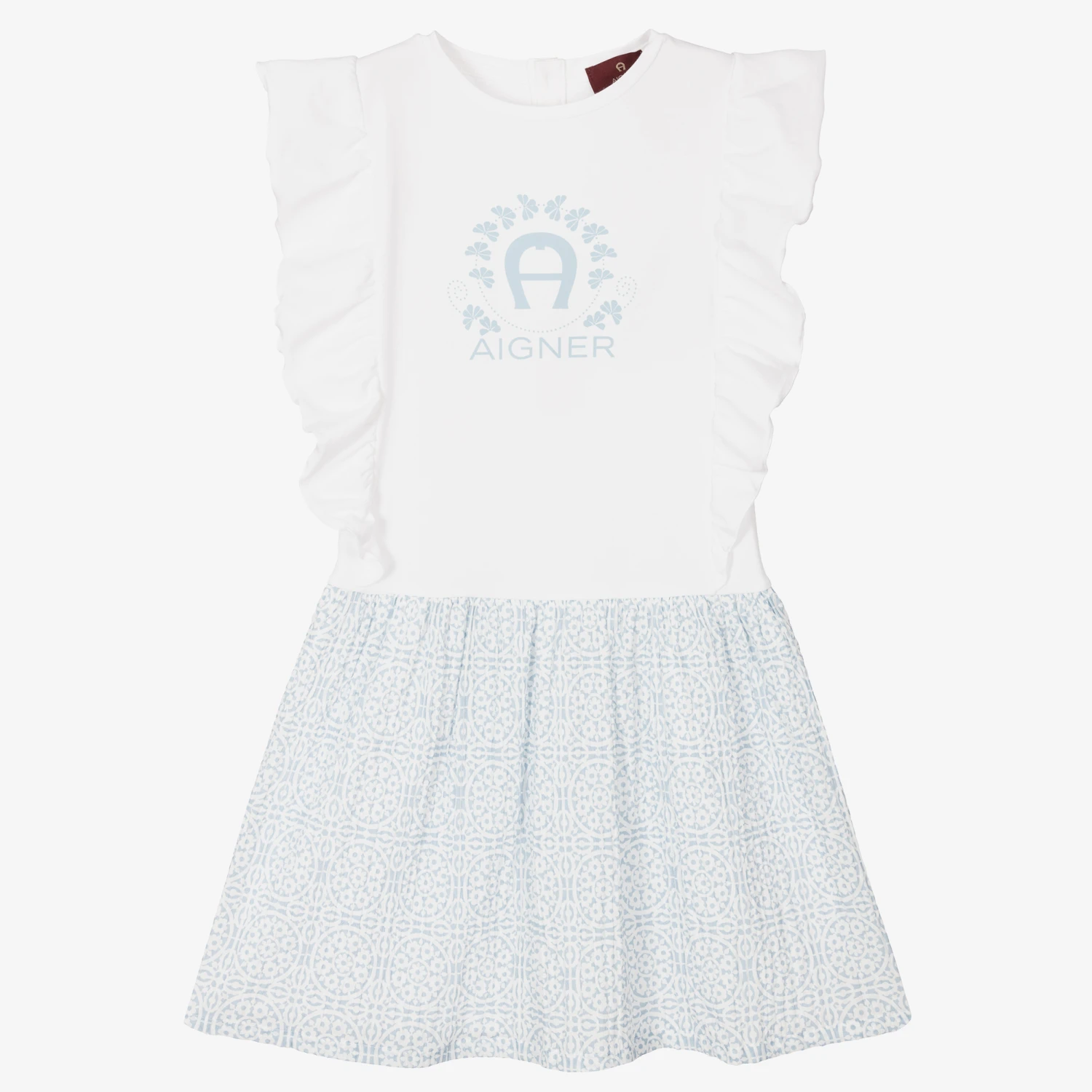 A floaty white and blue cotton dress for teen girls by AIGNER, made in soft jersey, with the brand’s signature ‘A’ horseshoe logo print on the front. The bodice has feminine ruffles down the sides, adding an element of texture. Woven with a crinkle effect, the skirt has circular floral pattern and a lightweight lining. The dress fastens easily with buttons on the back.
