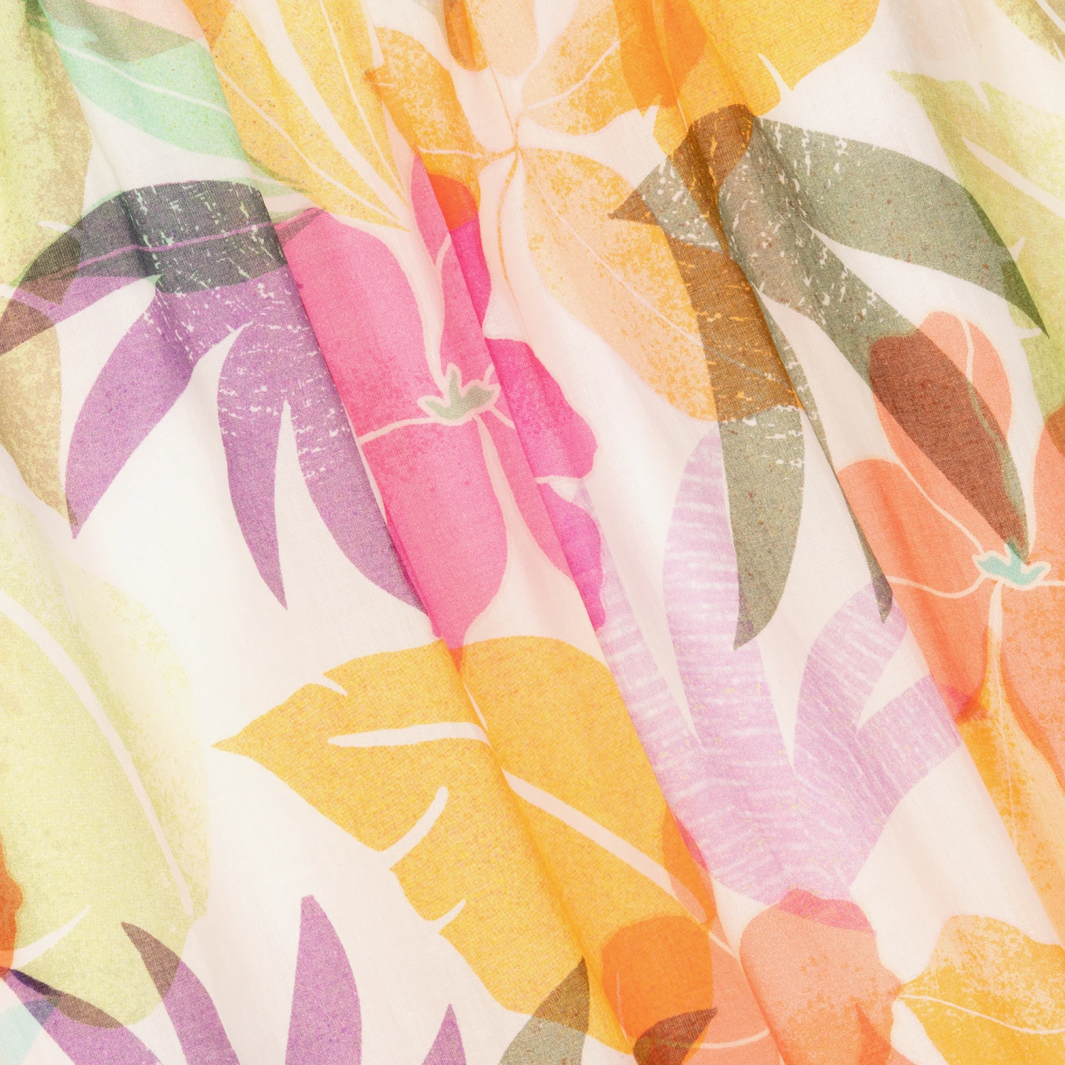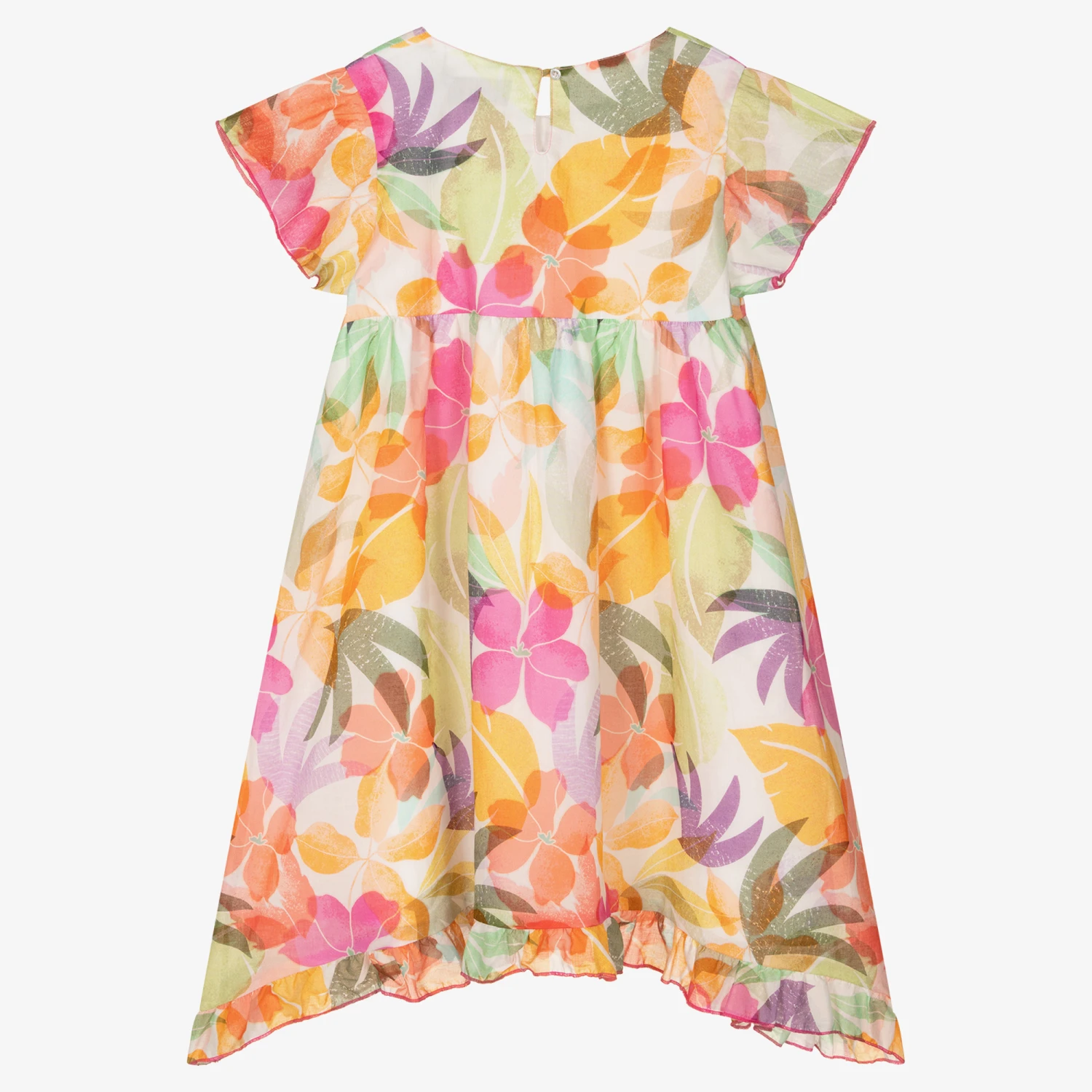 Beautifully soft and lightweight, a floral voile dress for teen girls by German brand AIGNER, in shades of pink, orange and green. Made and lined in breathable cotton for comfort, this pretty style has flutter sleeves, a ruffled hem on the gathered skirt and a keyhole logo button fastening around the back. The brand’s signature ‘A’ horseshoe logo is embroidered in pink on the bodice with watercolour-inspired circles for a designer finish.