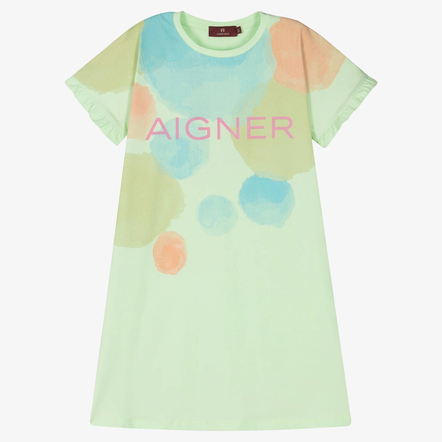 From AIGNER, green dress for teen girls with a large logo print in soft blue, orange, and green circles. With seamless, frill-trimmed sleeves for a feminine finish and made in cotton jersey, it is stylish and comfortable.