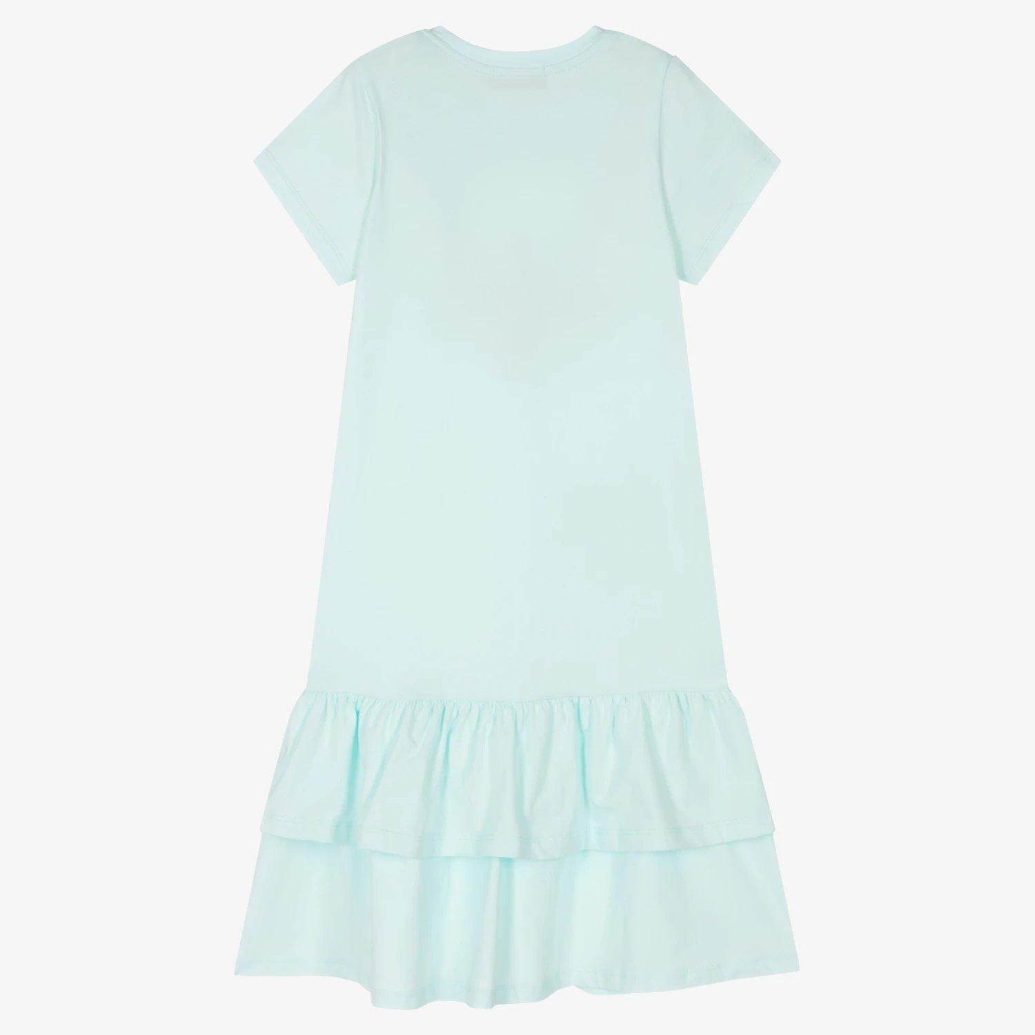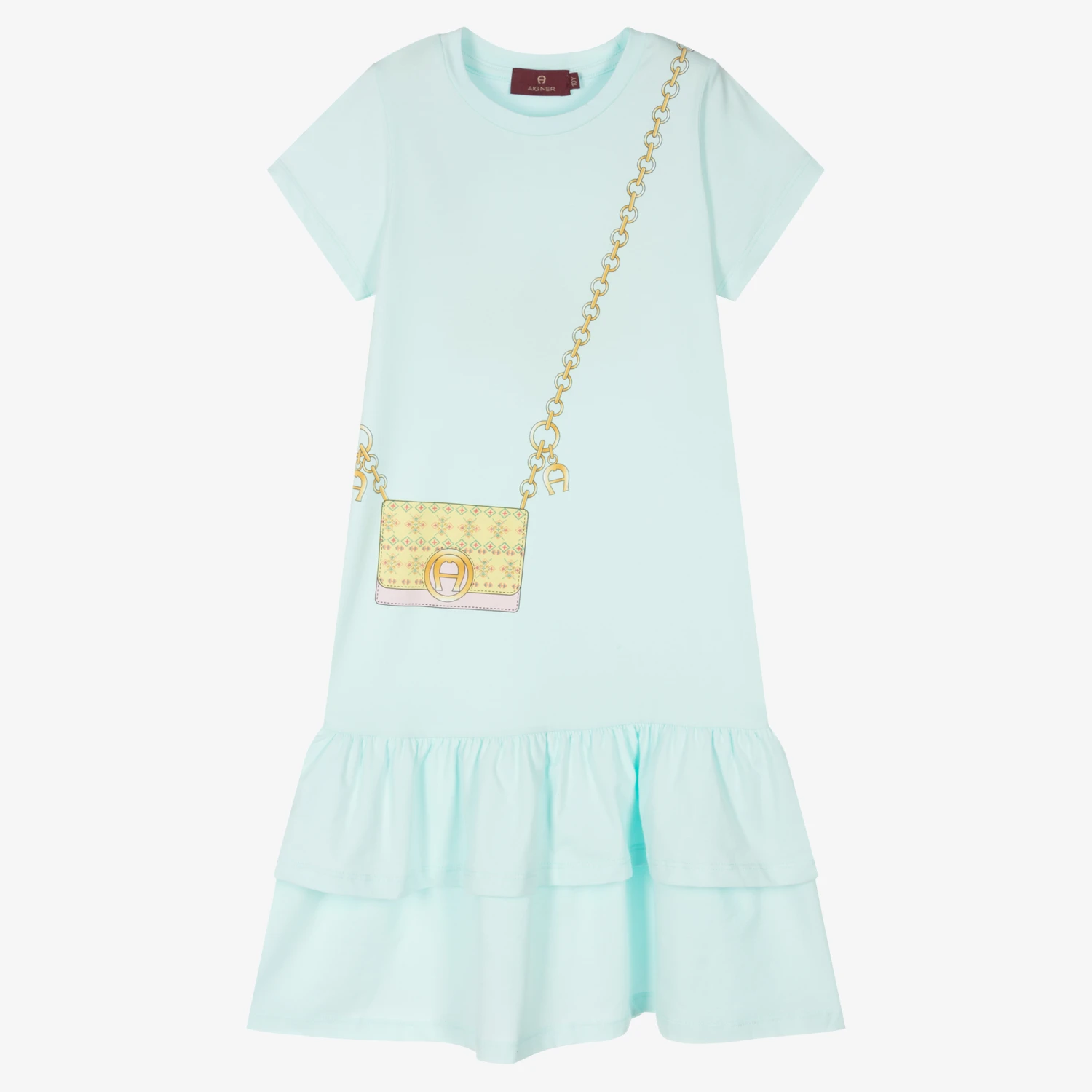 Instantly recognisable as AIGNER, green dress for teen girls with a crossbody bag print incorporating the brand’s signature ‘A’ horseshoe logo. With a drop-waist and gathered frill skirt, it has a feminine silhouette whilst the soft cotton jersey is comfortable.