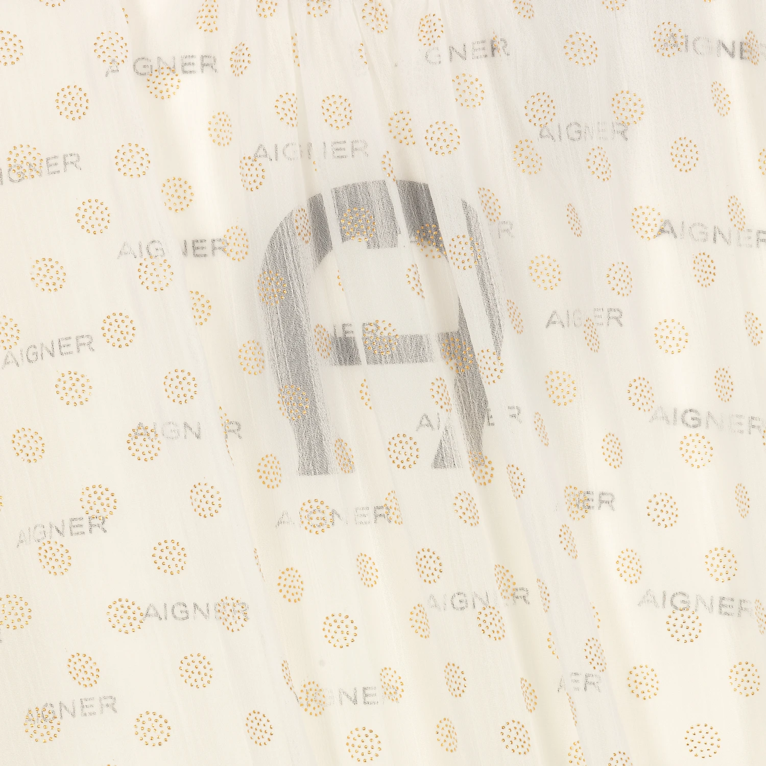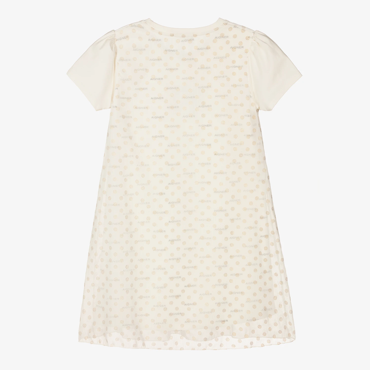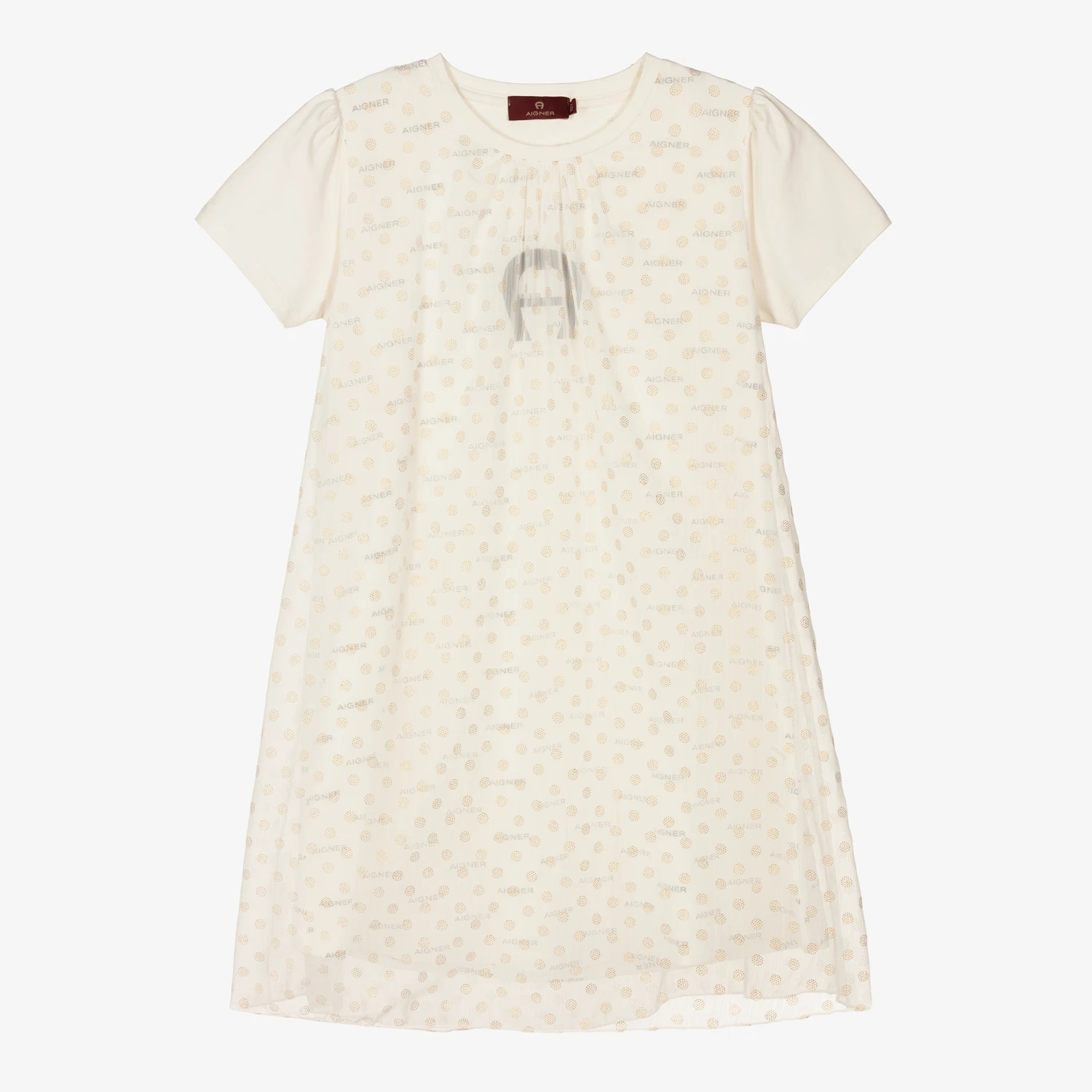 Easy wearing ivory chiffon and jersey dress for teen girls by AIGNER. The white chiffon overlay is patterned with shiny gold polka dots. Made in comfortable stretchy jersey, it has pretty puffed sleeves and is printed with black logos. The brand’s large signature ‘A’ horseshoe logo is on the chest.