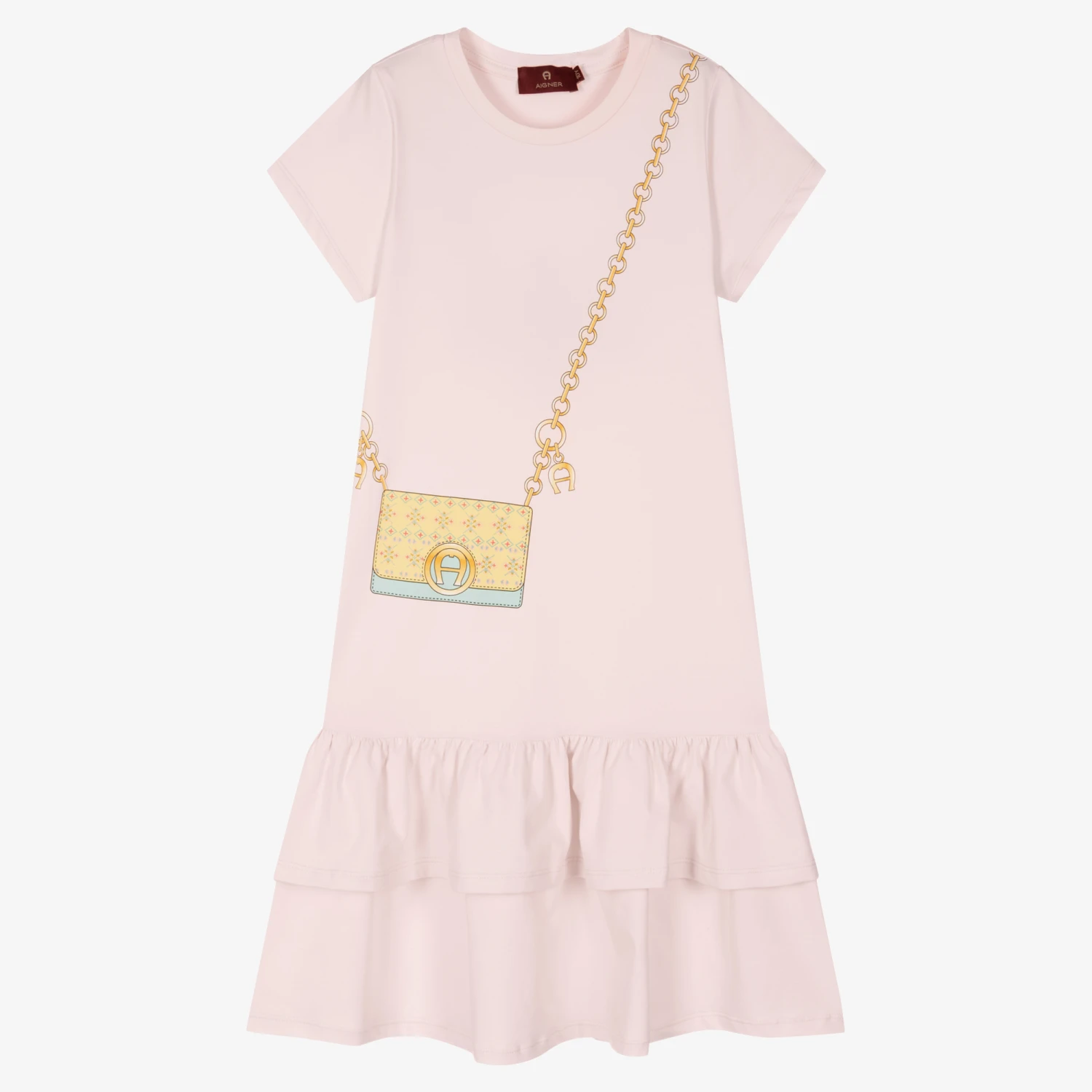 Instantly recognisable as AIGNER, pink dress for teen girls with a crossbody bag print incorporating the brand’s signature ‘A’ horseshoe logo. With a drop-waist and gathered frill skirt, it has a feminine silhouette whilst the soft cotton jersey is comfortable.