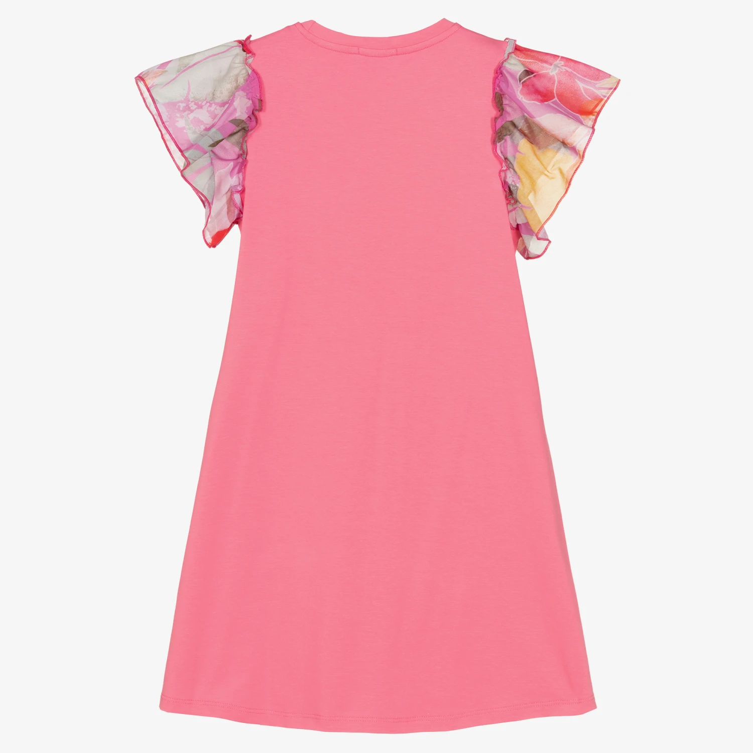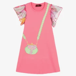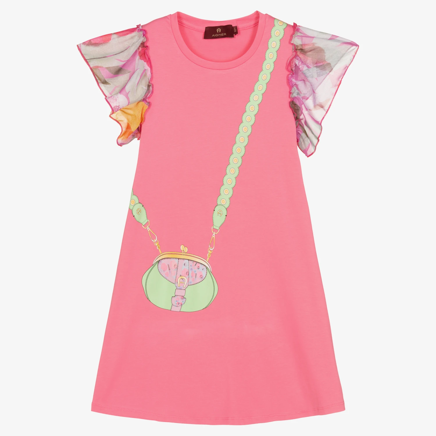 Pretty pink ‘A’ line cotton dress for teen girls by AIGNER, made in comfortable jersey. It has a green and pink crossbody bag print, with the brand’s signature ‘A’ horseshoe logo detailing on the strap and front. The dress has feminine voile flutter sleeves with a colourful floral print. Easy to wear, it simply slips on over the head.