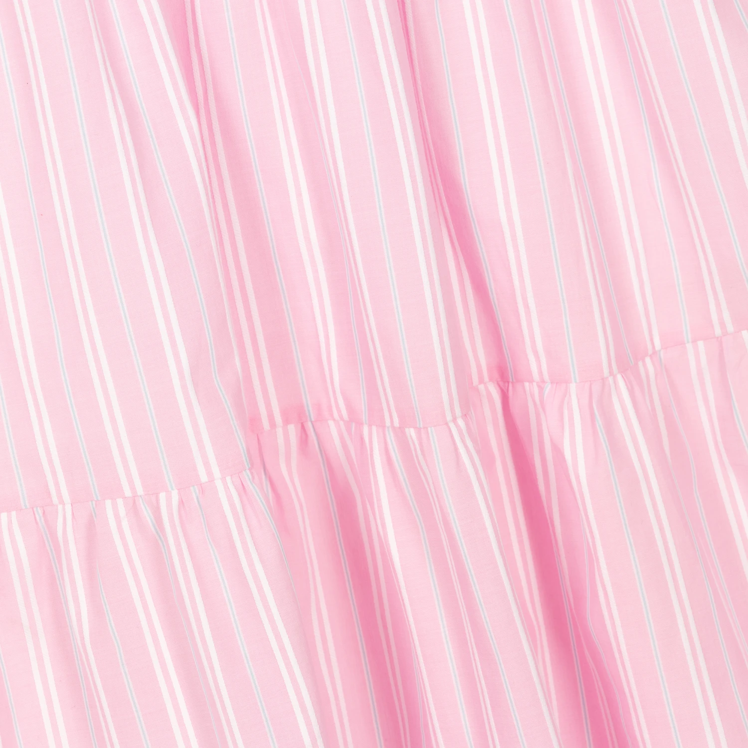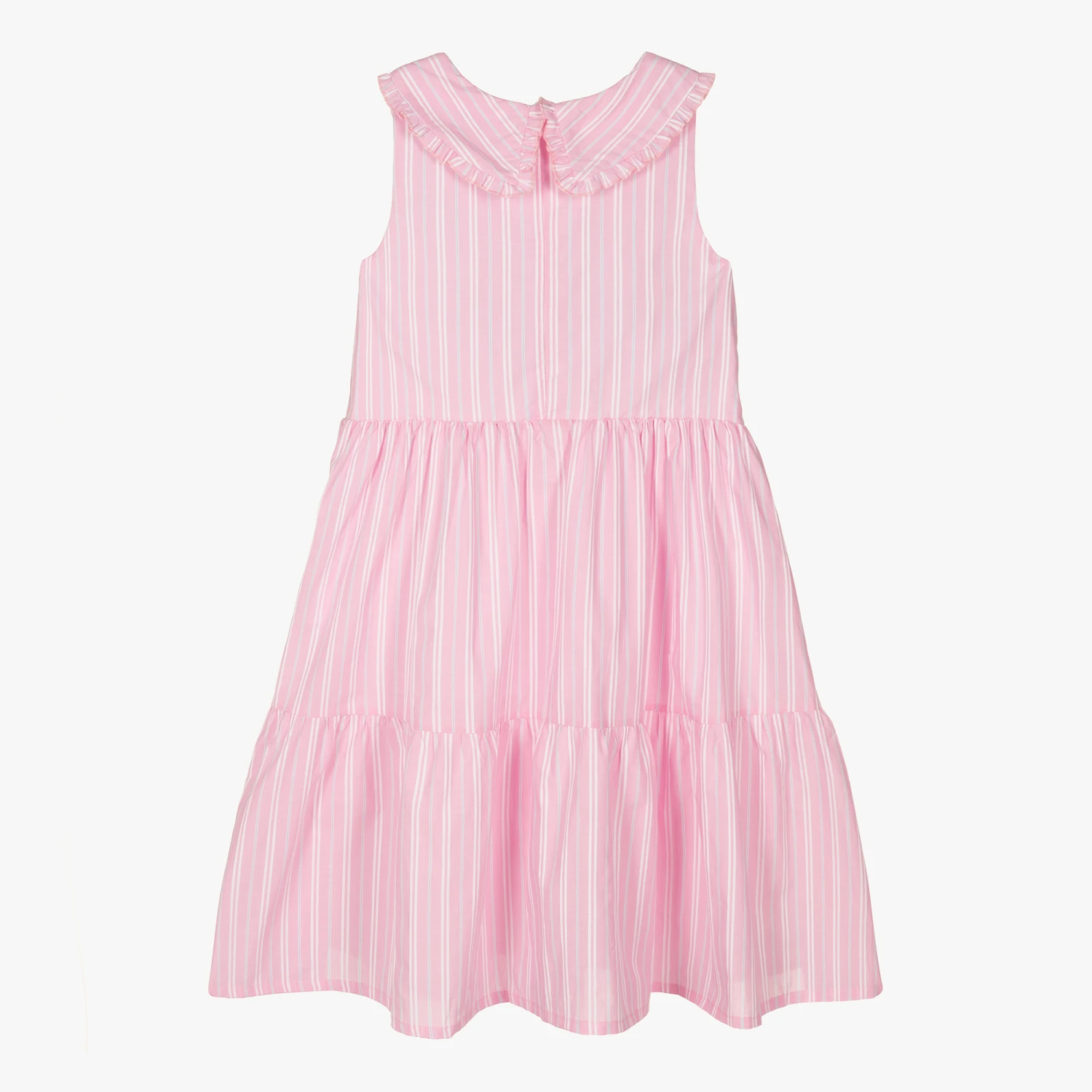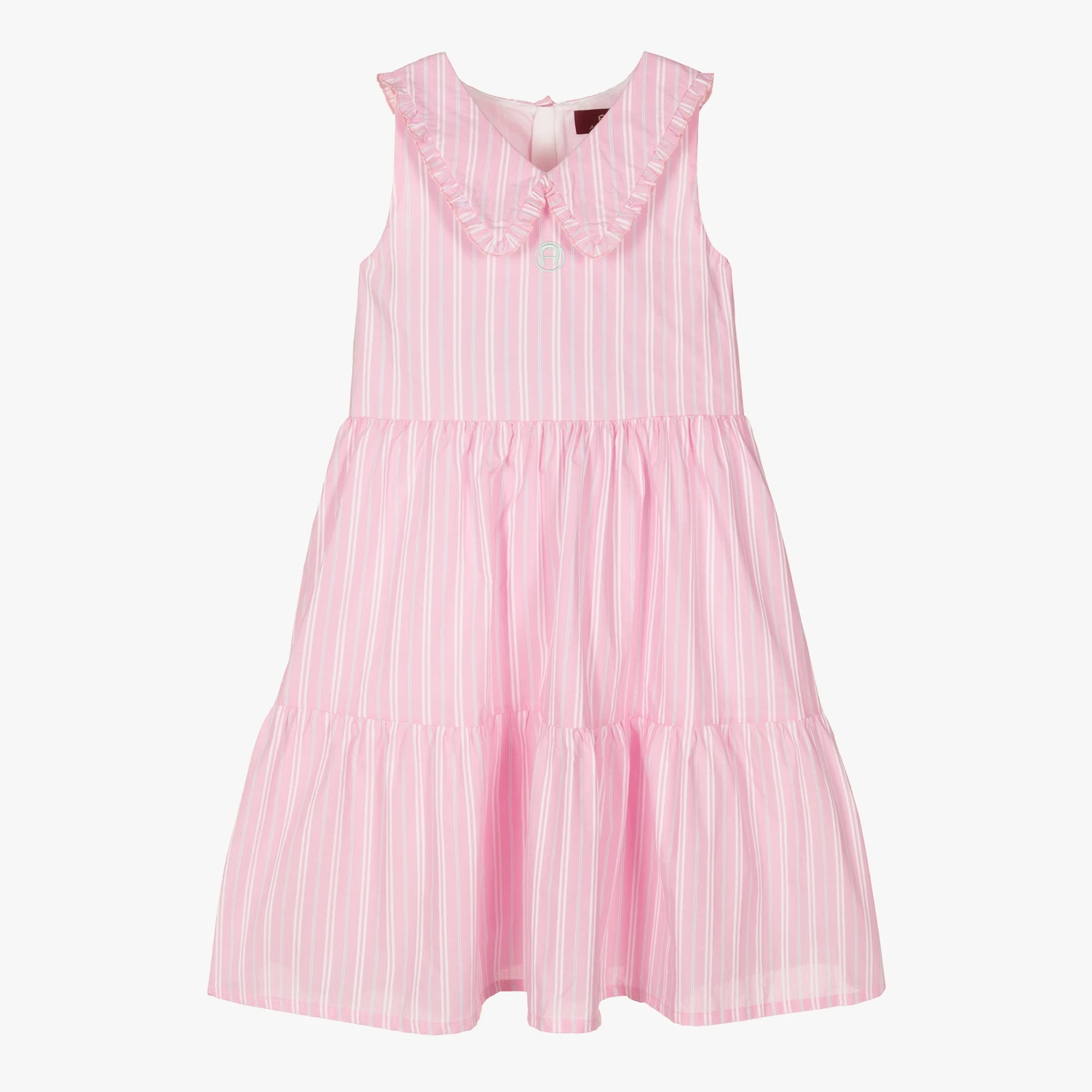 Stylish pink and white striped shirt dress for teen girls by German designer AIGNER. Woven in lightweight cotton poplin, it has a mint green signature ‘A’ horseshoe embroidered on the chest for a branded look. It has an oversized, pointed collar with ruffle trim and a tiered skirt for an on-trend look. It fastens seamlessly with a concealed zip on the back and has a lightweight voile lining for comfortable wear.