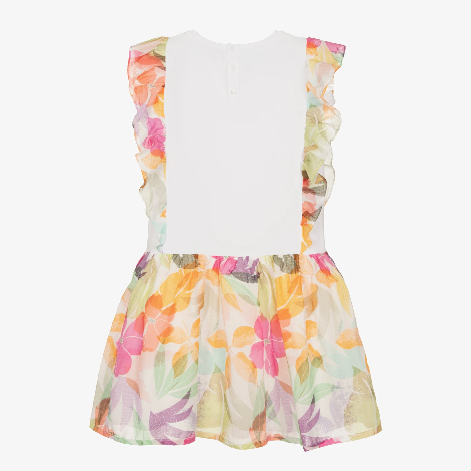 White with a colourful floral pattern, this pretty dress for teen girls is by AIGNER. Easy and comfortable to wear, the bodice is made in soft cotton jersey with ruffle trims, and the gathered skirt is in lightweight voile and fully lined. There is a floral motif on the chest, with the brand’s signature ‘A’ horseshoe logo in the centre. Adding a finishing designer touch, the dress fastens with branded buttons on the back.