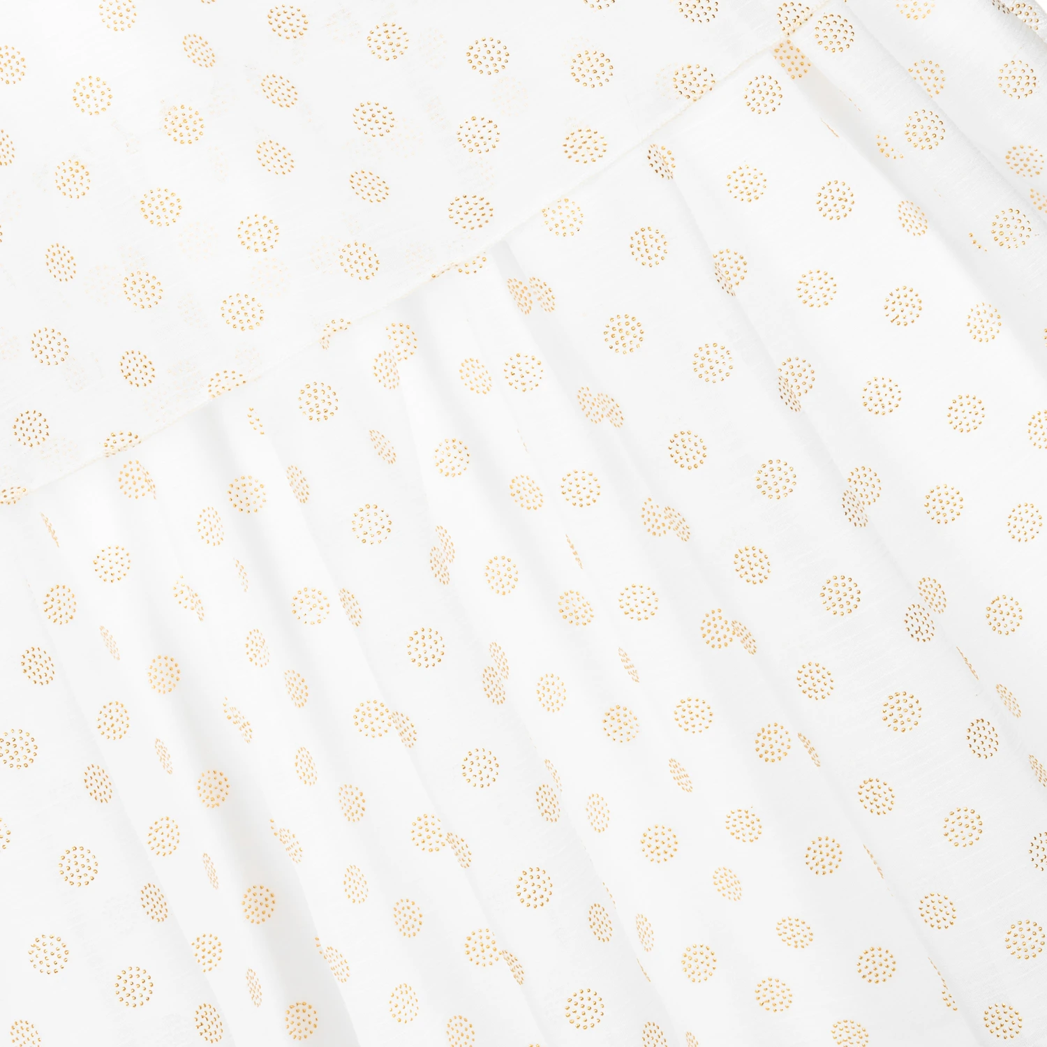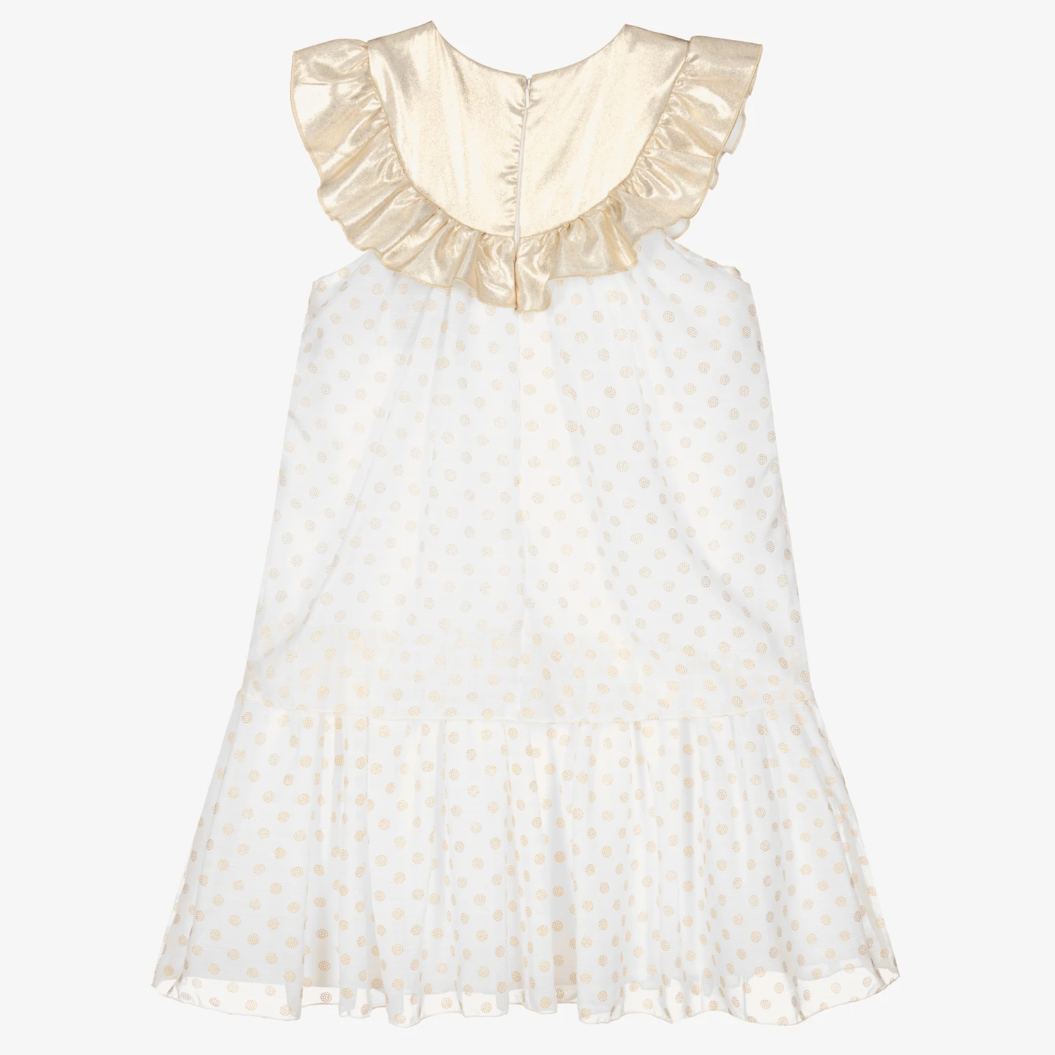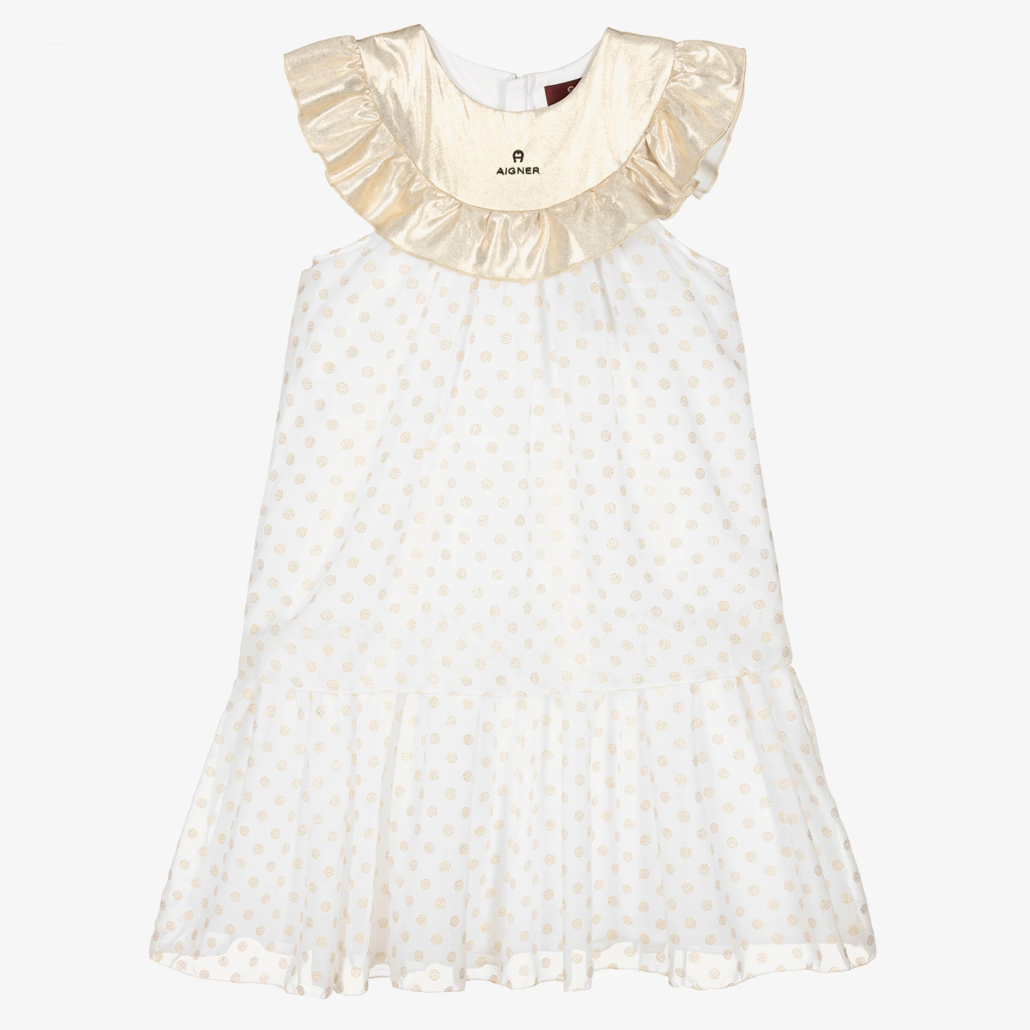 White dress for teen girls by German brand AIGNER, with the brand’s signature ‘A’ horseshoe logo embroidered in black on the front. Made in tiered, lightweight chiffon, this unique dress is patterned with shiny gold polka dots and framed with a deep, gold ruffled neckline. A zip fastening is neatly concealed on the back and the lightweight voile lining offers lasting comfort.