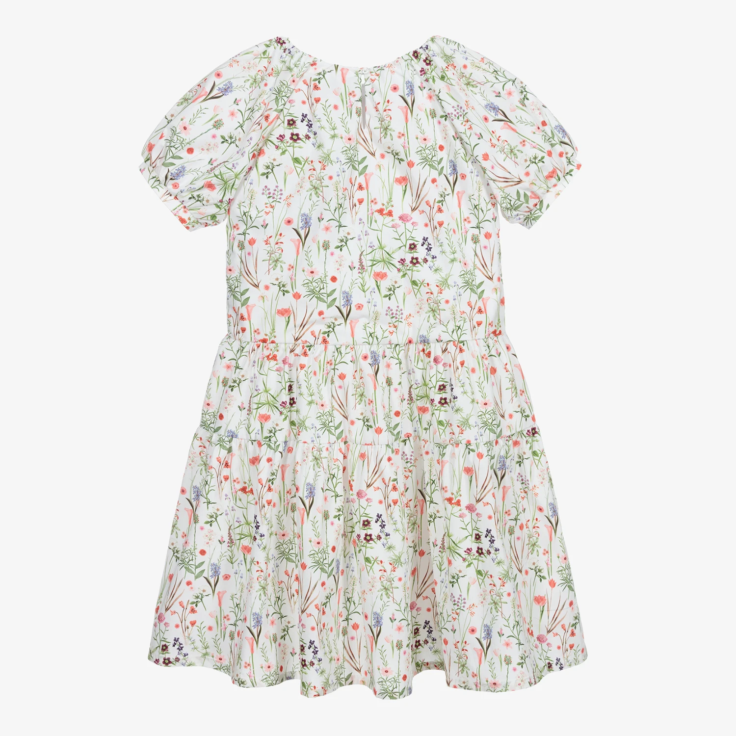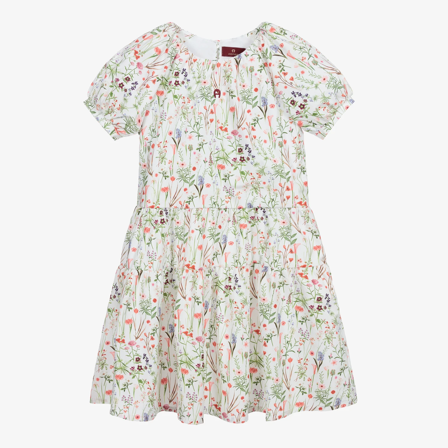 An ivory dress for teen girls by AIGNER, with a pretty pink, blue and green floral print. Made in soft cotton, it has puffed sleeves and a gathered skirt. The signature ‘A’ logo is embroidered on the front in burgundy red.