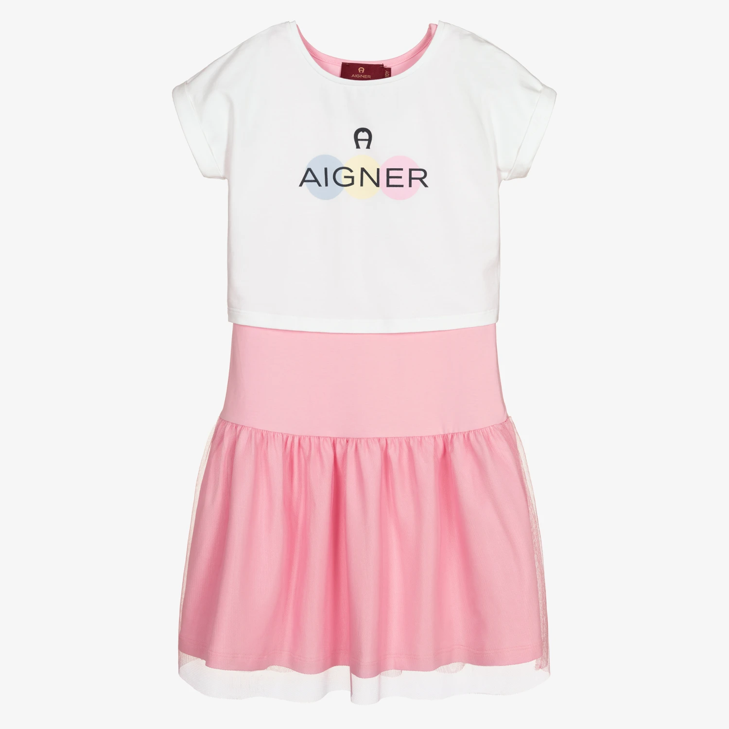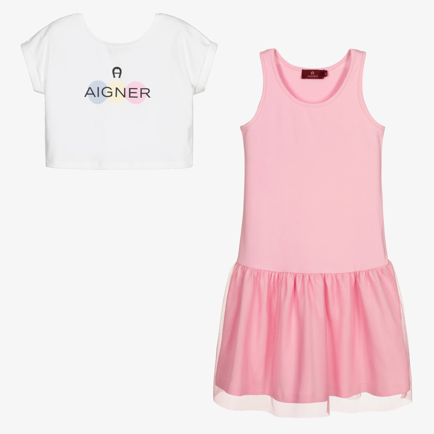 Teen girls white and pink dress set by AIGNER, made in soft and stretchy cotton jersey. The pink sleeveless dress has a skirt with a net overlay. It comes with a white cropped T-shirt that has a colourful signature ‘A’ horseshoe logo print on the chest. The top can be worn over the top of the dress or separately.