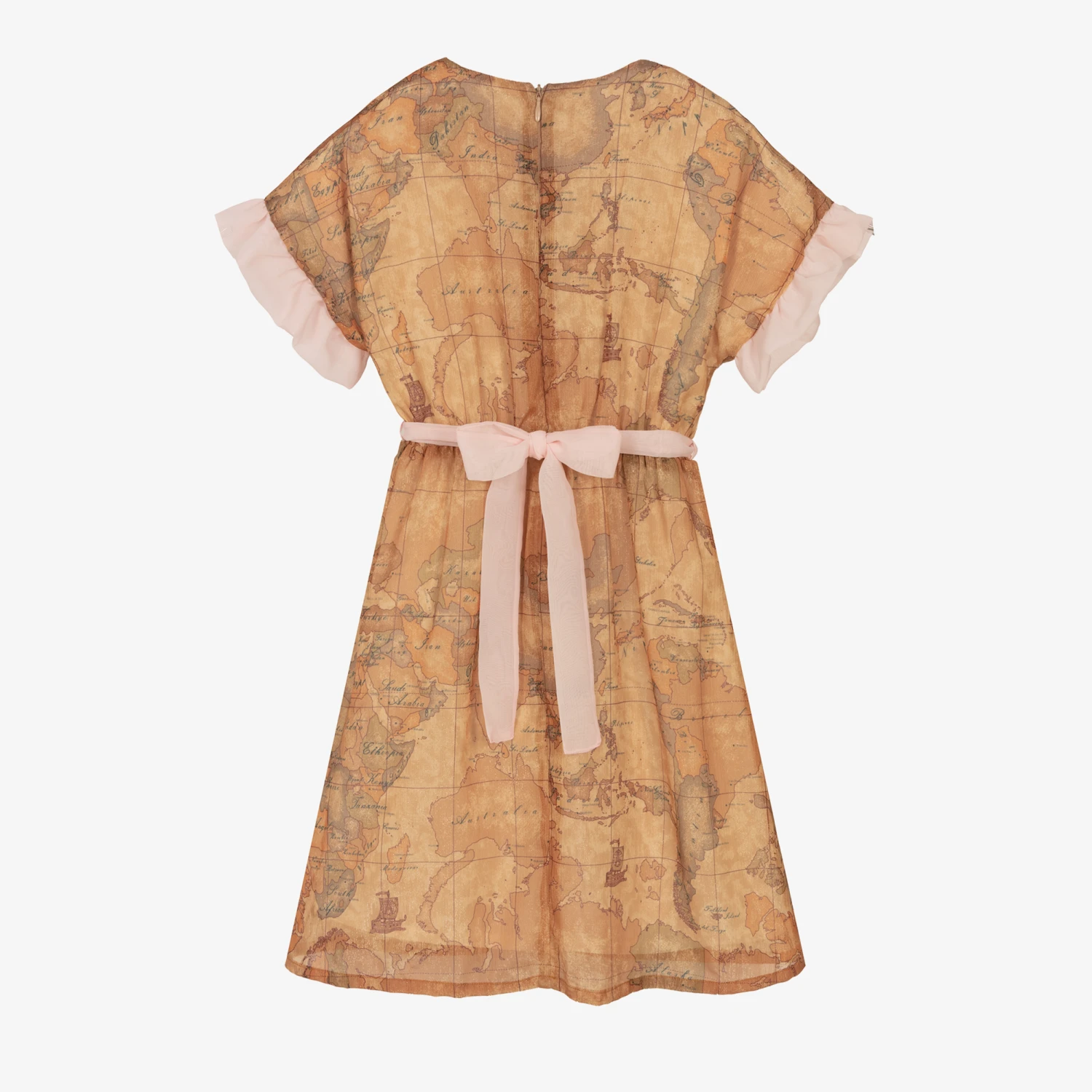 From Italian designer Alviero Martini, a gorgeous dark beige chiffon dress for teen girls in the signature Geo map print. Woven with metallic thread for subtle glamour, it has dropped shoulder sleeves with ruffled pink chiffon trim to match the removable tie belt. The dress is comfortably lined and fastens neatly with a concealed zip on the back.