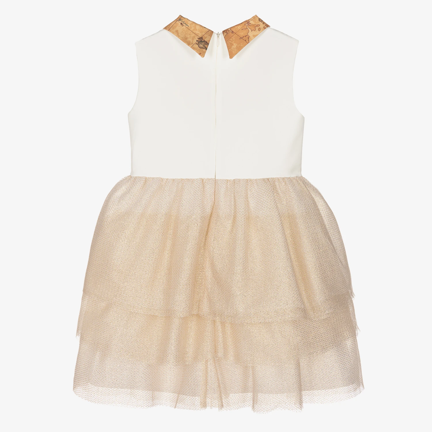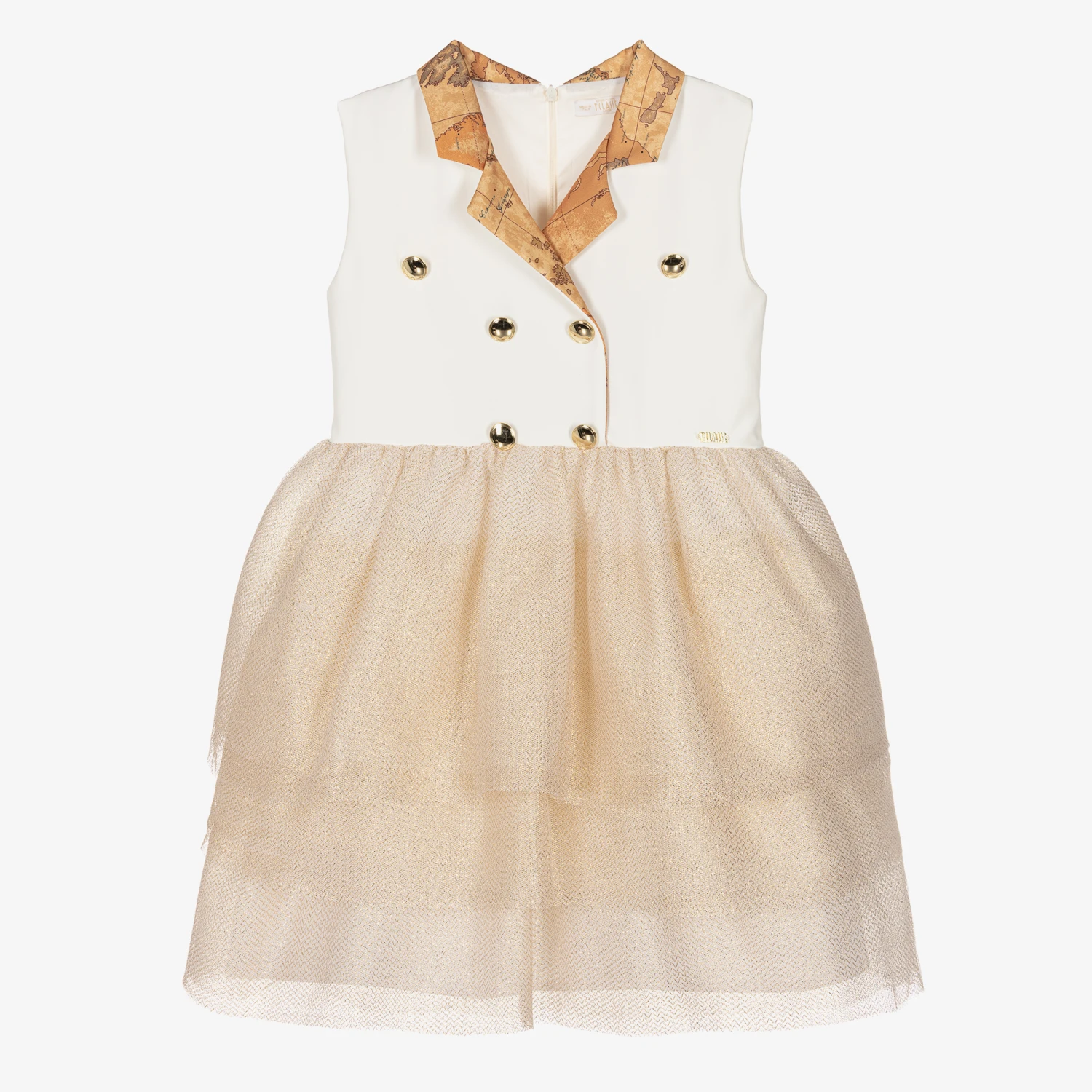 Effortlessly stylish and feminine, this ivory and gold dress for teen girls by Alviero Martini is stunning for special occasions. It has a smart and sophisticated double breasted bodice, inspired by tailored blazer styling. It has glamorous gold faux buttons and a dark beige Geo map collar with lapels. The 1a Classe logo charm is sewn on the waist for added sparkle. The voluminous gold skirt steals the show, with a dramatic silhouette and eye-catching shimmer. It has a soft lining for comfort and a hidden zip on the back for a seamless finish.