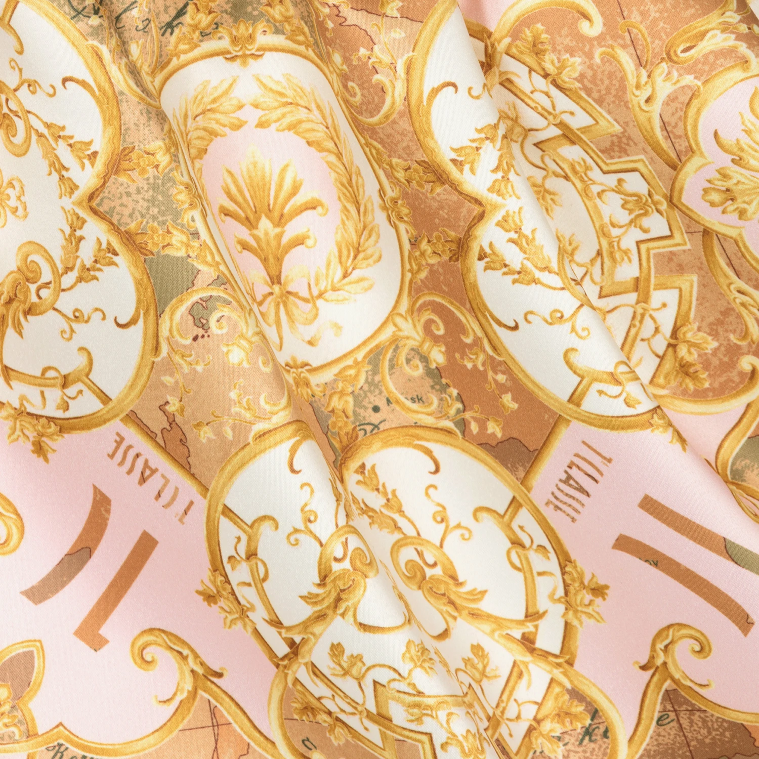 Eye-catching white, pink and gold dress for teen girls by Alviero Martini, richly decorated with an opulent filigree pattern, ornate regal-inspired leaf detailing and dark beige Geo map prints. The short sleeves and waist are trimmed with feminine pink tulle, and the dress fastens with a neat hidden zip on the back. Made in sumptuously soft satin, this beautiful Italian-crafted dress has a lightweight cotton lining for comfort and layers of soft organza for added volume.