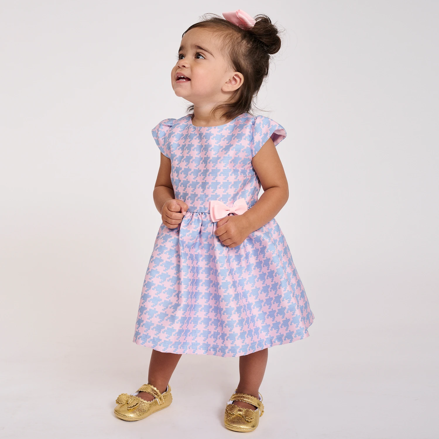 Smart pale pink and blue houndstooth dress for baby girls by British brand Angel’s Face. Soft, lightweight and with a sheen, it has cute capped sleeves. There is a pink grosgrain bow on the waist of the full, gathered skirt and it fastens with golden logo buttons on the back.