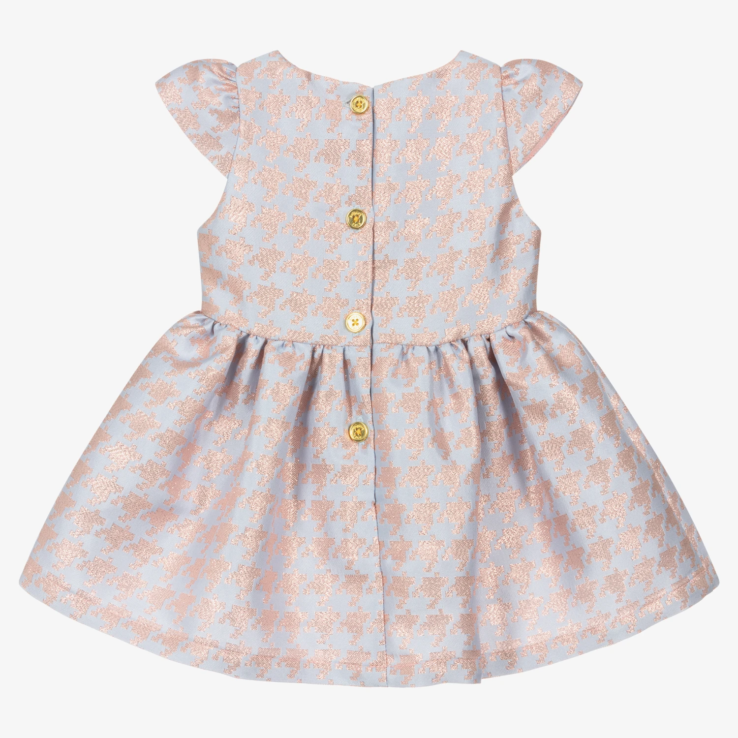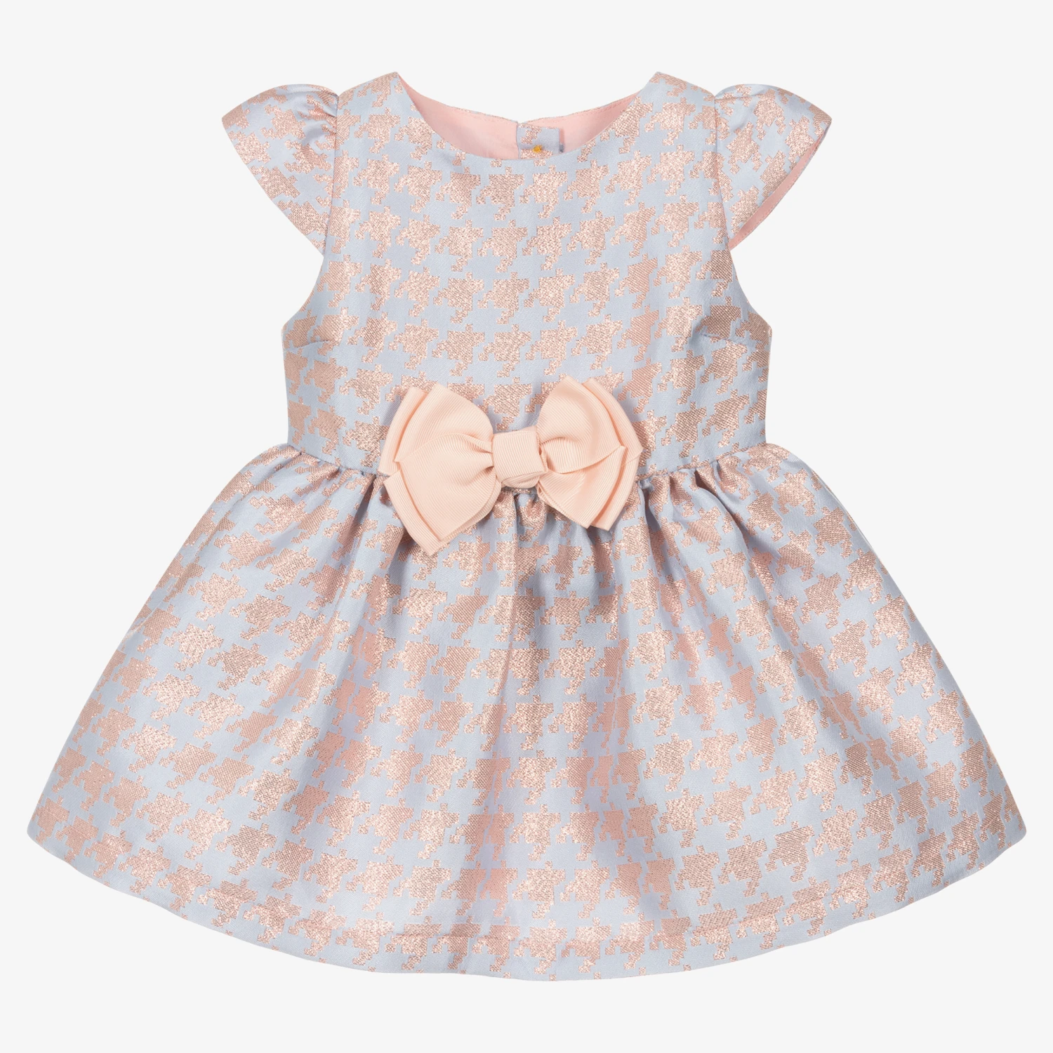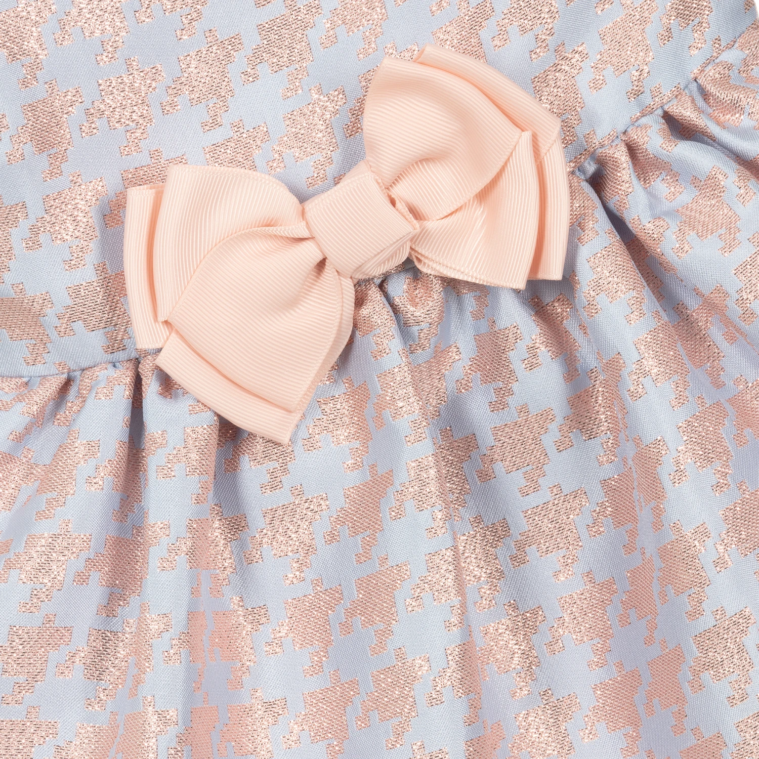 Gorgeous blue special occasion dress for baby girls by Angel’s Face. Woven in midweight cotton jacquard, it has a shimmery rose gold houndstooth pattern all-over, with elegant capped sleeves and a statement pink grosgrain bow at the waist. Lined in soft chiffon for comfort, it fastens with shiny gold logo-embossed buttons on the back for a glamorous finishing touch.
