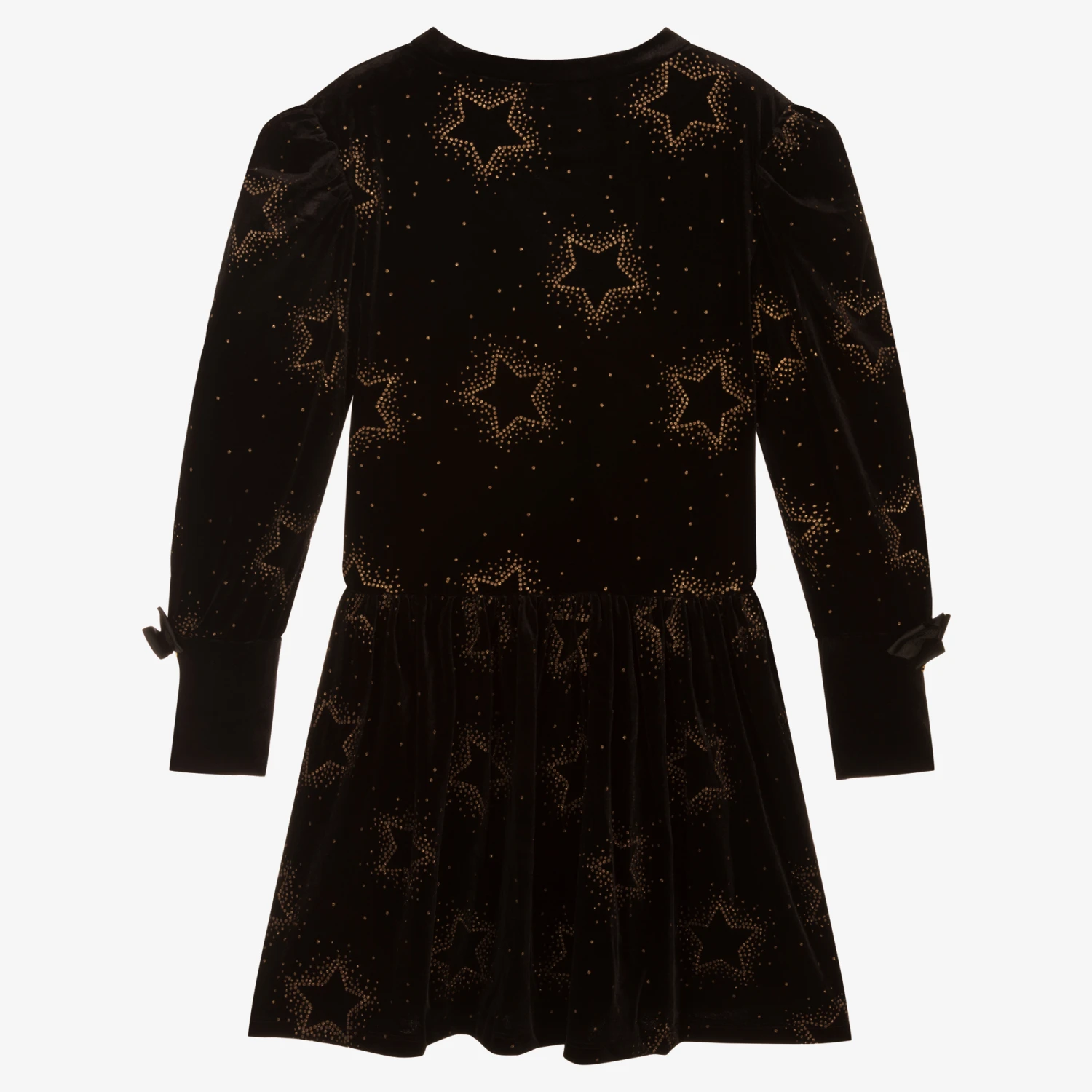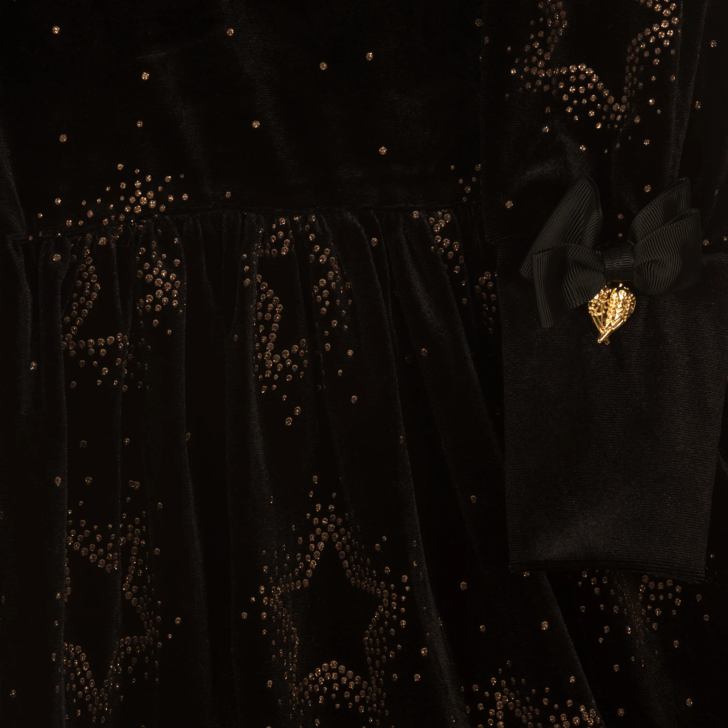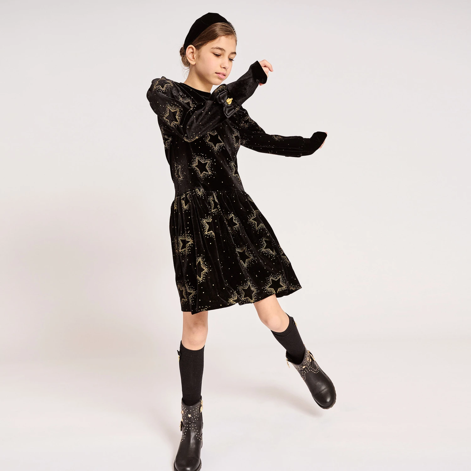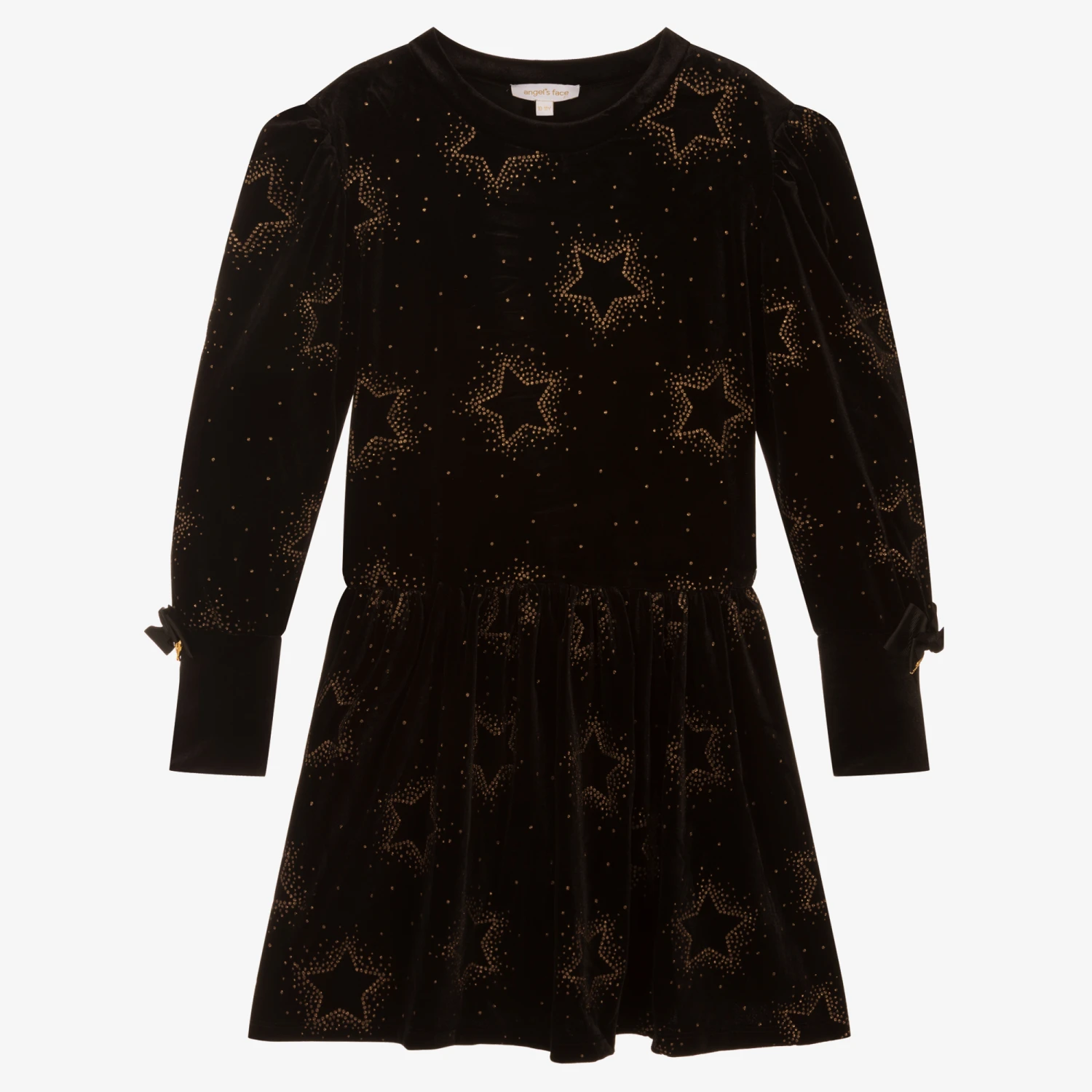 From Angel’s Face, a lovely black velour dress for teen girls, exclusive to Childrensalon. Patterned with glittery gold stars, this soft and stretchy dress has a stylish dropped waist and feminine puffed sleeves with deep cuffs. The brand’s signature gold heart charm and bow are stitched onto each cuff.