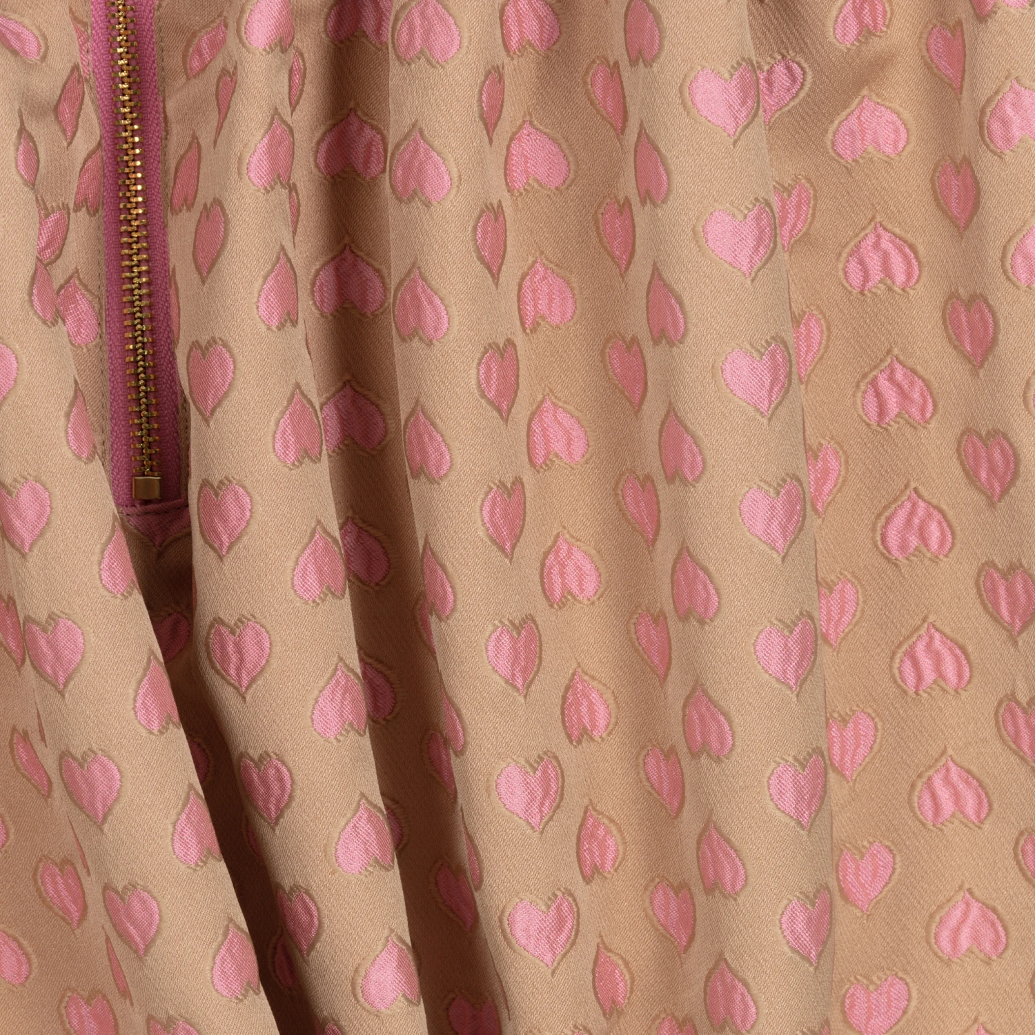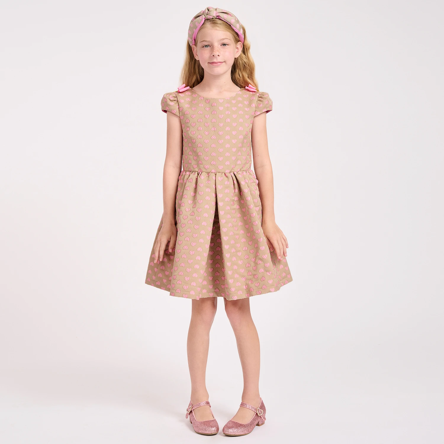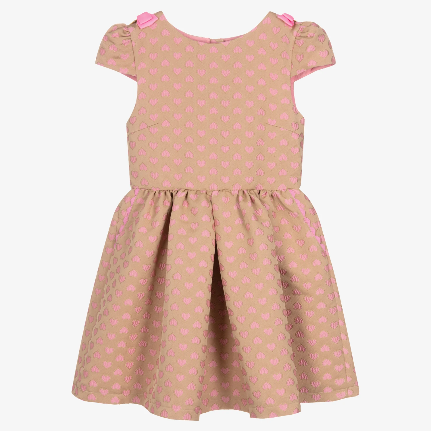 A lovely beige and pink dress for teen girls from Angel’s Face, in a heart jacquard pattern. It has the designer’s signature golden heart charm and bow detailing on both shoulders. So pretty and girly, the front pockets are trimmed with cute pink ric rac ribbons and there are little capped sleeves. Fully lined in soft pink crêpe for comfort, it fastens with an exposed golden zip on the back.