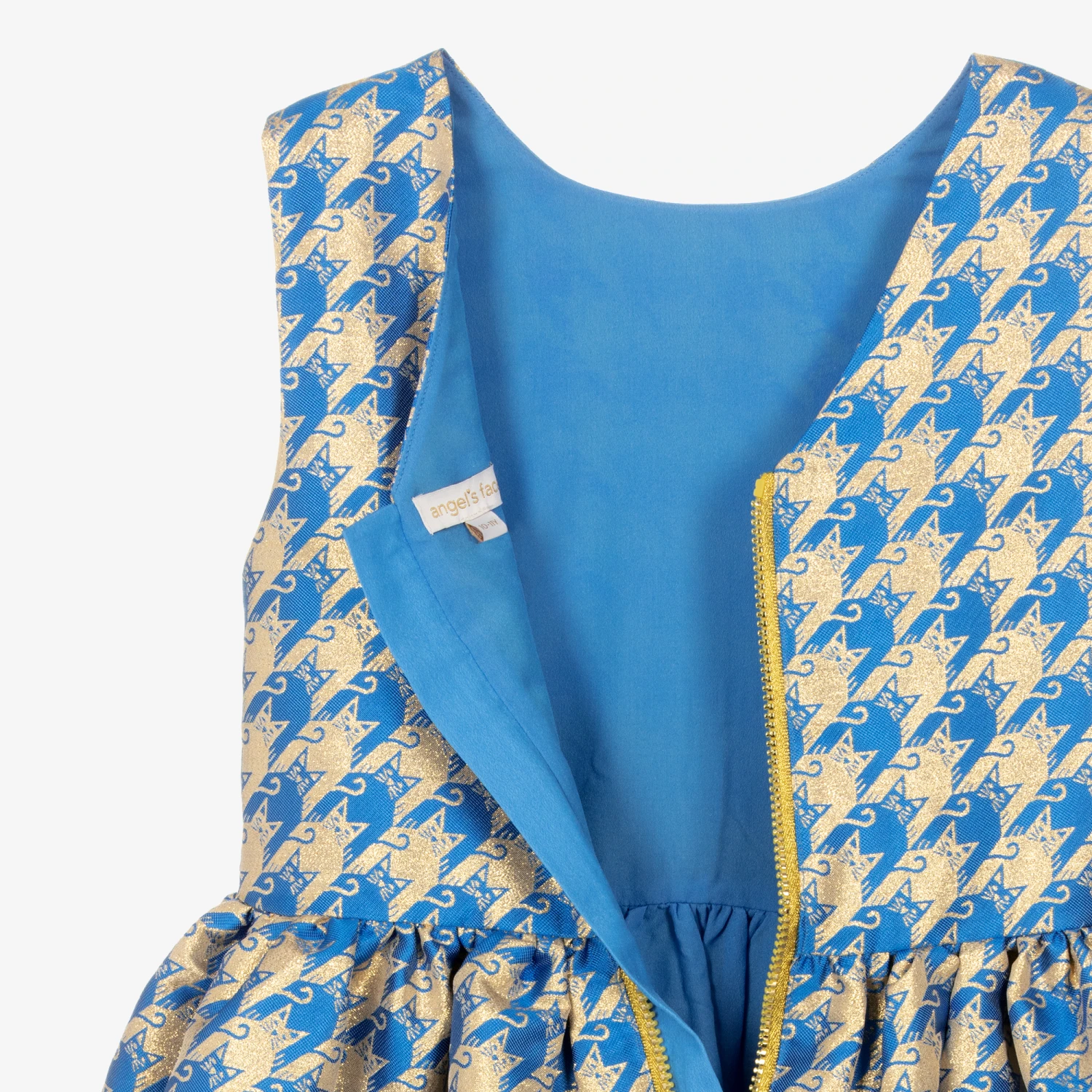 Gorgeous royal blue and gold dress for teen girls by Angel’s Face, with the brand’s signature gold heart charm and an oversized blue grosgrain bow on the waistline. Made in cat-patterned silky jacquard, this sleeveless, special occasion style dress has a lightweight lining and a visible gold zip fastening with a branded pull on the back.