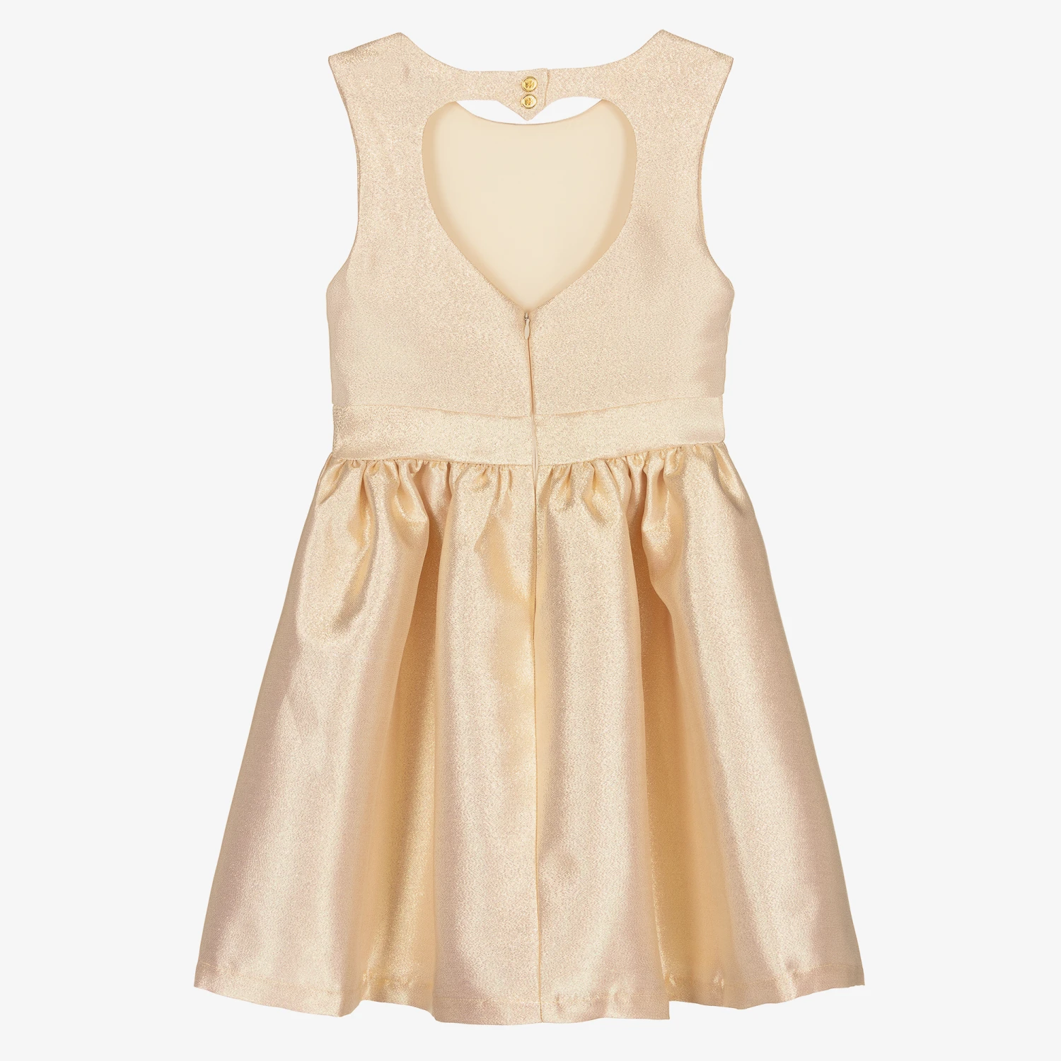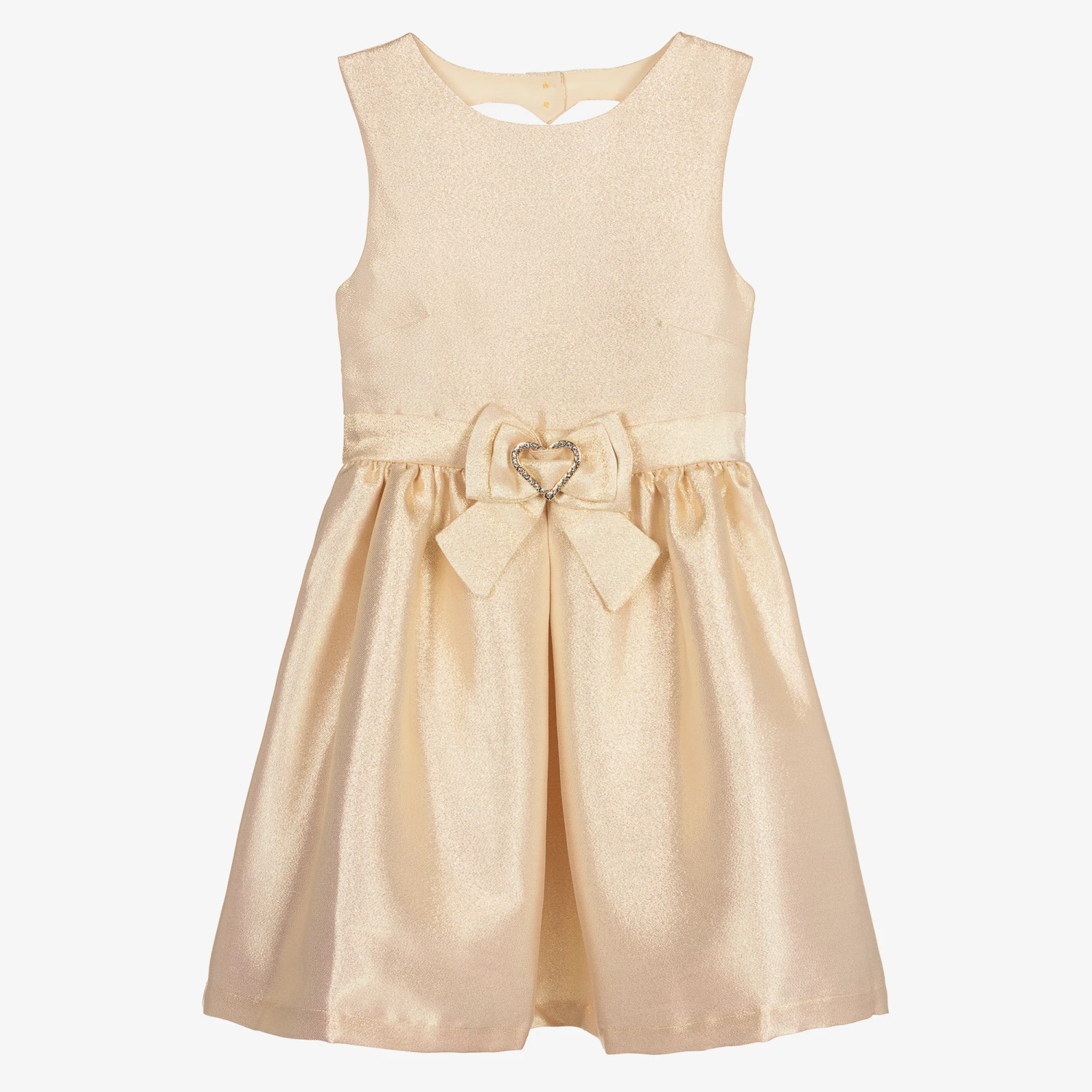 Teen girls pale gold dress by Angel’s Face, perfect for a special occasion. Made in mid-weight sparkly polyester, this unique dress has a full skirt gathered from the waist for the ultimate wow factor. Trimmed with a detachable diamanté gold heart in the centre, the back has a stylish heart-shaped opening, with a lightweight satin lining for comfort.