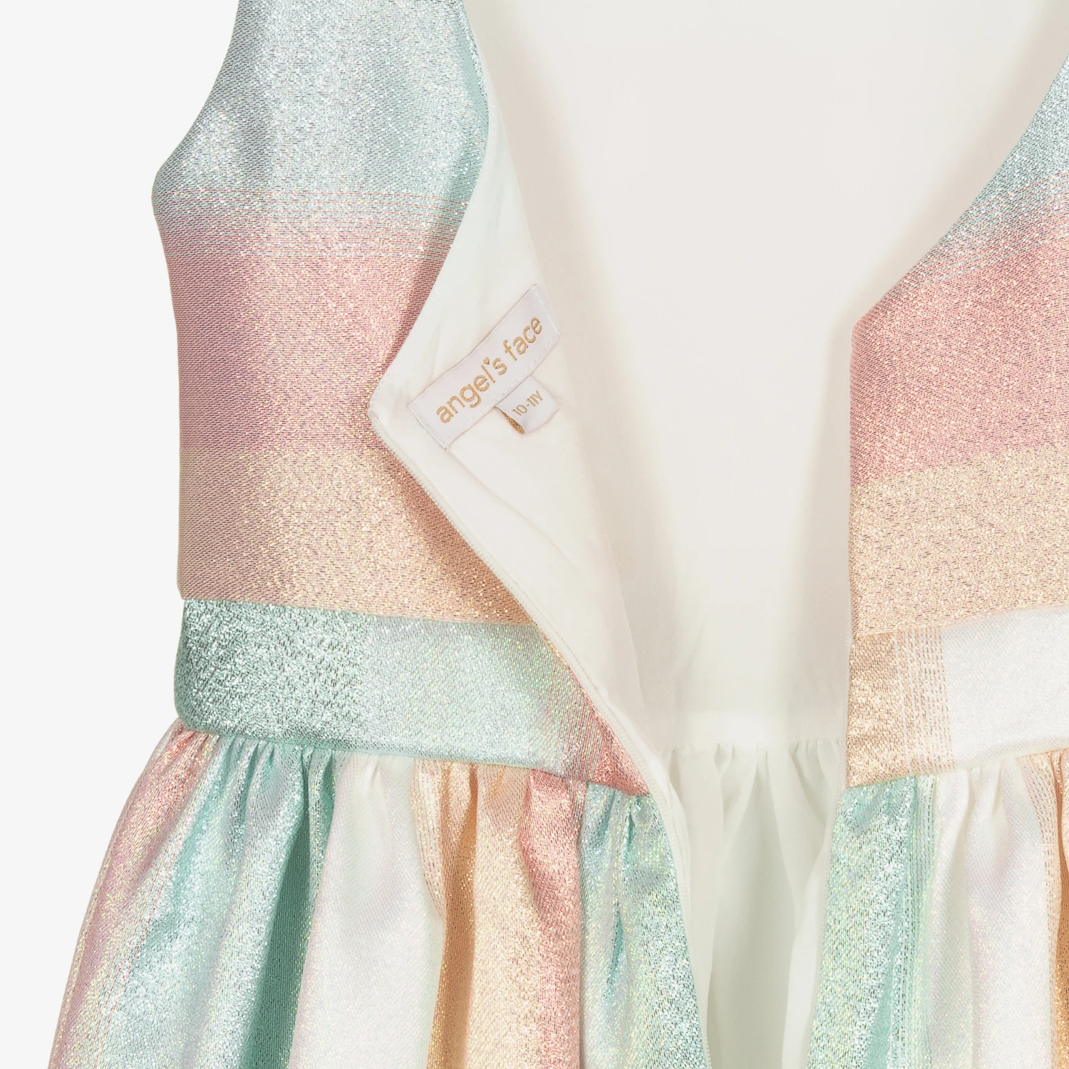 Teen girls pastel blue, gold and pink striped dress by Angel’s Face, perfect for a special occasion. Made in mid-weight sparkly polyester, this unique dress has a full skirt gathered from the waist for the ultimate wow factor. Trimmed with a detachable diamanté gold heart in the centre, the back has a stylish heart-shaped opening, with a lightweight satin lining for comfort.