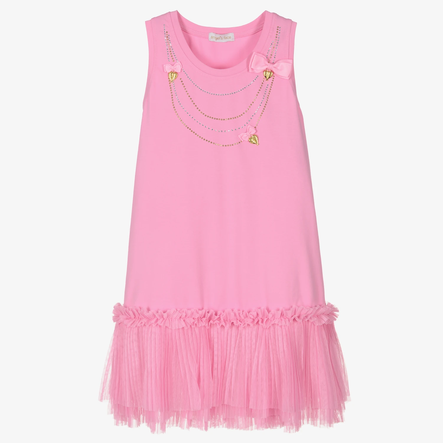 Eye-catching rose pink cotton dress for teen girls by British brand Angel’s Face, ideal for special occasions or just to add a little sparkle to the day. Made in comfortable jersey with flouncy, pleated tulle ruffles around the hemline, it has glittery gold and silver studs around the neckline, decorated with the designer’s signature golden heart charms and grosgrain bows. Easy to wear, it simply slips on.