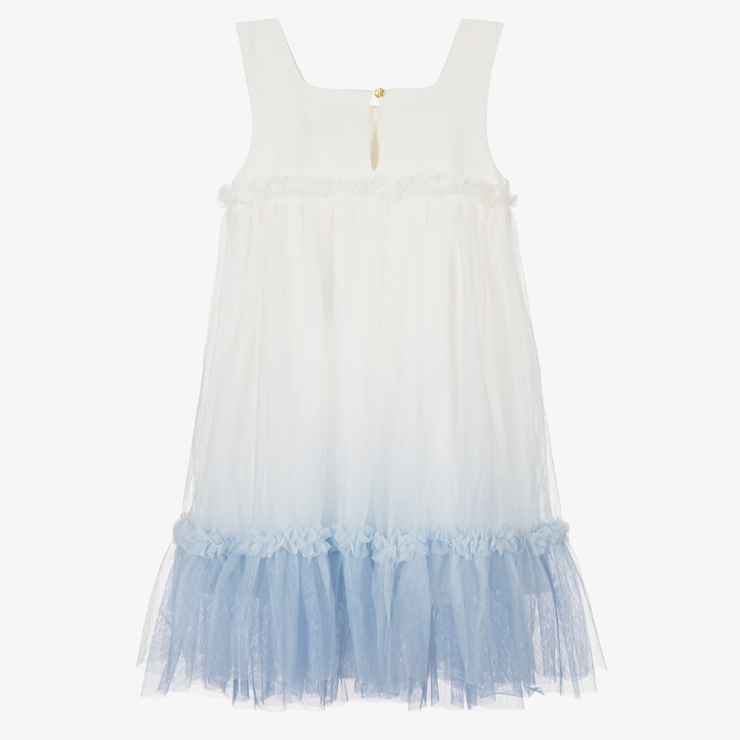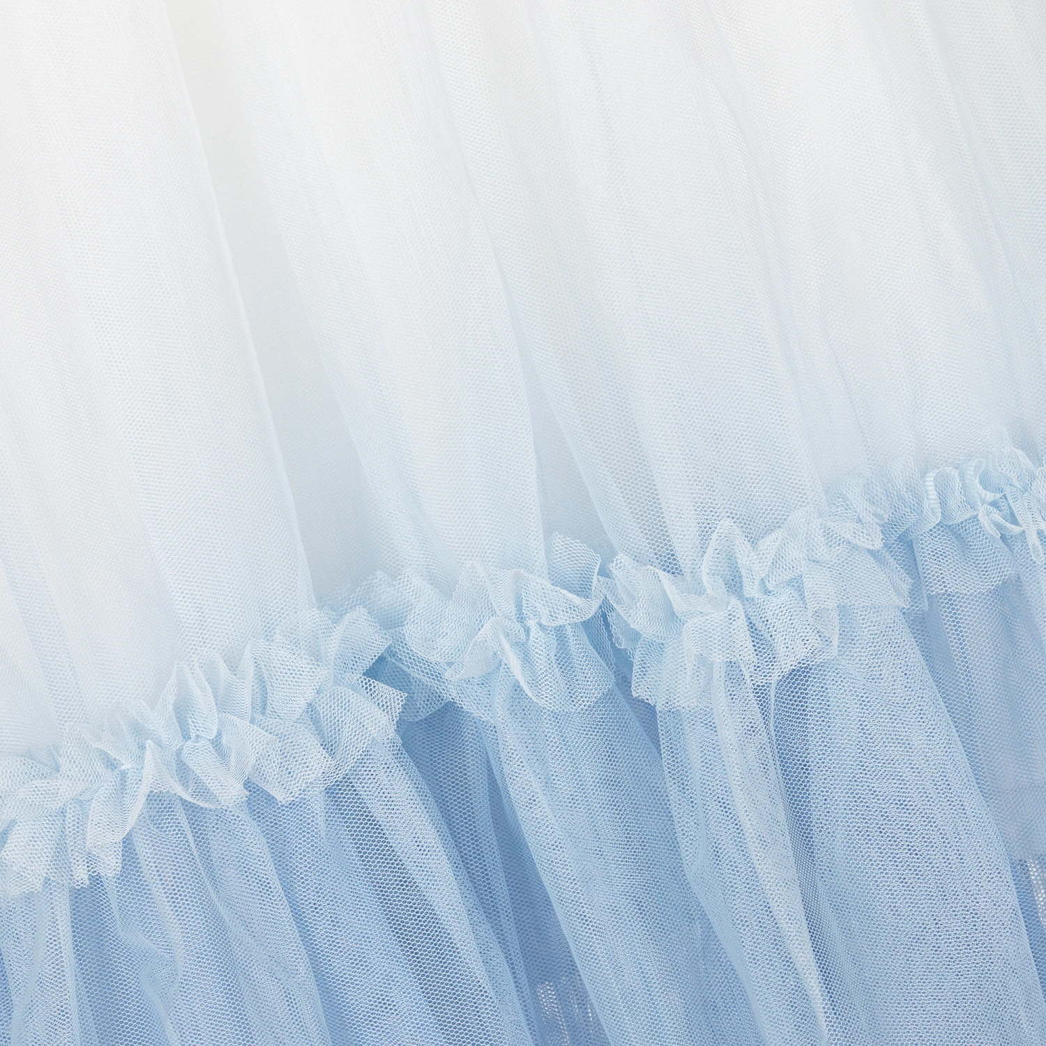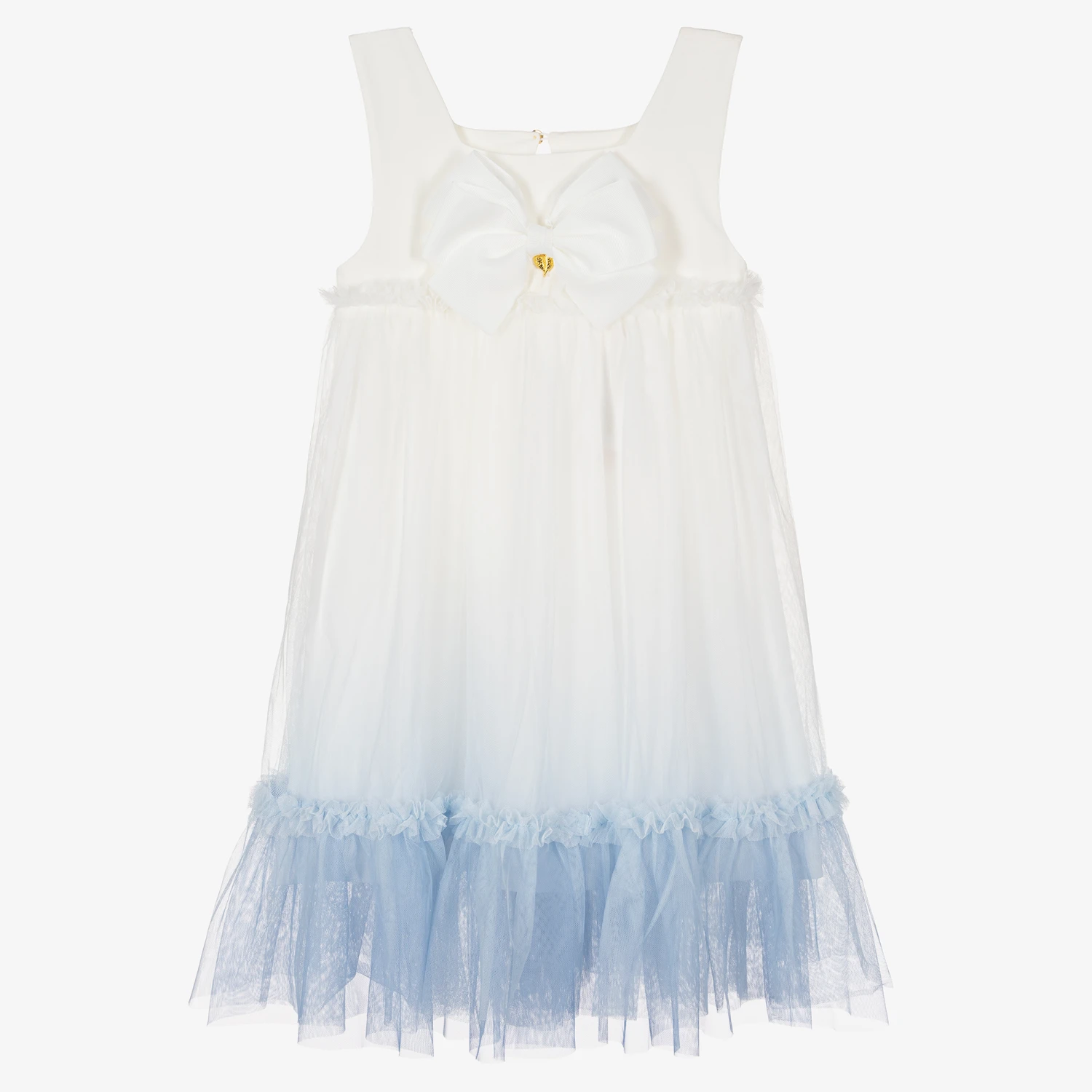 Stunning sleeveless dress for teen girls by Angel’s Face, in lovely off-white and cornflower blue shades. This feminine style has an oversized gold heart charm and bow appliqué on the front, adding extra glamour to the look. The flared skirt has a pretty ombré blue tulle style and a voluminous silhouette. It fastens on the back with a luxe gold button for a stylish finish.