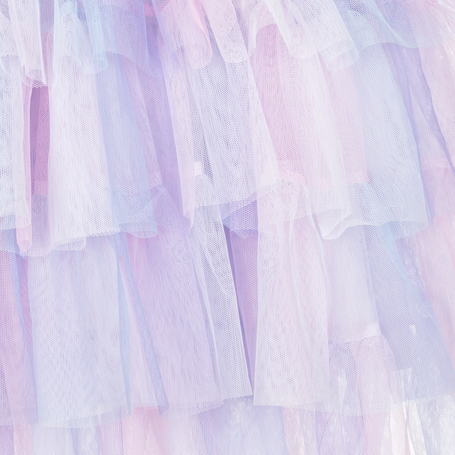 Off-white sleeveless dress for teen girls from Angel’s Face. The top is made in a super-soft modal and cotton jersey, with satin trims and single back button fastening. It has beautiful pink, violet and blue tulle ruffles, trimmed with the signature gold heart charm and grosgrain bow on the chest. The skirt has tiers of matching tulle ruffles over a jersey lining.