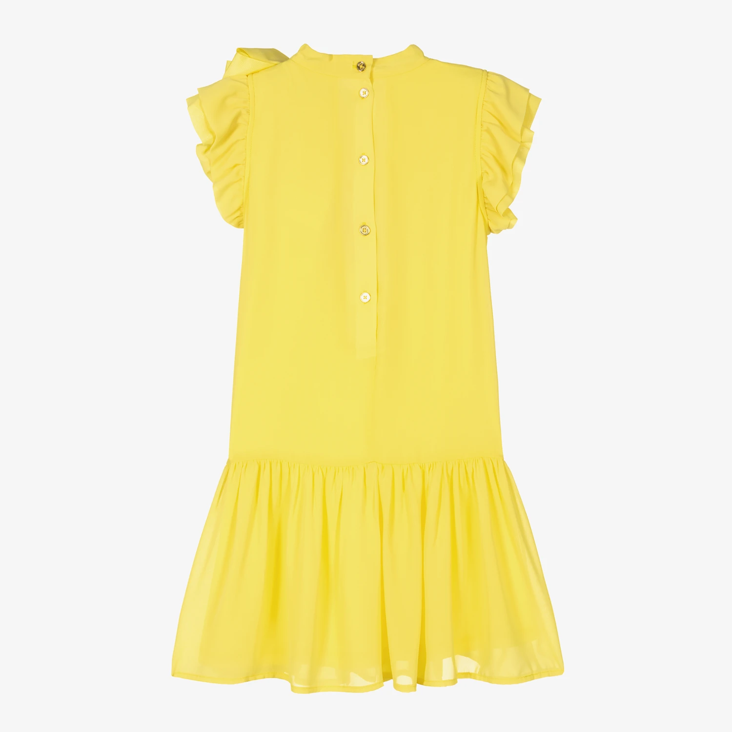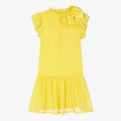Gorgeous yellow chiffon dress for teen girls by Angel’s Face, trimmed with the brand’s signature gold heart charm and oversized grosgrain bow. Soft and lightweight, it has feminine ruffles over the shoulders and around the elasticated neckline, with glamorous gold logo button fastenings on the back. There is a deep frill on the hem and the lining is made in a luxuriously soft cotton and modal jersey blend for comfort.