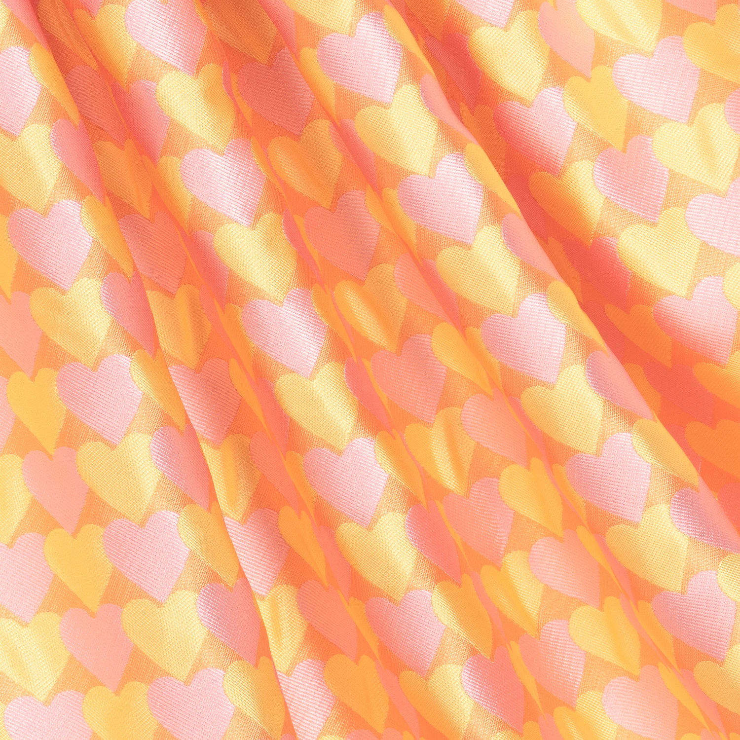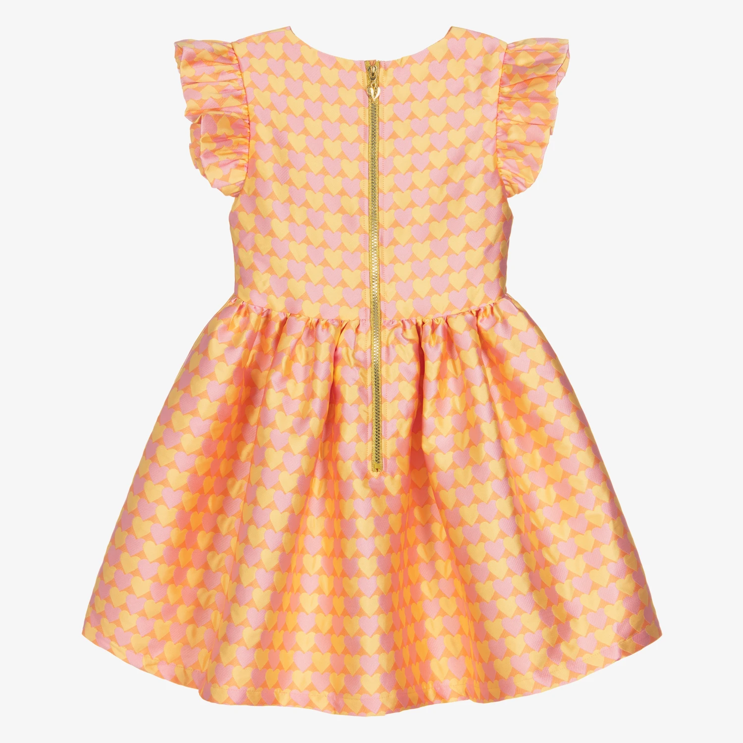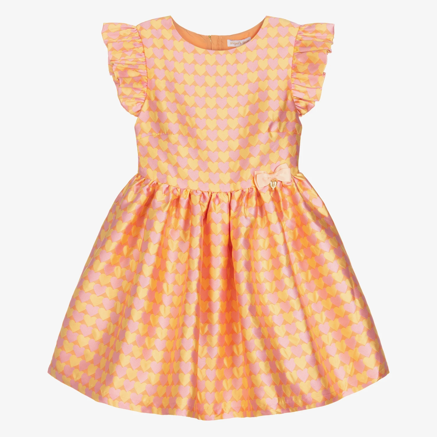 Teen girls orange, pink and yellow special occasion dress by Angel’s Face. Made from silky brocade with a bold heart pattern, this gorgeous dress has the signature gold heart charm and grosgrain bow sewn onto the waist. It has chic flutter sleeves, and a full skirt gathered from the waist for a stylish silhouette. Lined in lightweight chiffon for a comfortable fit, it fastens on the back with a shiny gold heart zip-pull.
