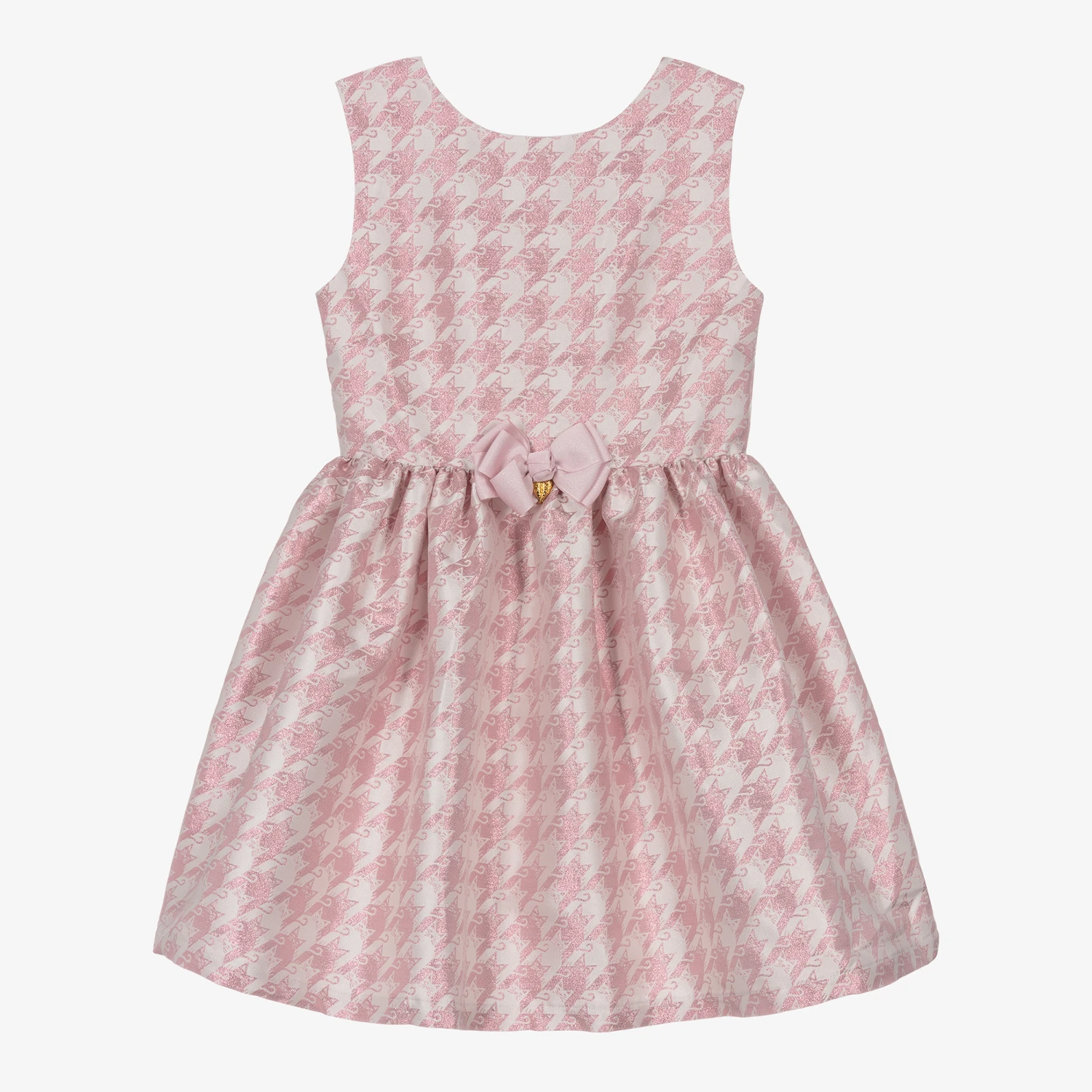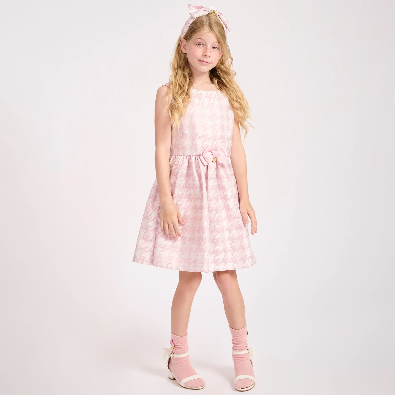 A glamorous pink and white jacquard dress for teen girls by British brand Angel’s Face, finished in a glittery cat houndstooth pattern. A sleeveless design, this eye-catching dress has a large pink grosgrain bow on the waistline, paired with the brand’s signature gold heart logo charm. Gathering gently at the waist, it is fully lined in silky crêpe fabric and fastens on the back with a gold zip and heart-shaped pull.