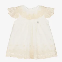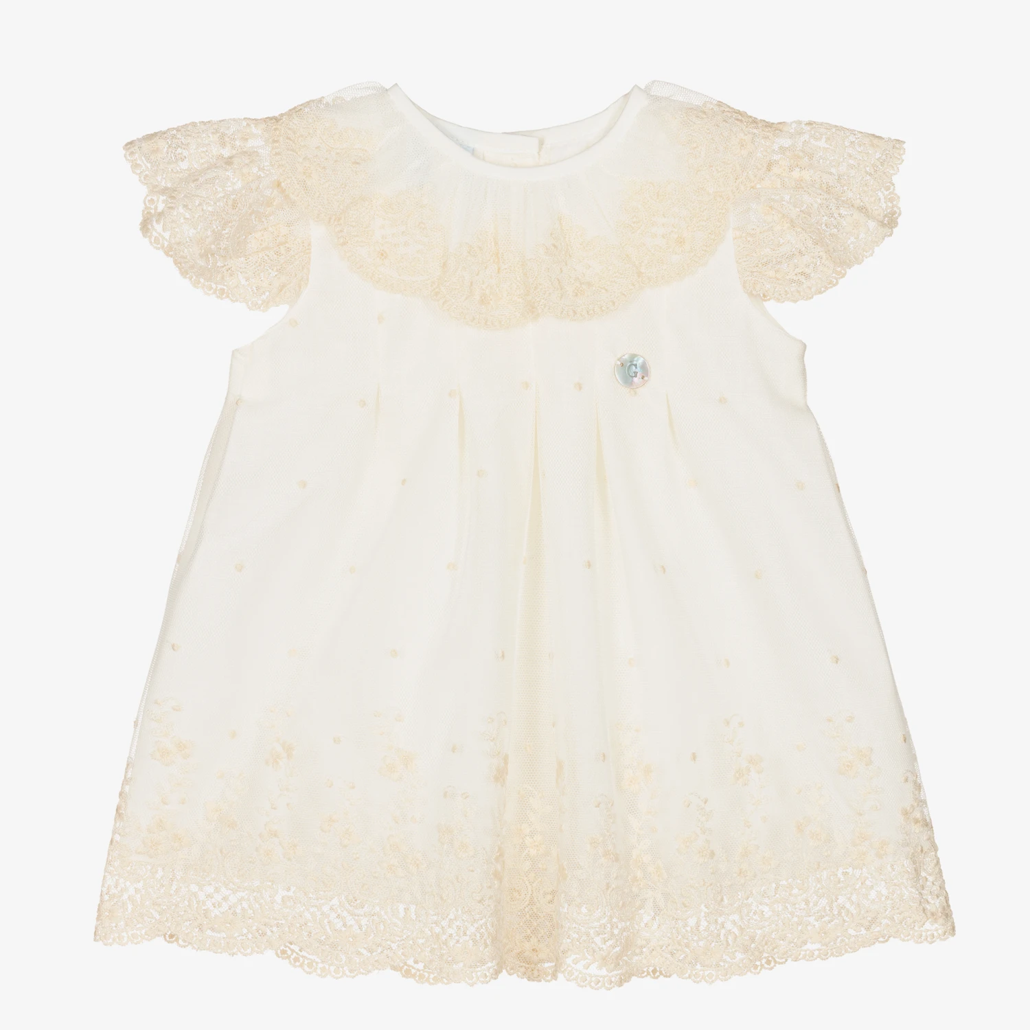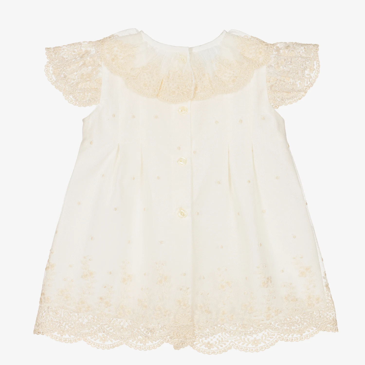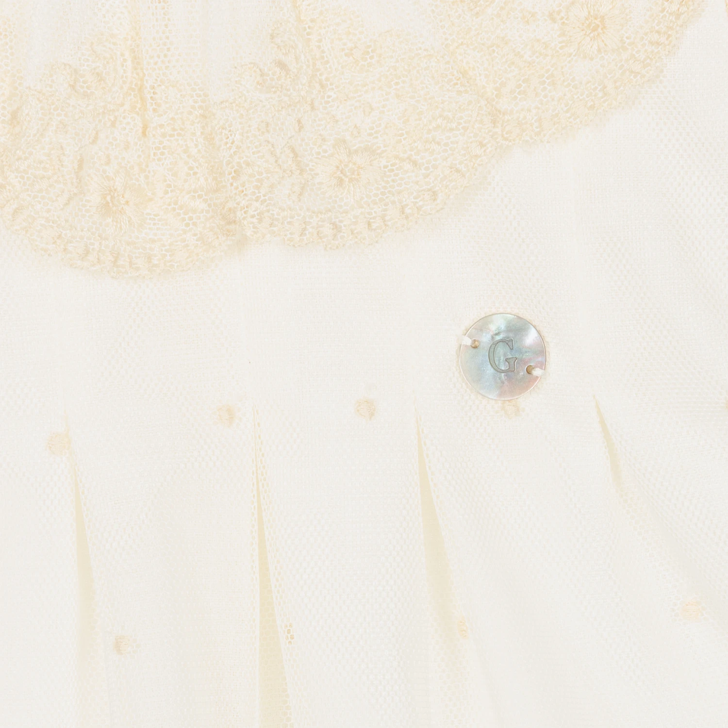 Graceful ivory dress for baby girls by Spanish brand Artesania Granlei, made in delicate tulle with a soft voile lining. It has beautiful lace detailing and embroidered polka dots, with pearlescent button fastenings on the back. This dress comes with matching knickers, which have gently elasticated trims for ultimate comfort.