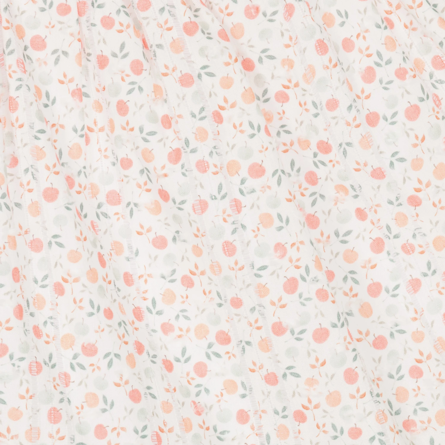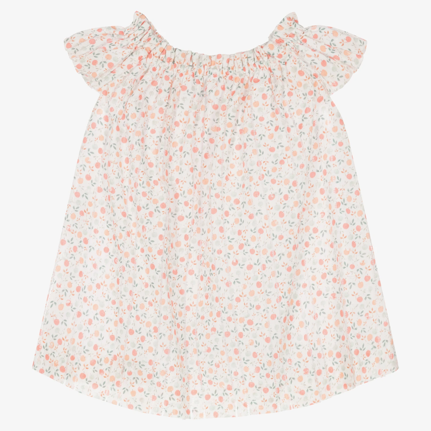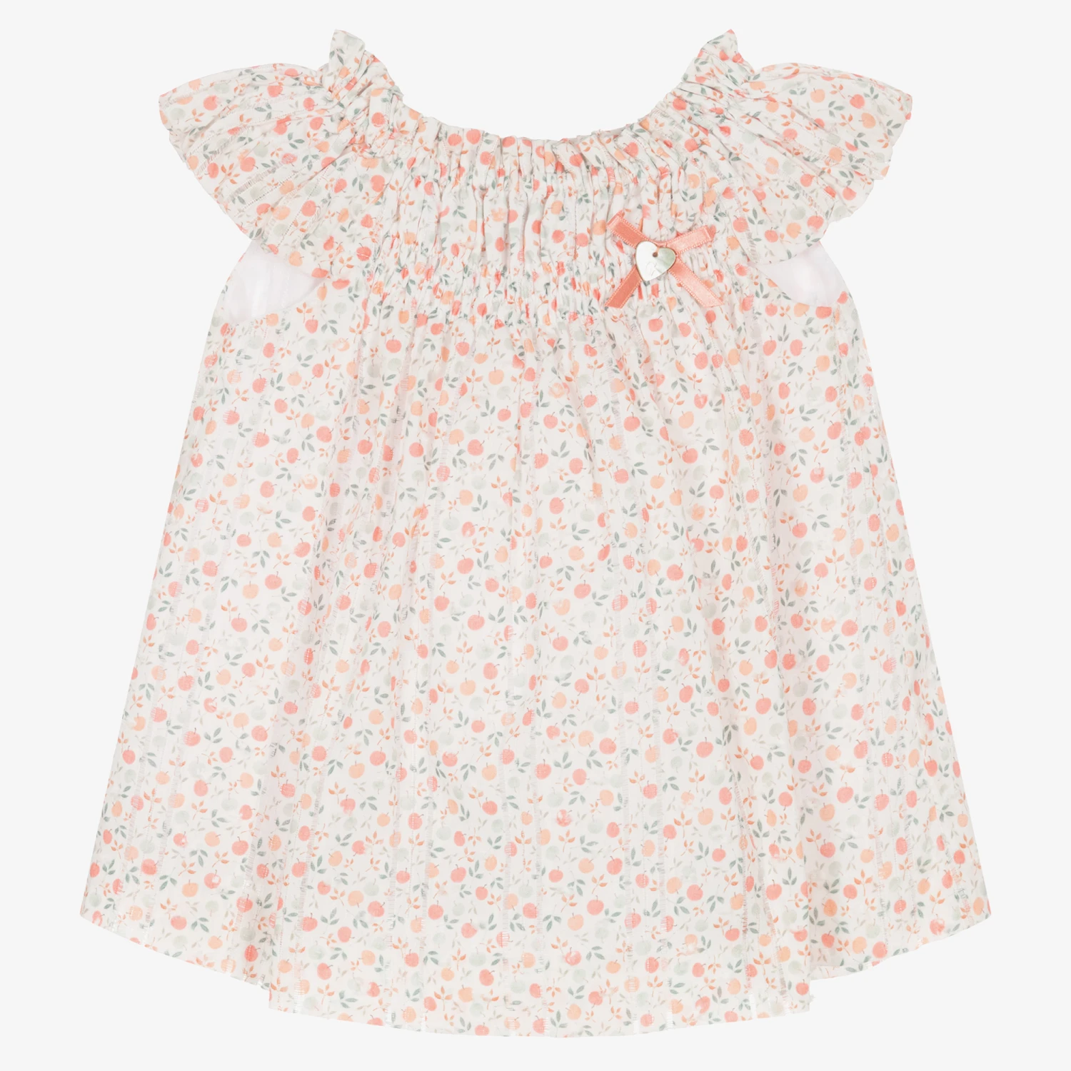 White cotton dress for baby girls by Artesania Granlei, with a cute fruit print in hues of orange and green. Fully lined for added comfort, it has a lightly shirred neckline to make dressing easier. The brand’s signature mother-of-pearl logo tile is on the chest with an orange ribbon bow for a pretty finish.