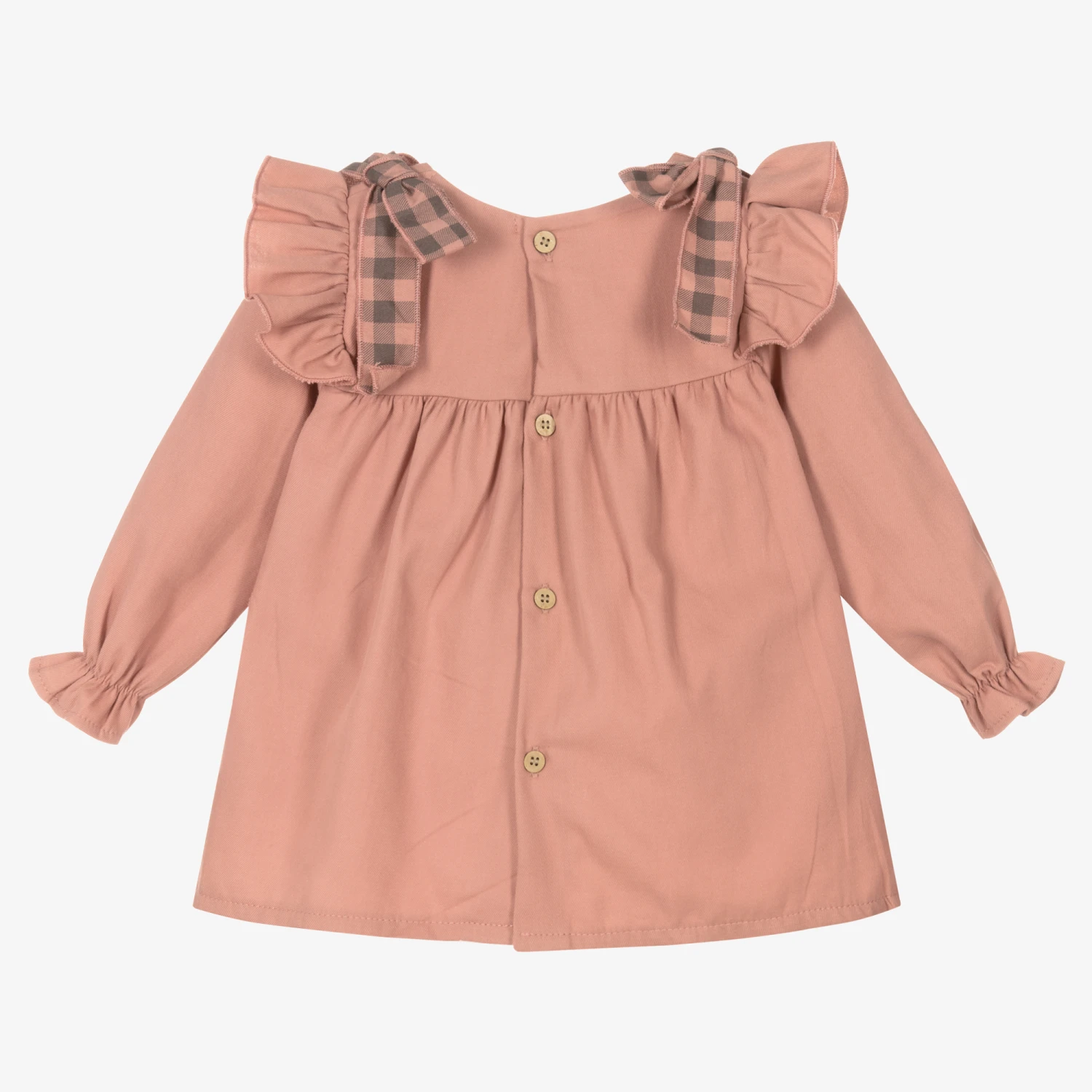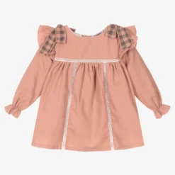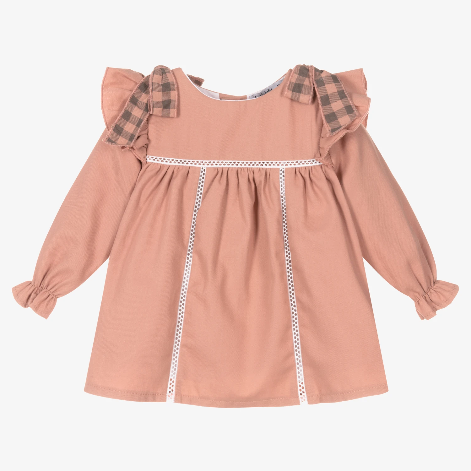 Lovely dusky pink cotton dress for baby girls by Spanish brand Babidu. This fully lined dress has white lace detailing on the front and sweet ruffles over the shoulders, with attached bows in a pink and brown check. The long sleeves are gently elasticated at the cuffs and it fastens on the back with buttons. To complete the look it comes with coordinating knickers, which are gently elasticated around the waist and legs to ensure a comfortable fit.