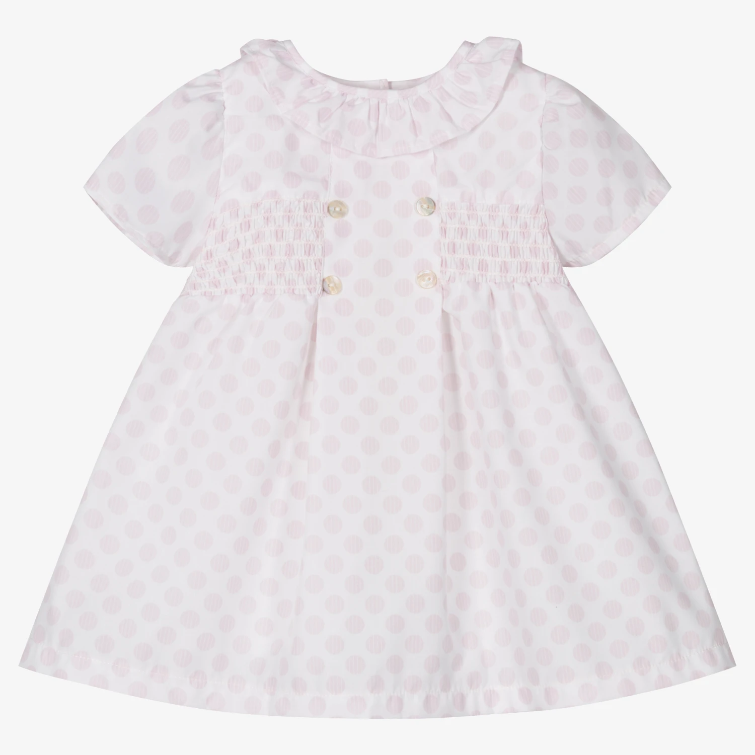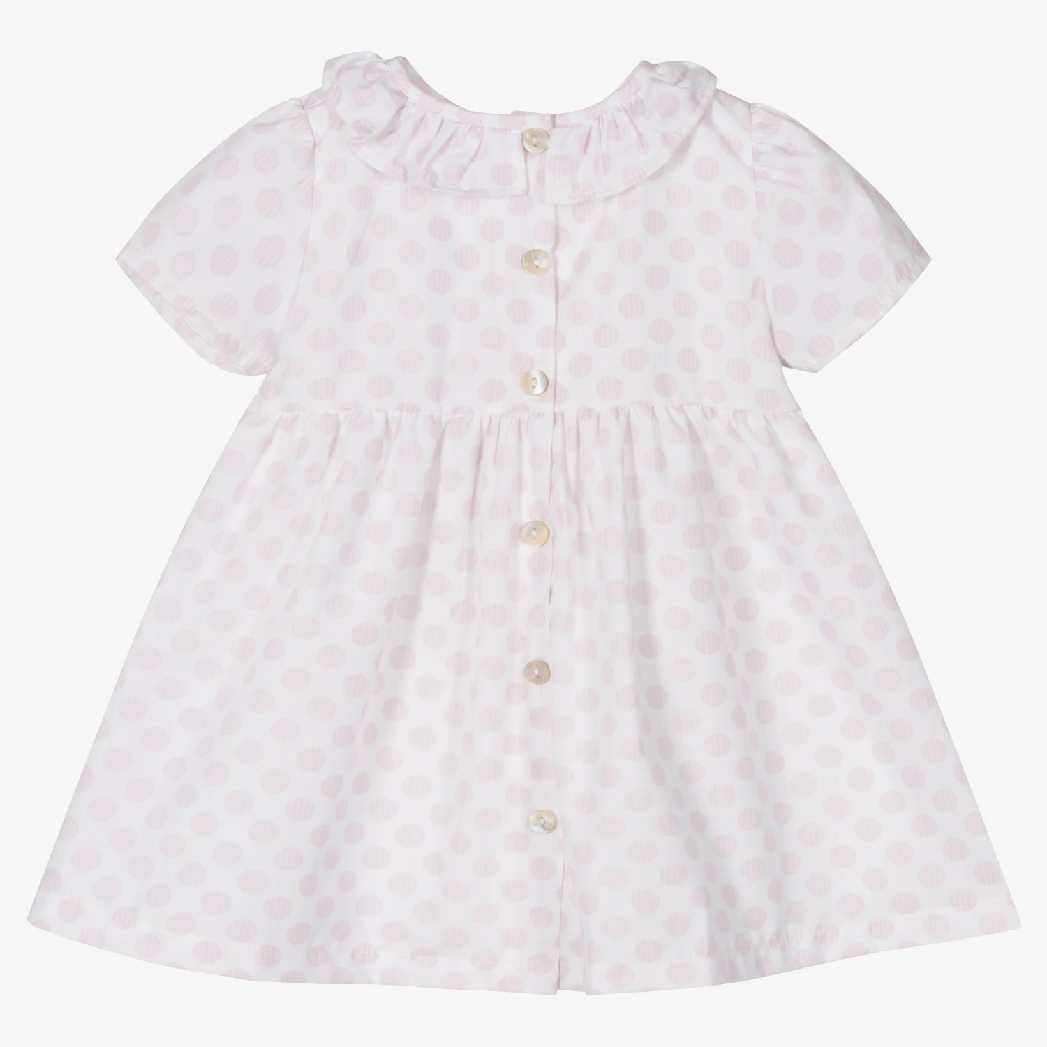 Delightful white dress for baby girls by designer Babidu, made in soft and lightweight cotton. This dainty dress has a beautiful pink spot design with subtle white vertical stripes. The stretchy shirred detailing, frilly collar and decorative pearlescent buttons on the front give this piece an elegant, whimsical feel. Classically styled, it has pearlescent buttons which fasten easily on the back. It is lined in breathable cotton voile for ultimate comfort.