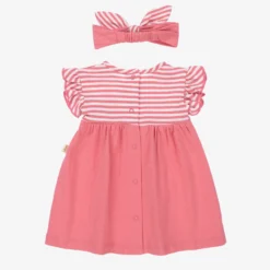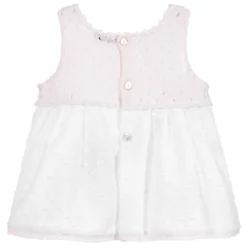 A cute yellow and white dress set for baby girls by Babidu, made in soft cotton jersey. The sleeveless top has a pretty ruffle collar and a keyhole popper fastening on the back. The striped pinafore dress fastens with traditional buttons on the shoulder straps.