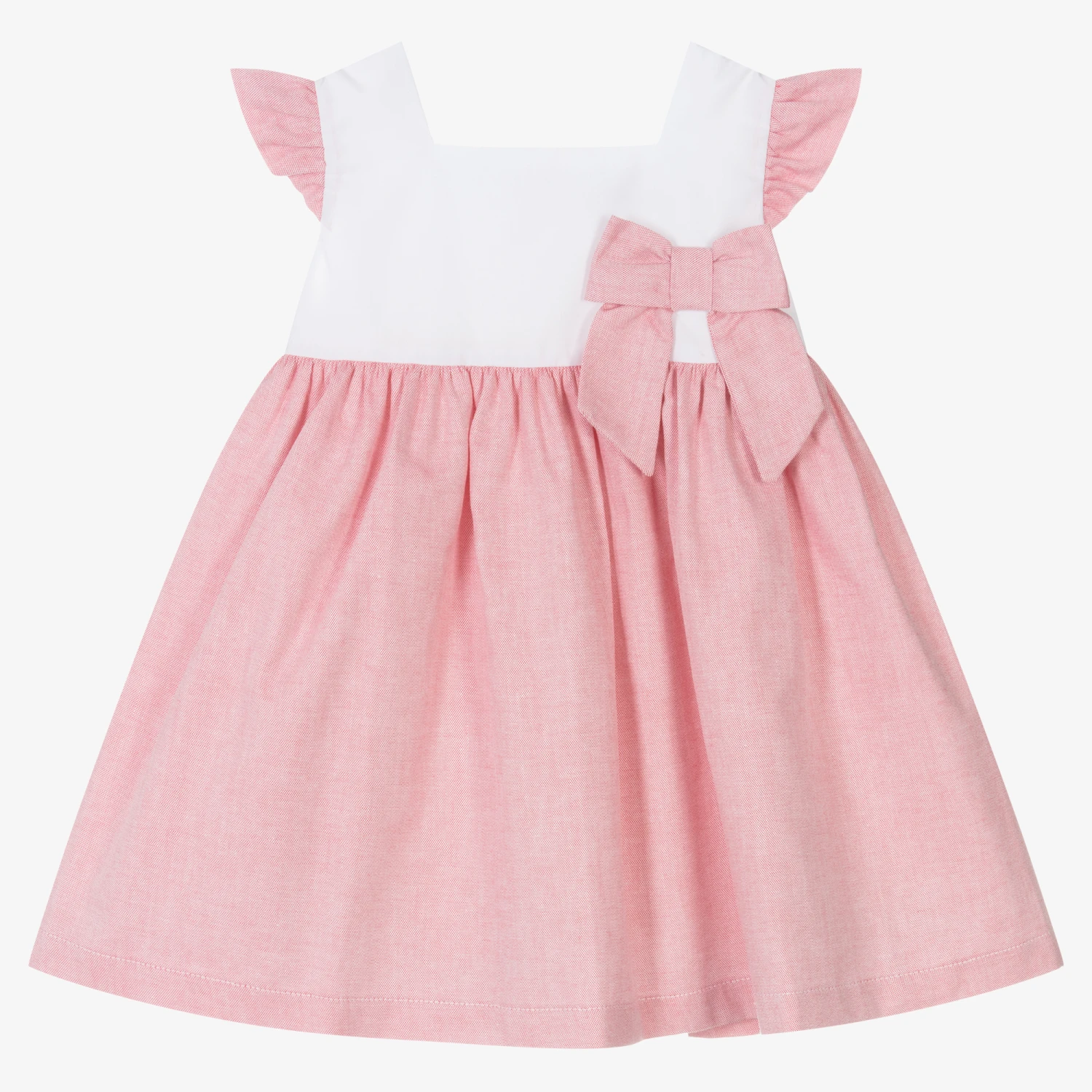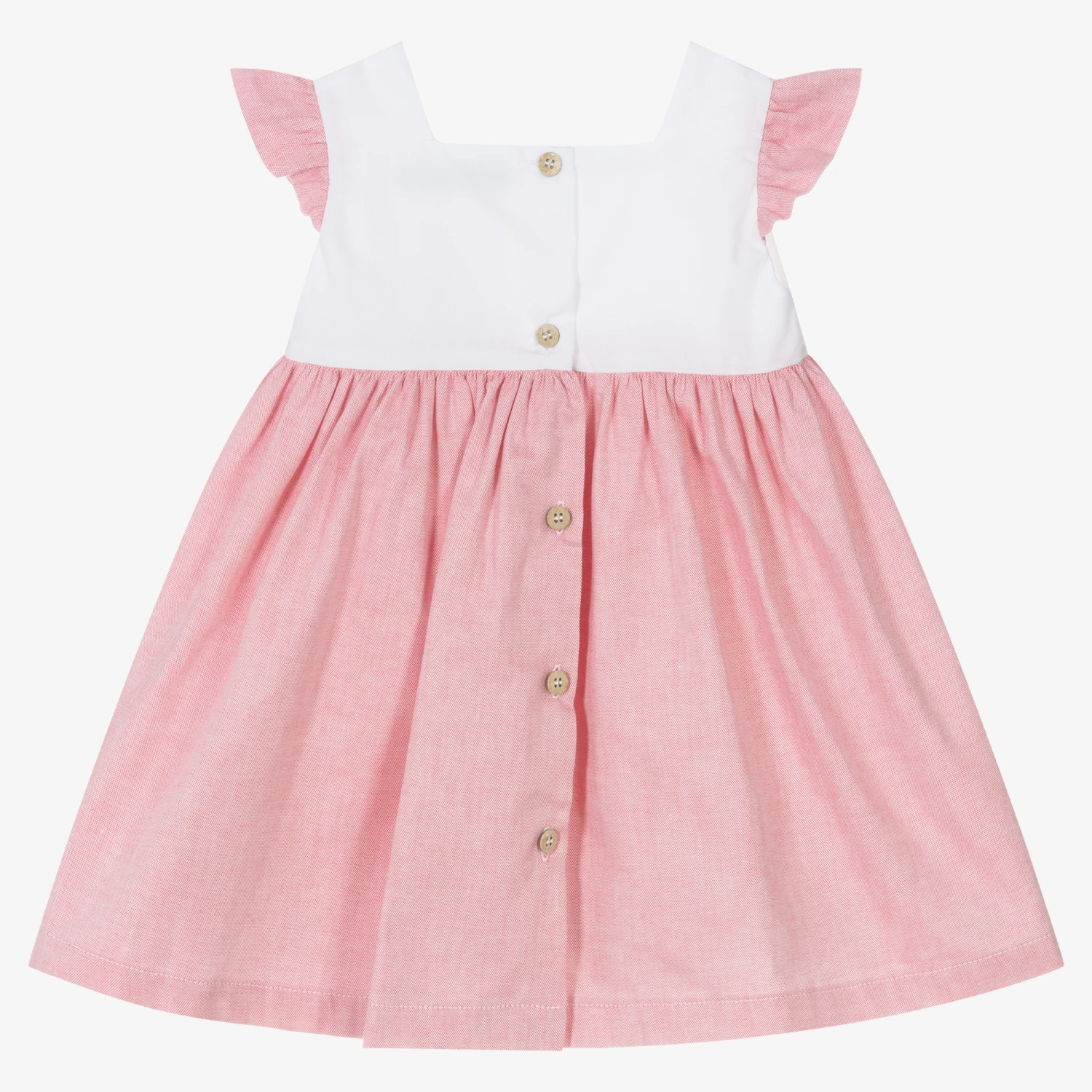 A sweet red and white dress for baby girls by Babidu, woven in soft Oxford cotton. It has pretty ruffles over the shoulders, with a fixed bow on the bodice. Lined in lightweight cotton voile for comfort, it fastens with traditional wooden buttons on the back.