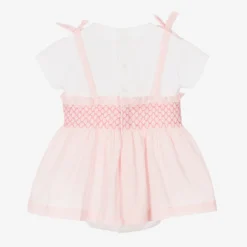 Baby girls red and white striped dress set by Babidu. Made in soft and lightweight organic cotton, this pretty design has a ruffle trim and bows on the shoulders. Fully lined in soft cotton, there are buttons on the back to fasten and a pair of matching knickers are included.