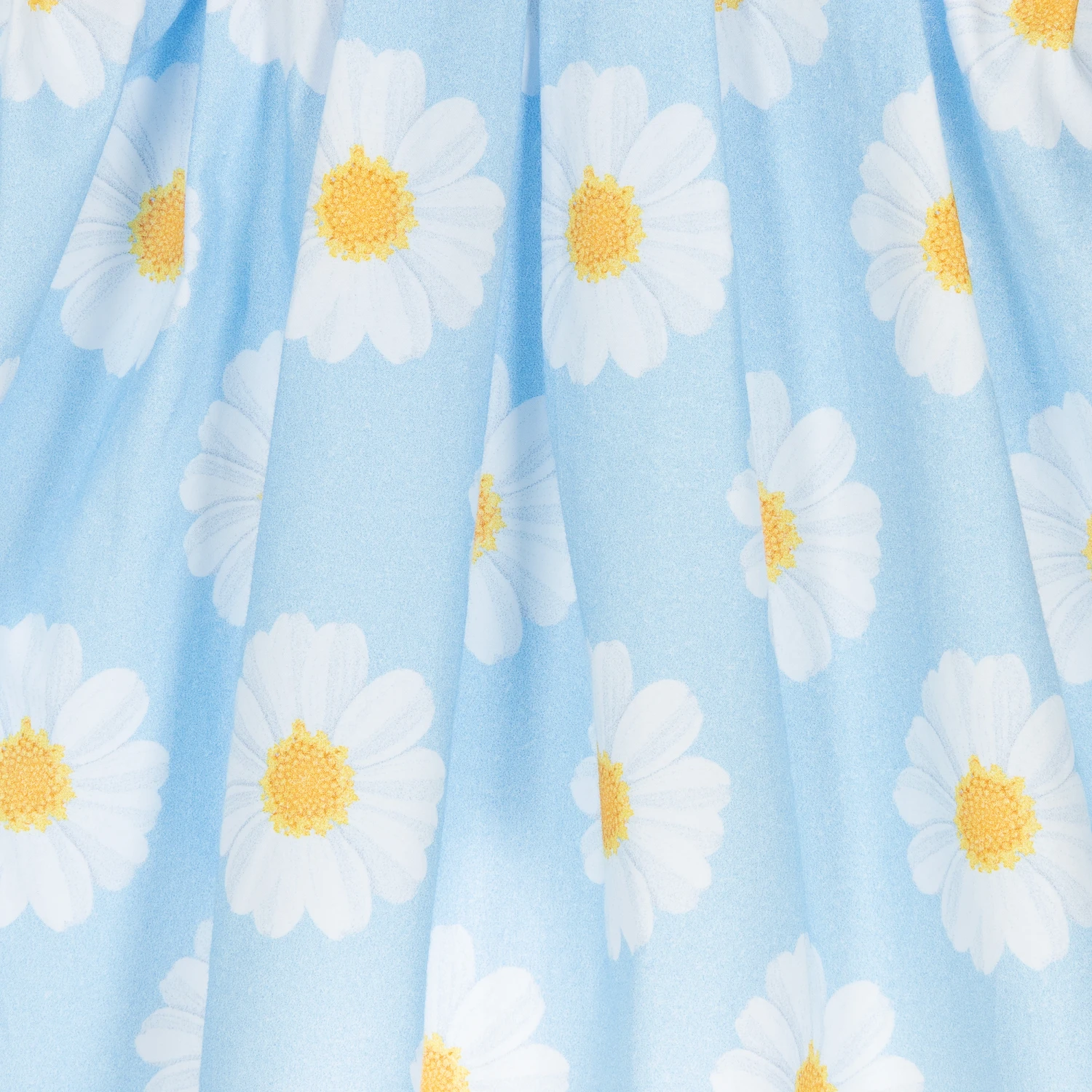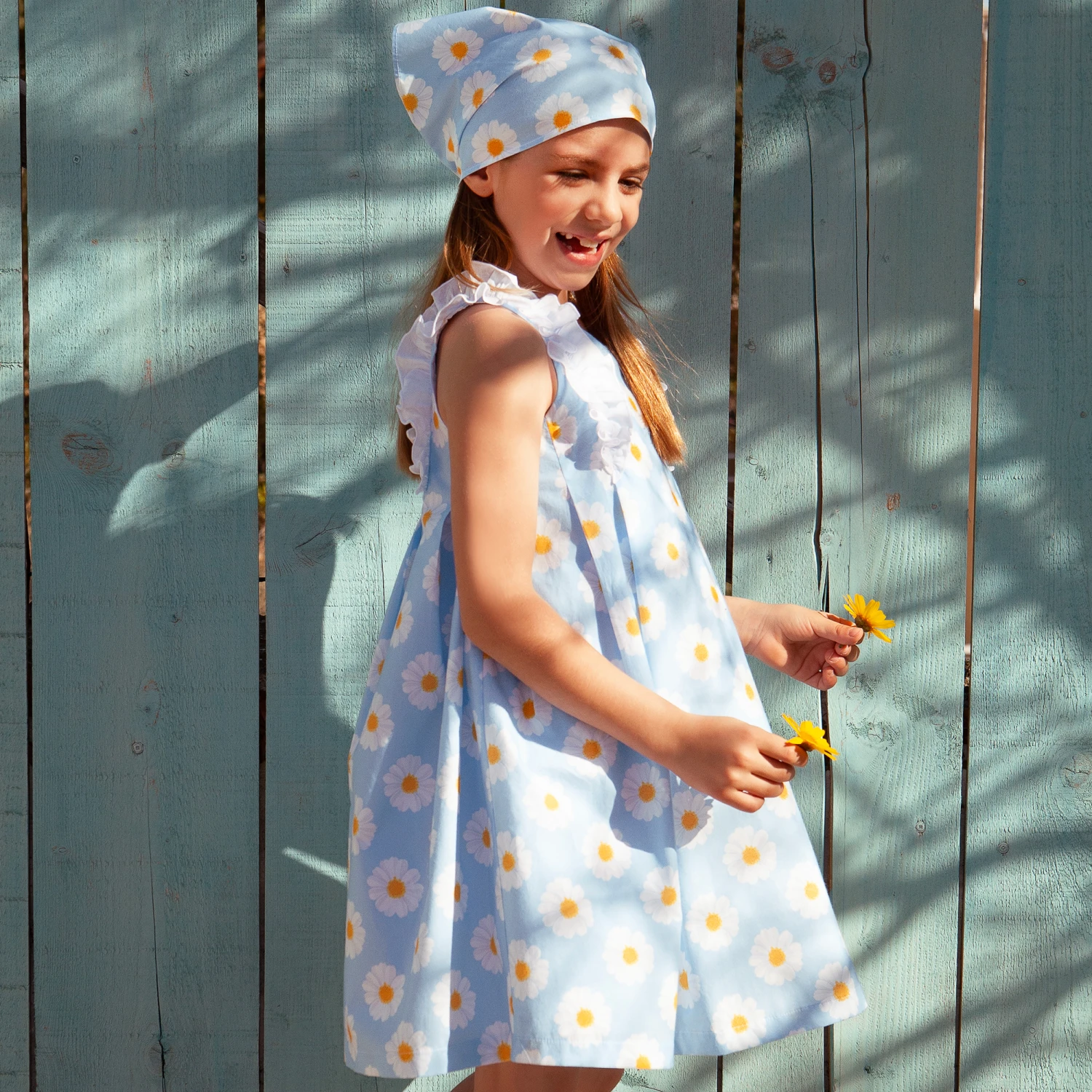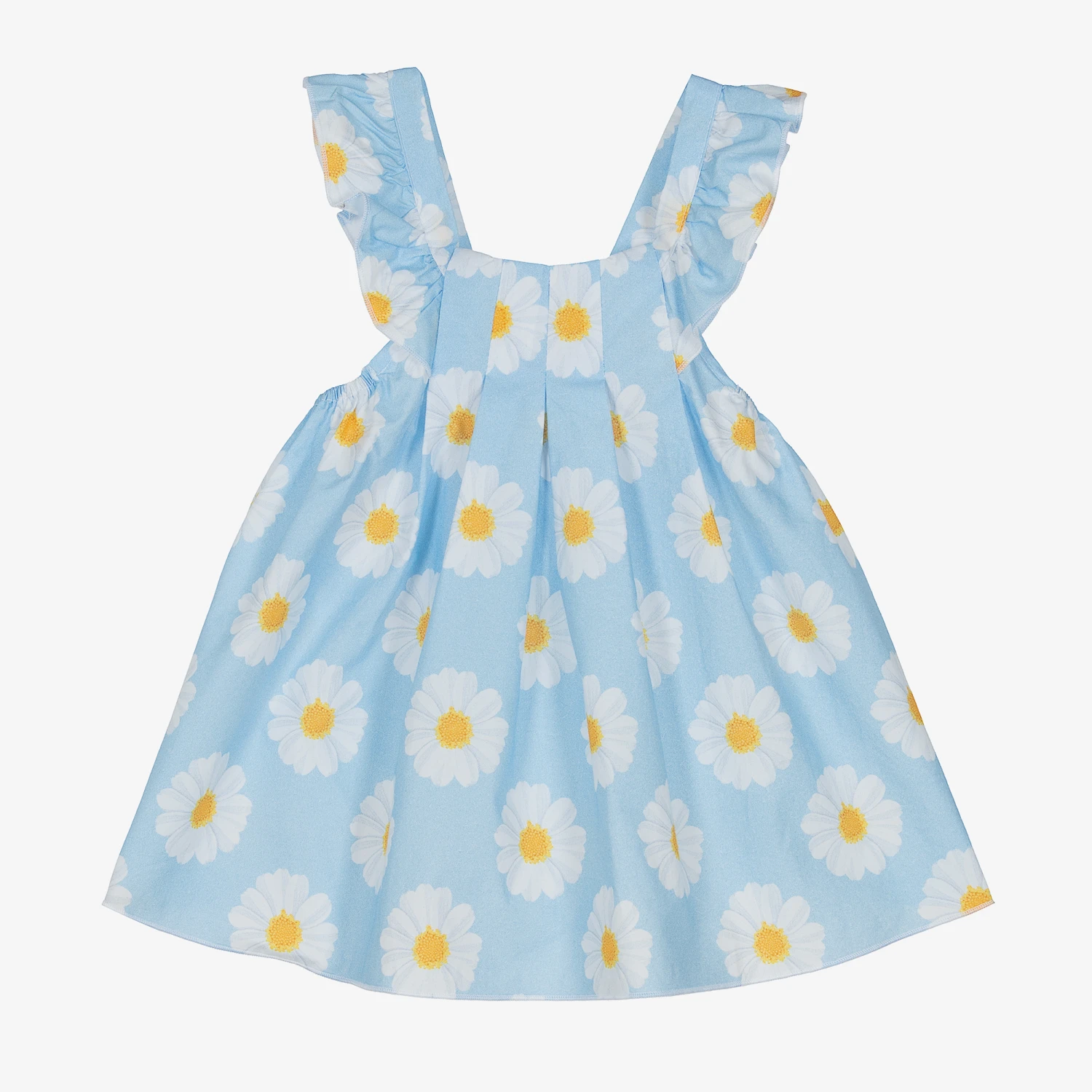 Patterned with an eye-catching white and yellow daisy print, this sky blue dress set for baby girls is by Balloon Chic. Made in lightweight cotton poplin, the dress is pleated from the neckline for a full flared shape and has pretty ruffles on the shoulder straps. It is comfortably elasticated on the waist, and ties at the back with a shaped curved hem that opens to reveal the matching ruffled bloomer shorts.
