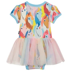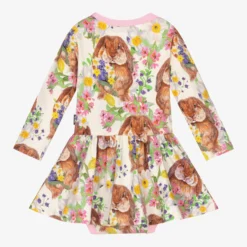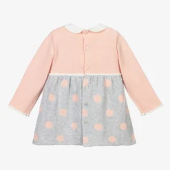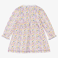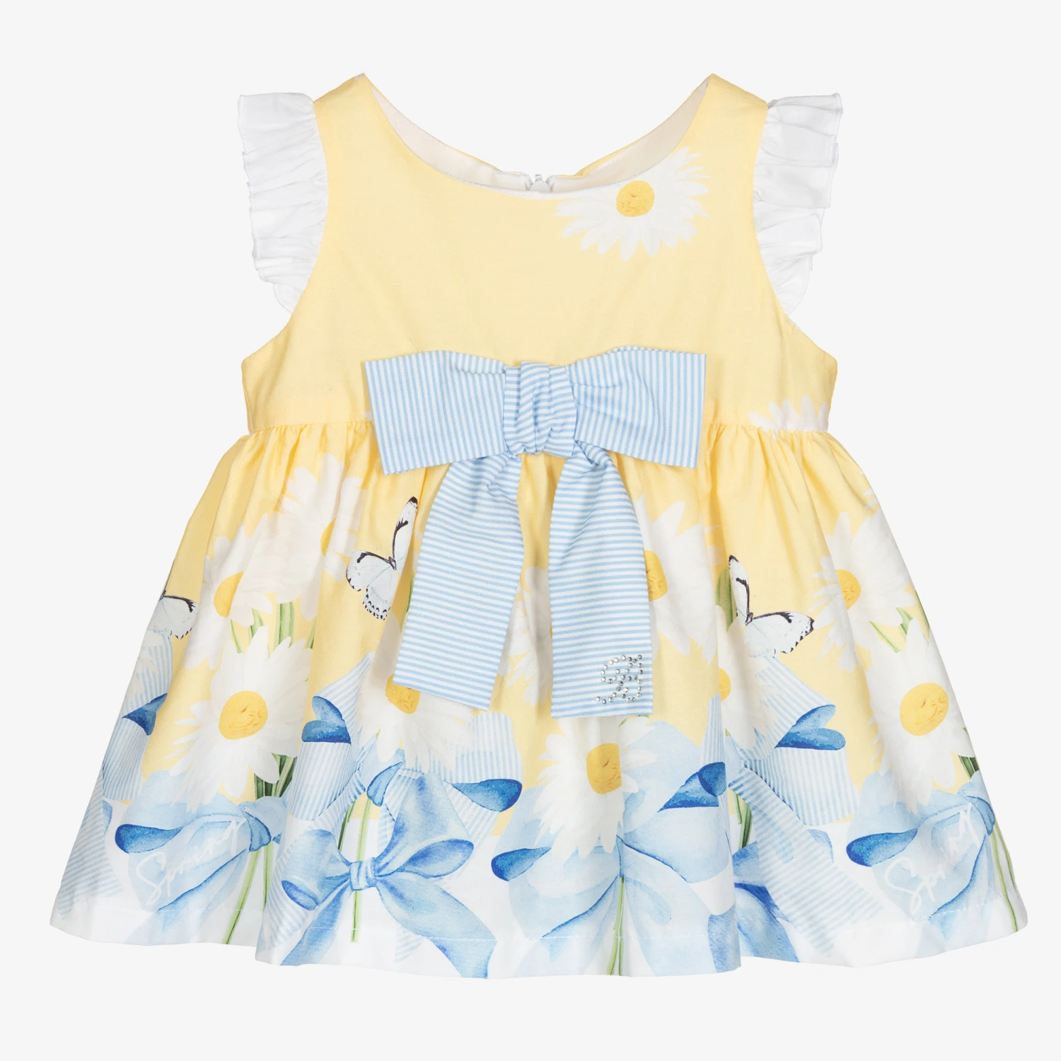 Adorable dress and bloomers set for baby girls by Balloon Chic, made in lightweight cotton poplin. Patterned with white daisies and blue bows, the dress has white flutter sleeves and a blue striped bow appliqué on the front. The matching striped bloomers have lovely ruffles all around and are gently elasticated for comfort.