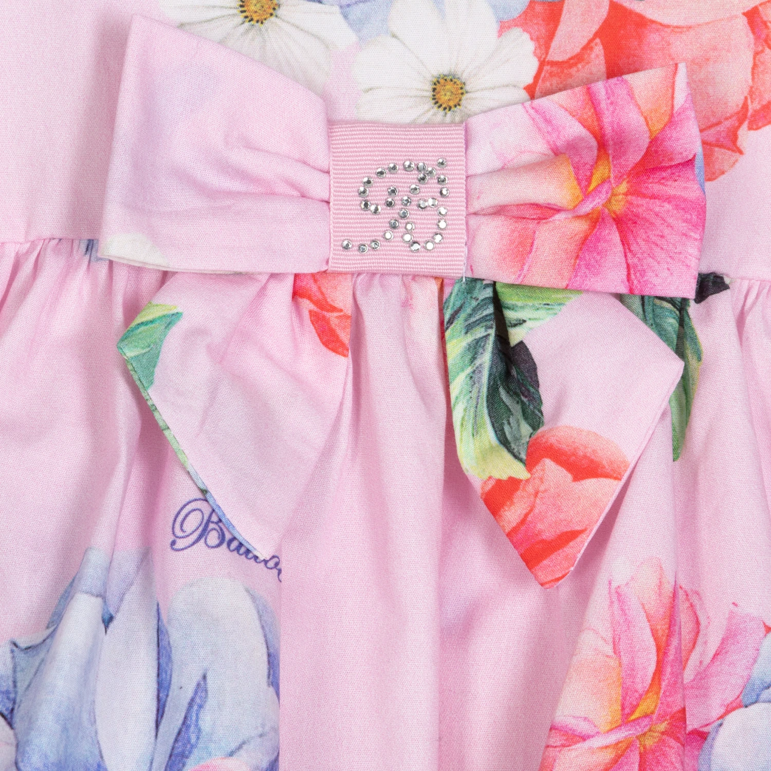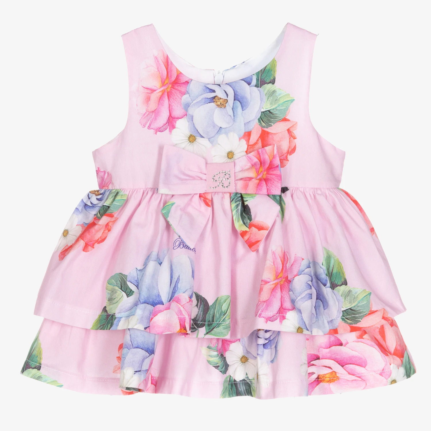 Pink dress and bloomers set for baby girls by Balloon Chic, with a pink, blue and green floral print. Made in lightweight cotton poplin, the dress has a bow with diamanté logo detail on the waistline and a pretty tiered and gathered skirt. The matching bloomers are gently elasticated for comfort.