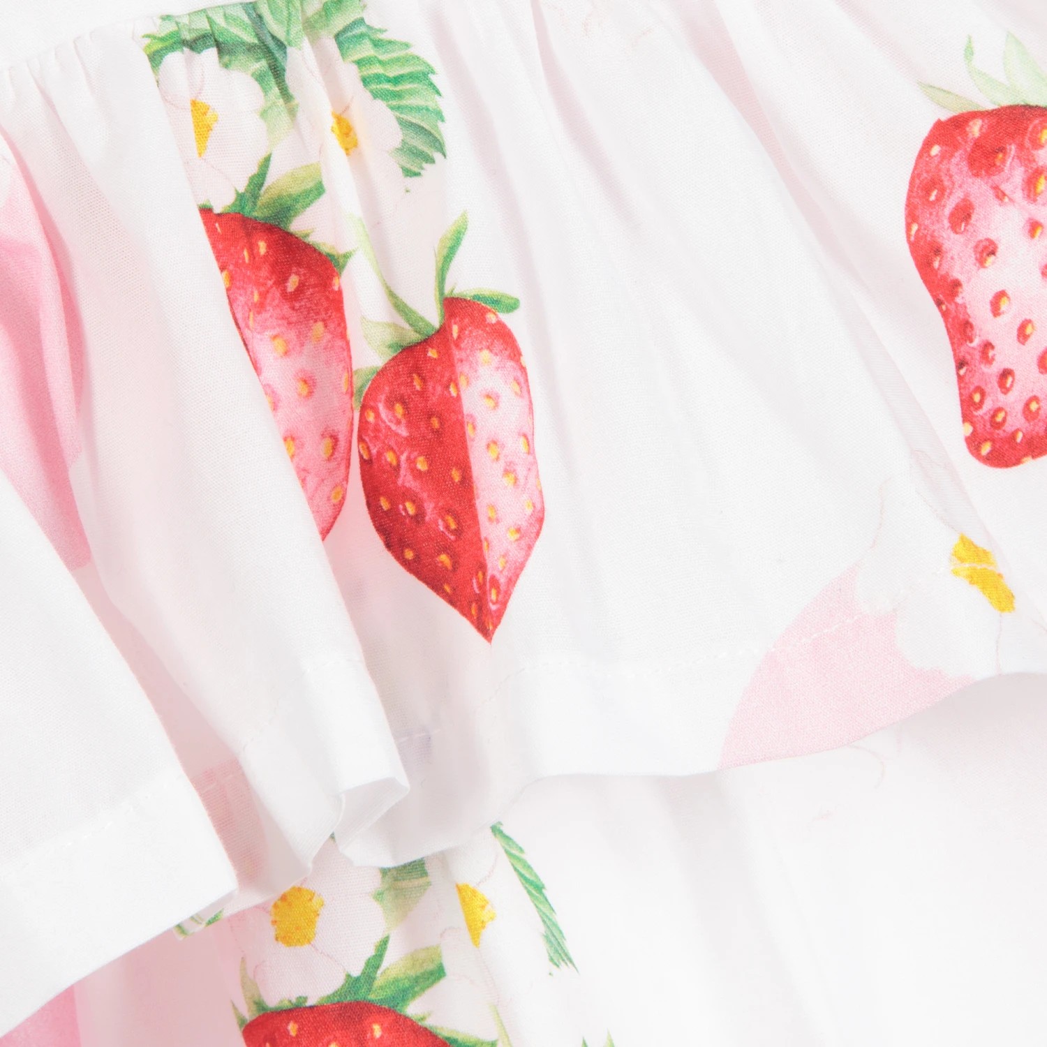 White dress set for baby girls by Balloon chic, made in soft, lightweight cotton poplin, with a bright red strawberry print. The tiered dress has ruffles on the shoulder straps and bow trims on the front. The matching bloomers have a large bow effect detail on the back, with a gently elasticated waistband and leg openings