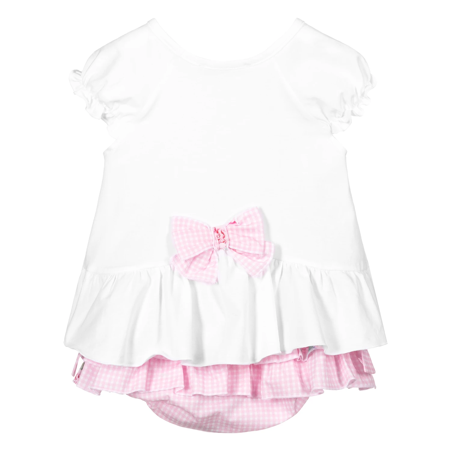 Sweet dress set for baby girls by Balloon Chic. The comfortable white cotton jersey dress has a sparkling print of love birds on the front. The cuffs are gently elasticated and there is a frill around the back of the hem with a pink gingham bow. It comes with matching floral gingham bloomers that have bows and ruffles.