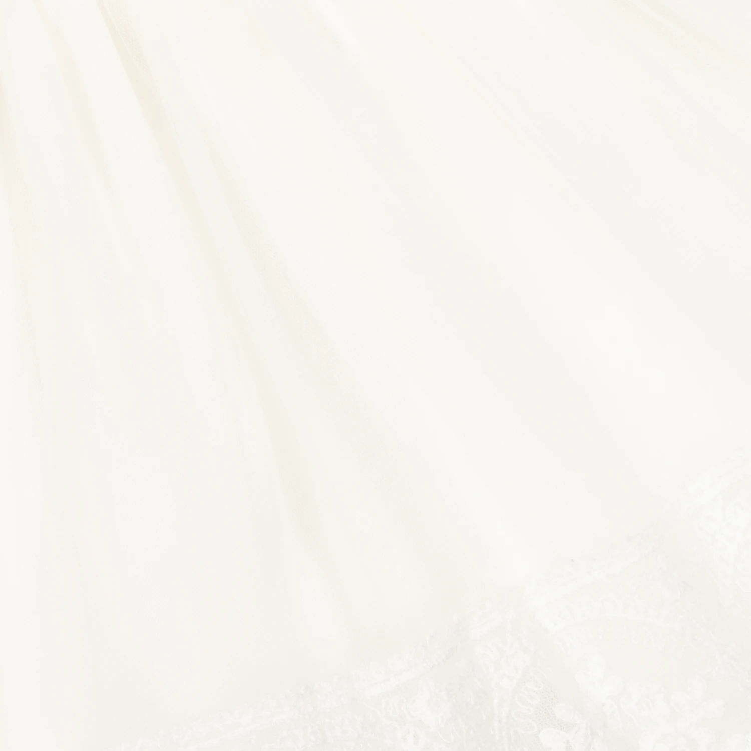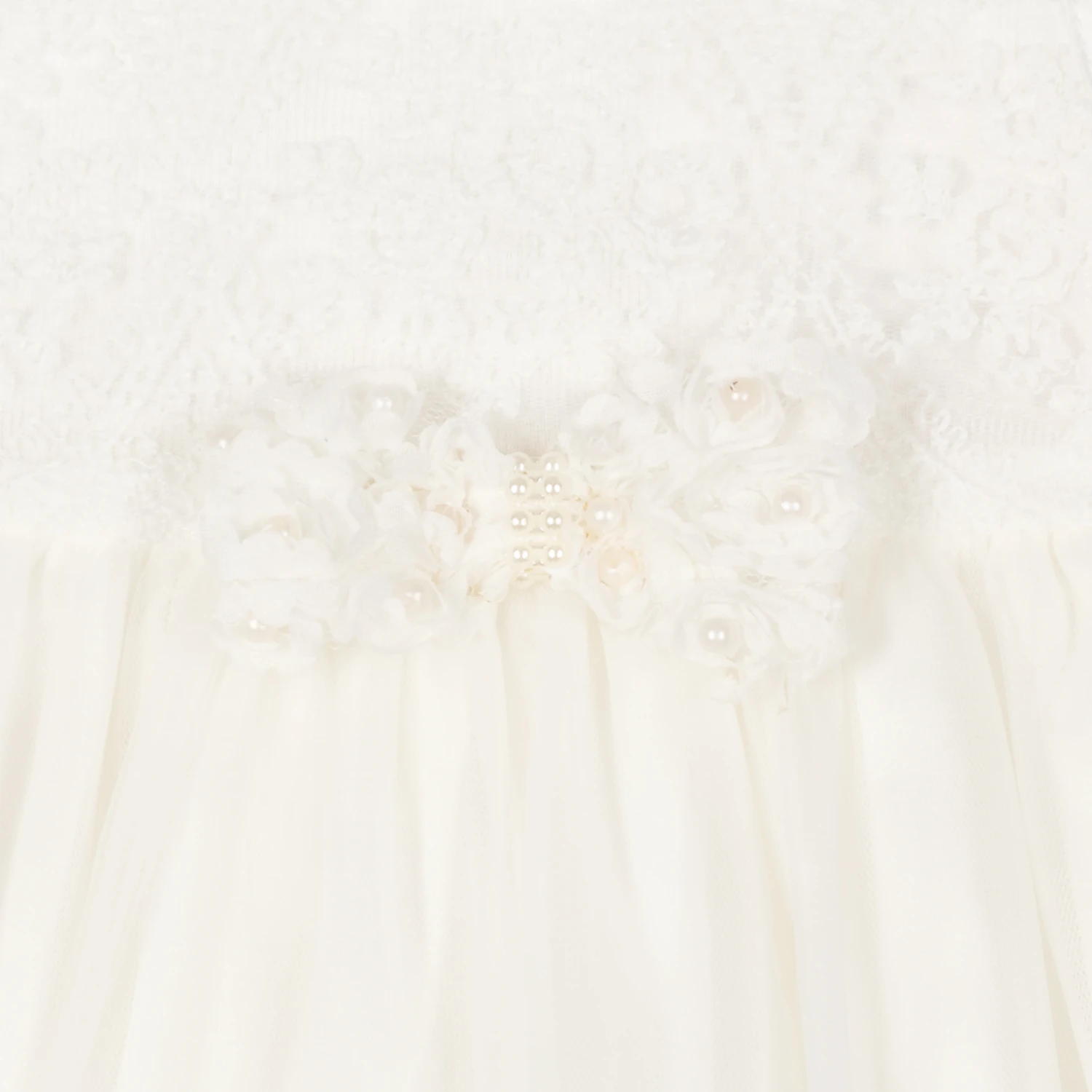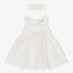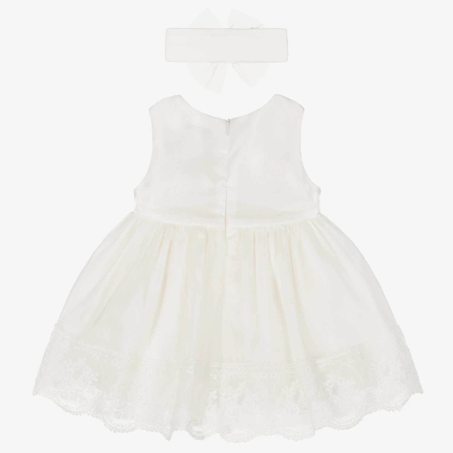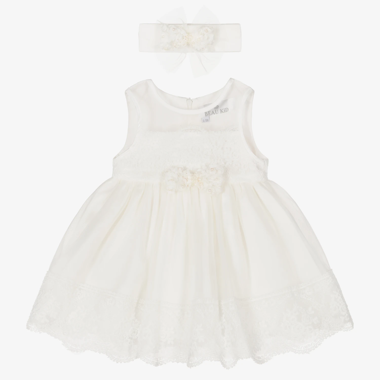 Gorgeous ivory special occasion dress and headband set for baby girls by Beau KiD. Made in soft fine tulle, it is detailed with pretty embroidered trim on the bodice and around the hem. The full gathered skirt has underlayers of tulle and satin for added volume and the back of the bodice is made in satin dupion, with a concealed zip fastening. Both the dress and headband are finished beautifully with floral chiffon bows, scattered with ivory pearls.