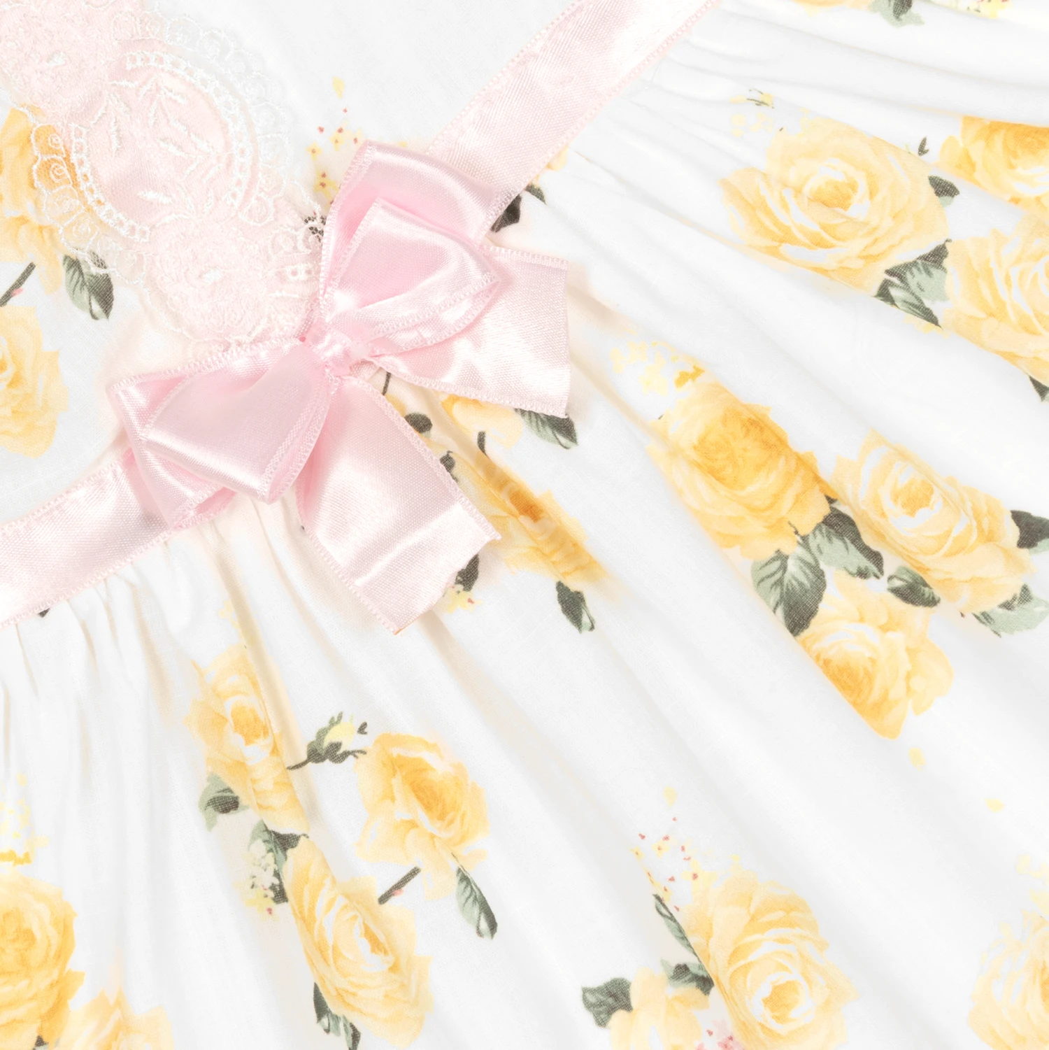 Baby girls white and yellow dress set by Beau KiD, made in soft and lightweight cotton for a gentle feel. Patterned in a yellow roses print, this sweet, lined dress has ruffle sleeves and a pink satin bow on the waistline. The chest is detailed with delicate lace sewn on a vertical pink ribbon for a pretty touch. The set includes a stretchy headband topped with a matching pink bow to tie the look together.