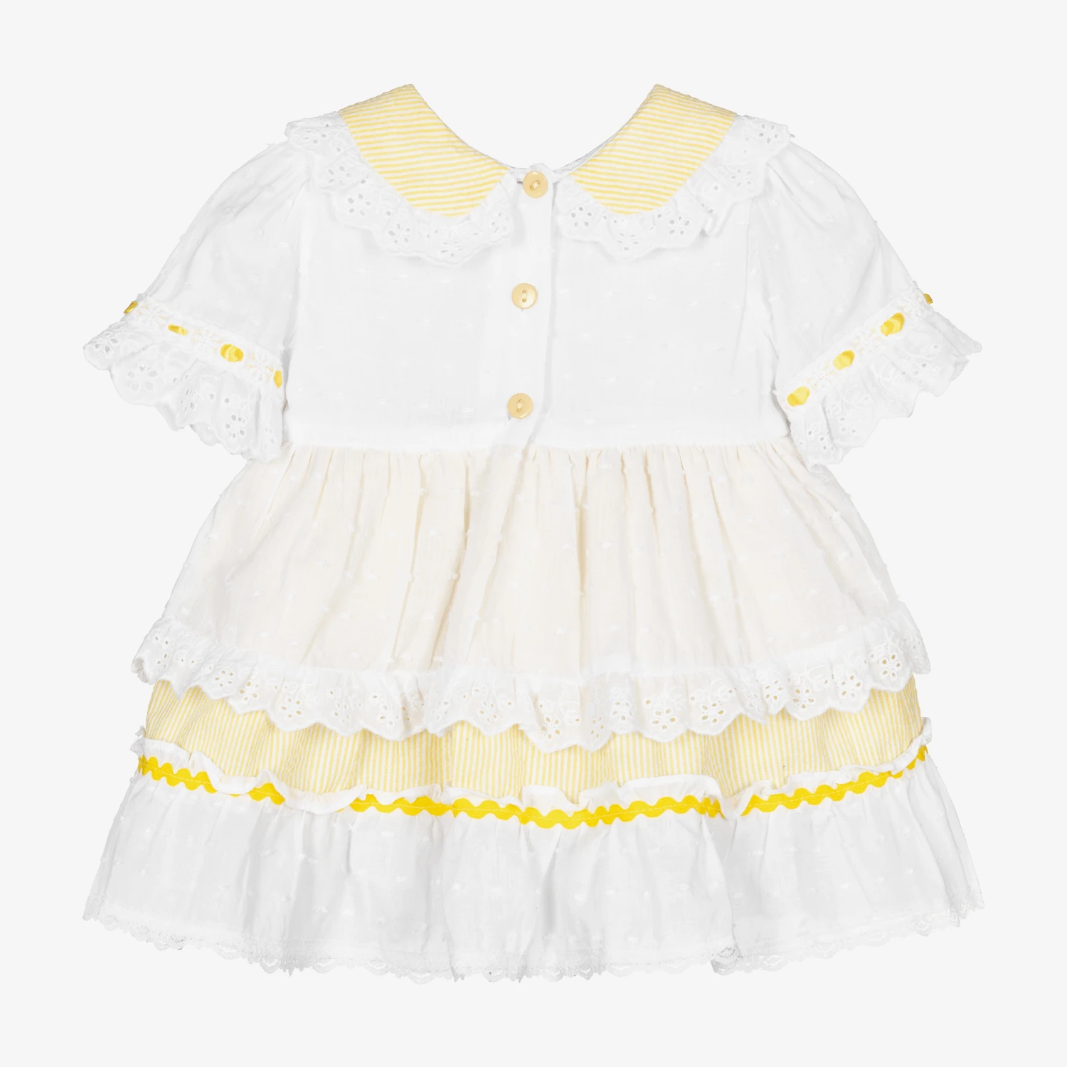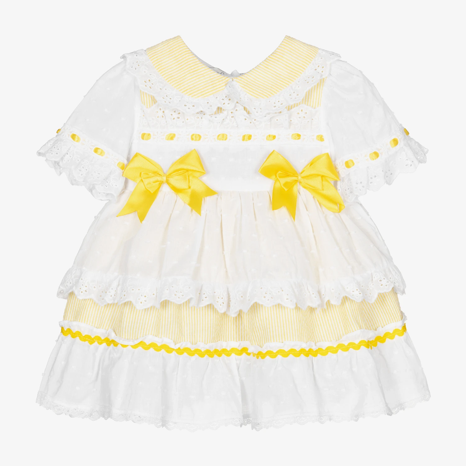 Pretty yellow and white striped dress for baby girls by Beau KiD, made in lightweight cotton seersucker with yellow satin bows. Trimmed in lace, it has a white plumetis voile overlay on the bodice, with a matching hemline and sleeves.