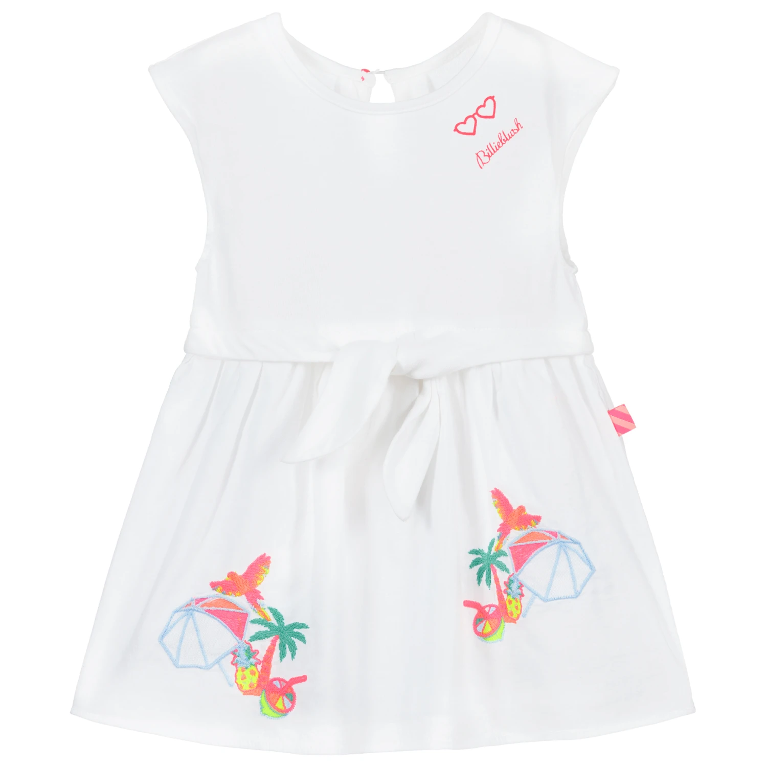 White cotton sleeveless dress for baby girls by Billieblush. The soft jersey top has a neon pink logo print, tie front detail on the waist, and keyhole button fastening on the back. The gathered skirt is made and lined in lightweight cotton with tropical embroideries in colourful neon thread.