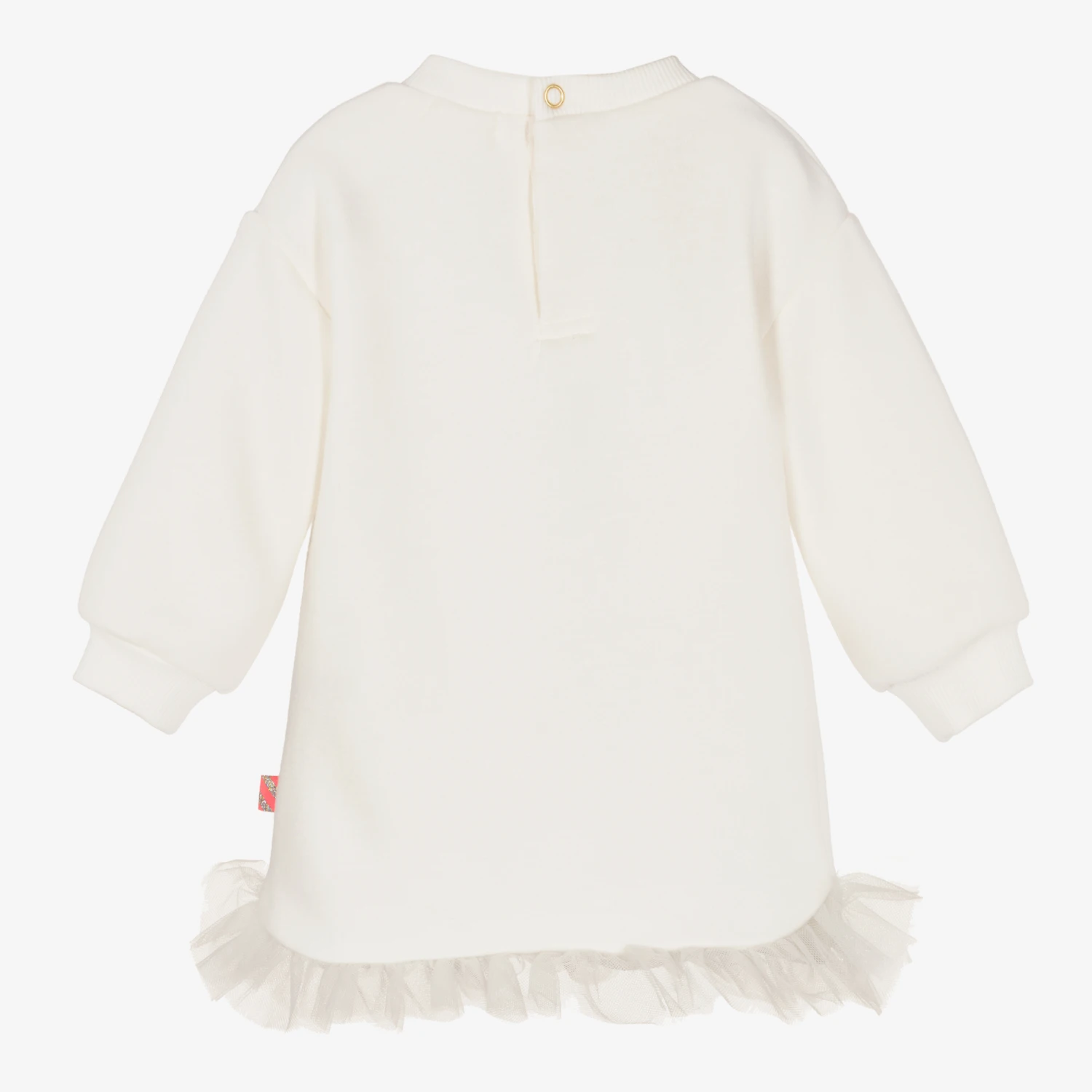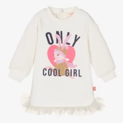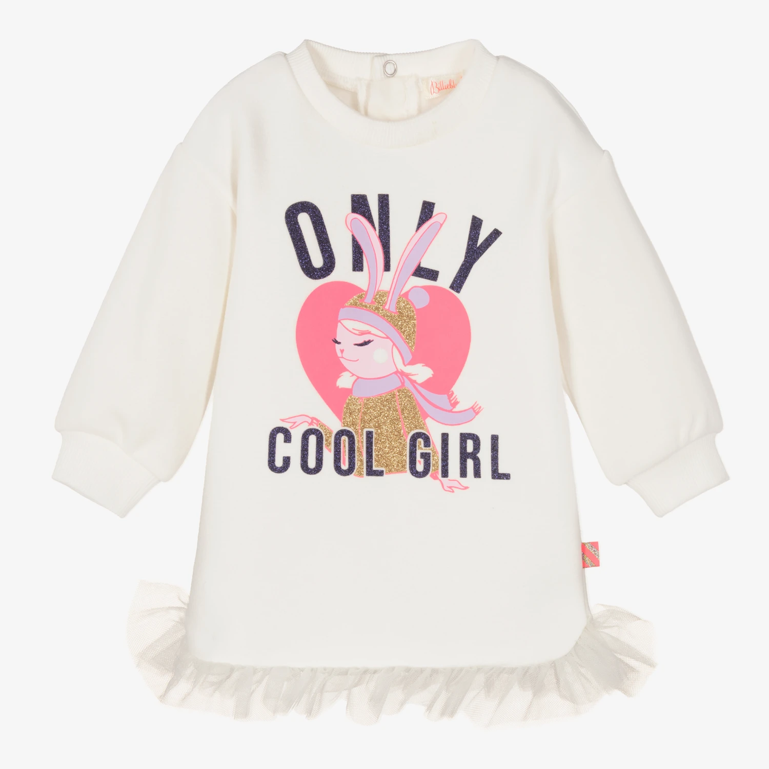 Ivory sweatshirt dress for little girls by Billieblush. Made in soft and stretchy mid-weight jersey, there is a cute bunny rabbit and heart print on the front, in neon pink, gold glitter and lilac purple. This comfortable dress has navy blue glitter lettering, a tulle hem and popper fastenings on the back.